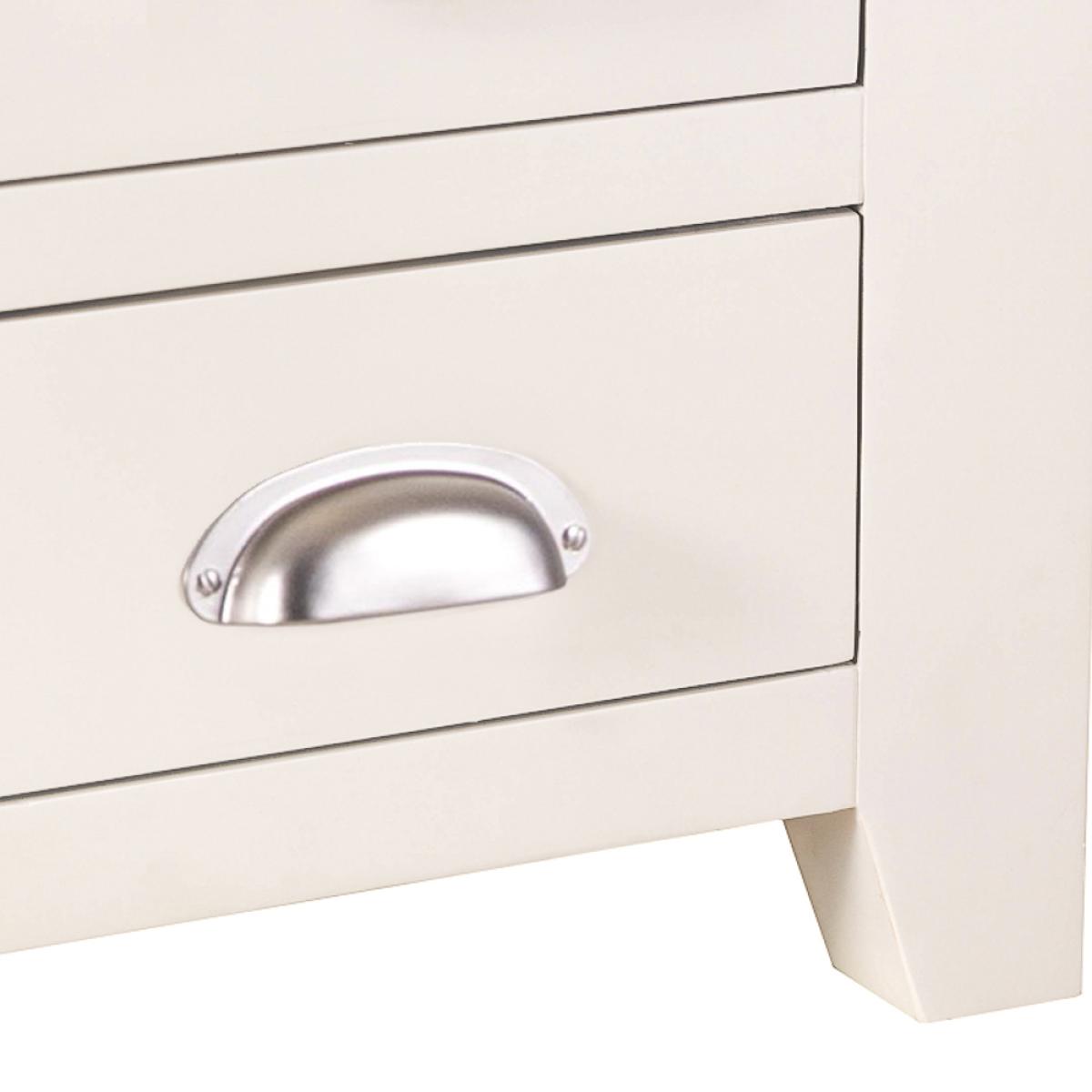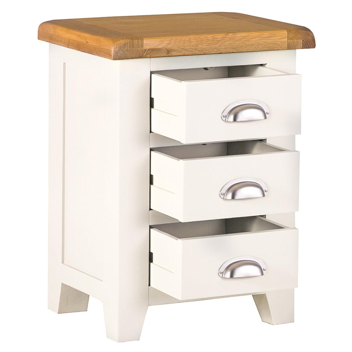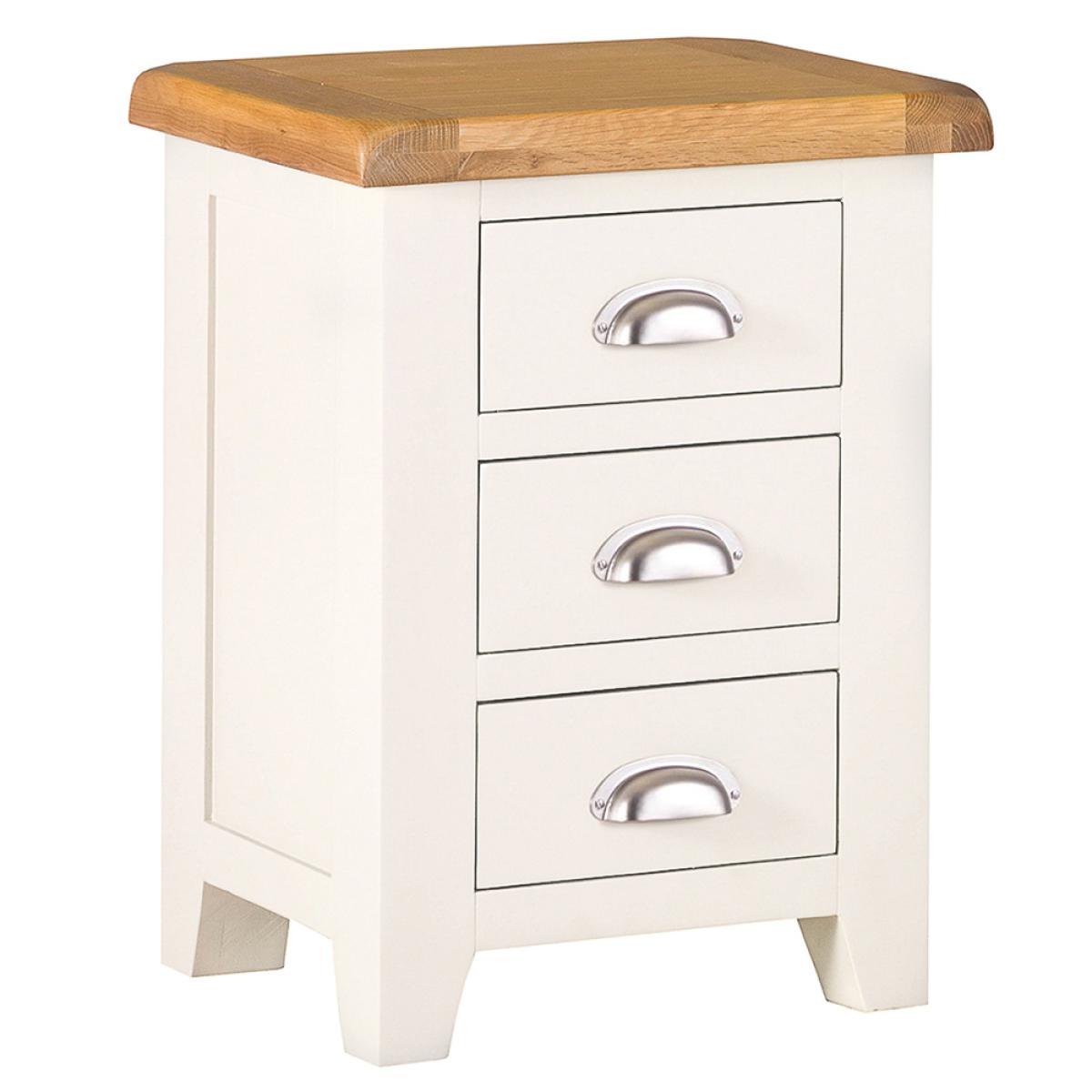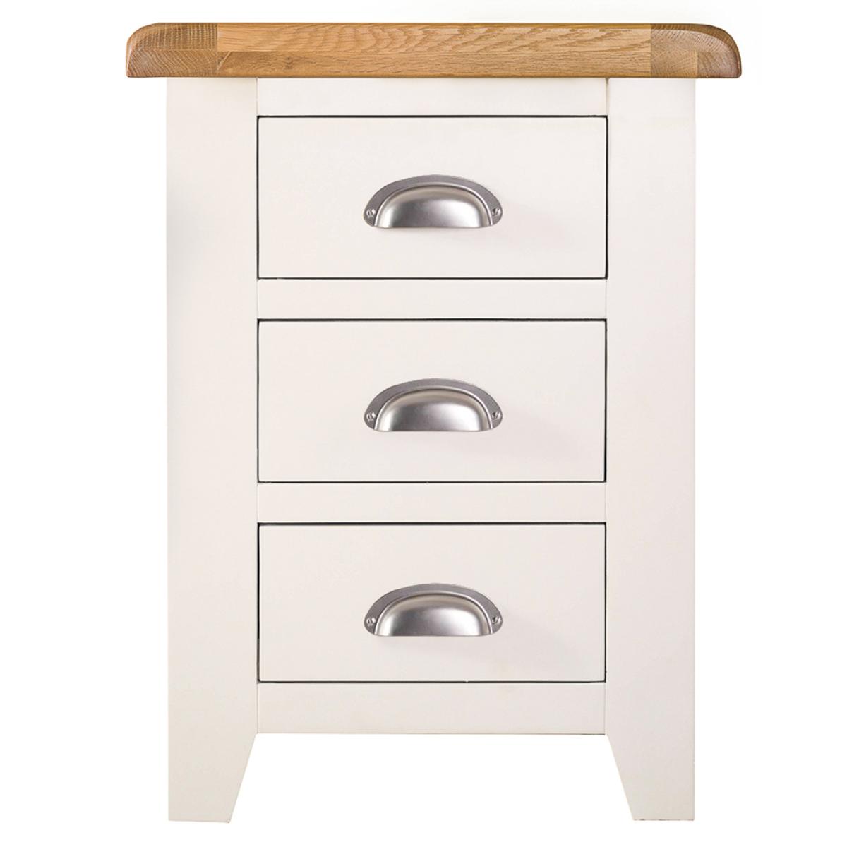 Treating yourself to the finest painted oak furniture money can buy is all about taking a closer look at the Hampshire Ivory Painted Oak Large 3 Drawer Bedside Table. This is a true statement piece that catches the eye from the moment you walk in the room —just what you need to create the homely, cosy look you’ve been working on all these years. The chunky frame is brought to life by the ivory painted finish, whilst the thick oak top has the rustic meets country quality only artisan pieces have. The Bedside Cabinet is then finished in style by the metal cupped handles that take pride of place on each of the dovetailed drawers.