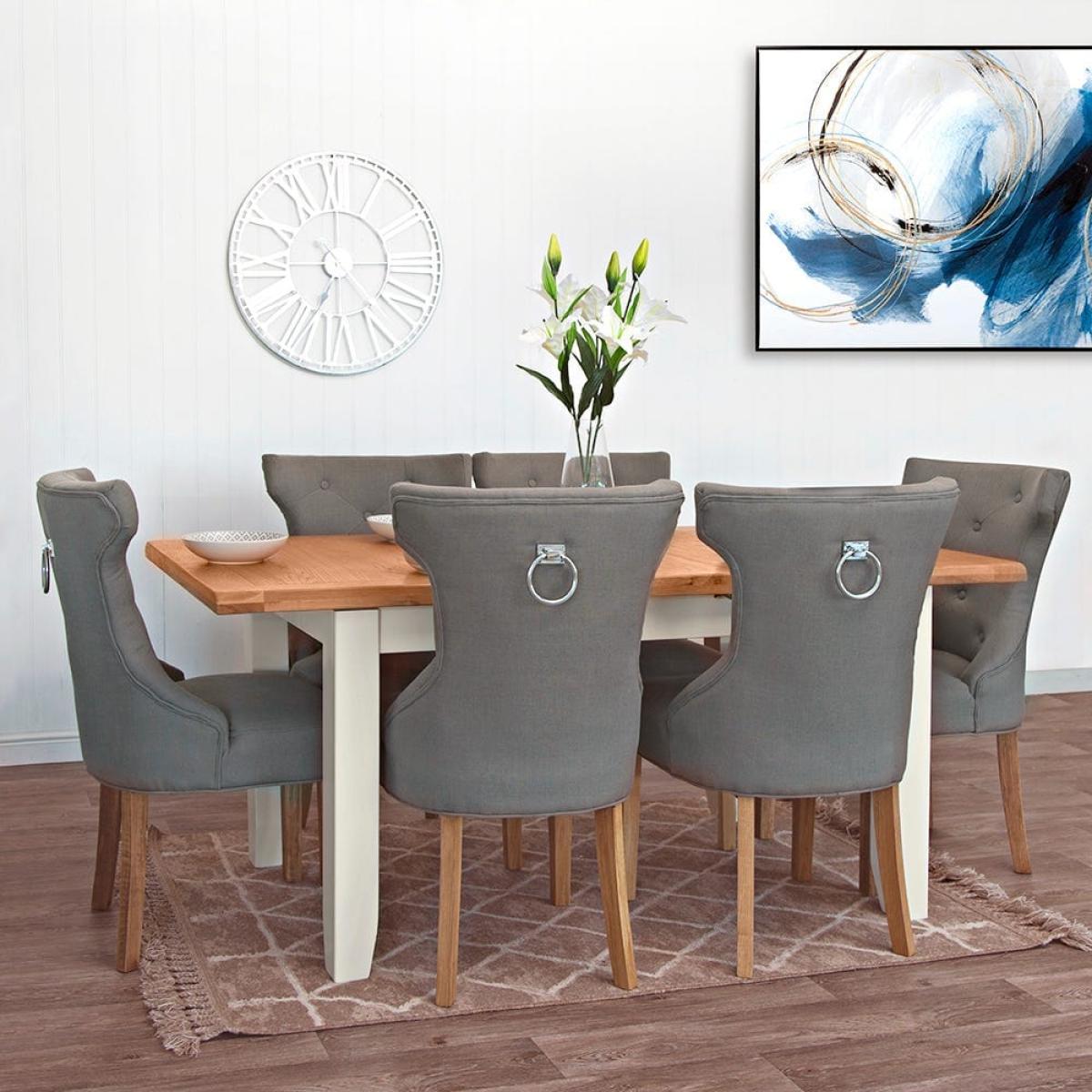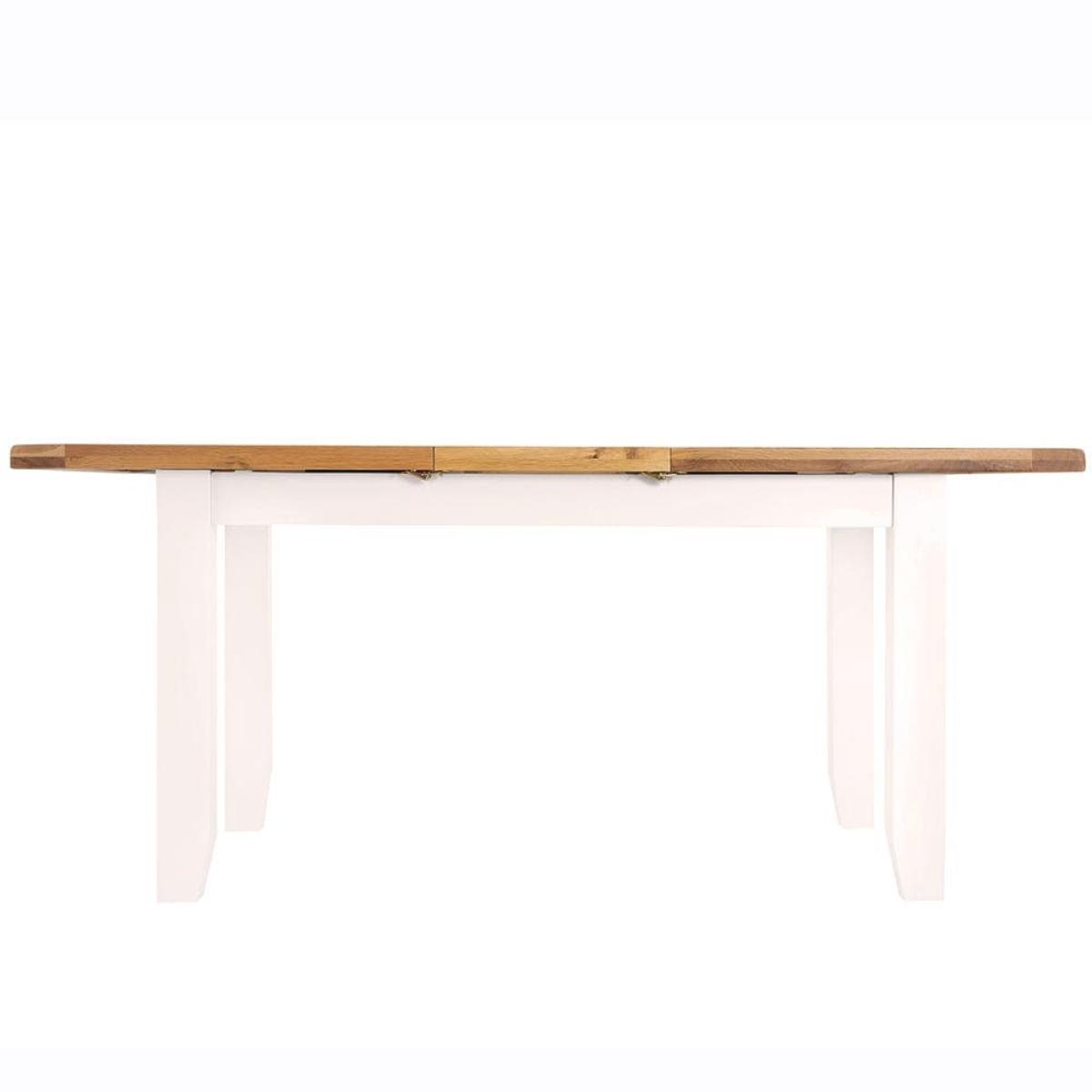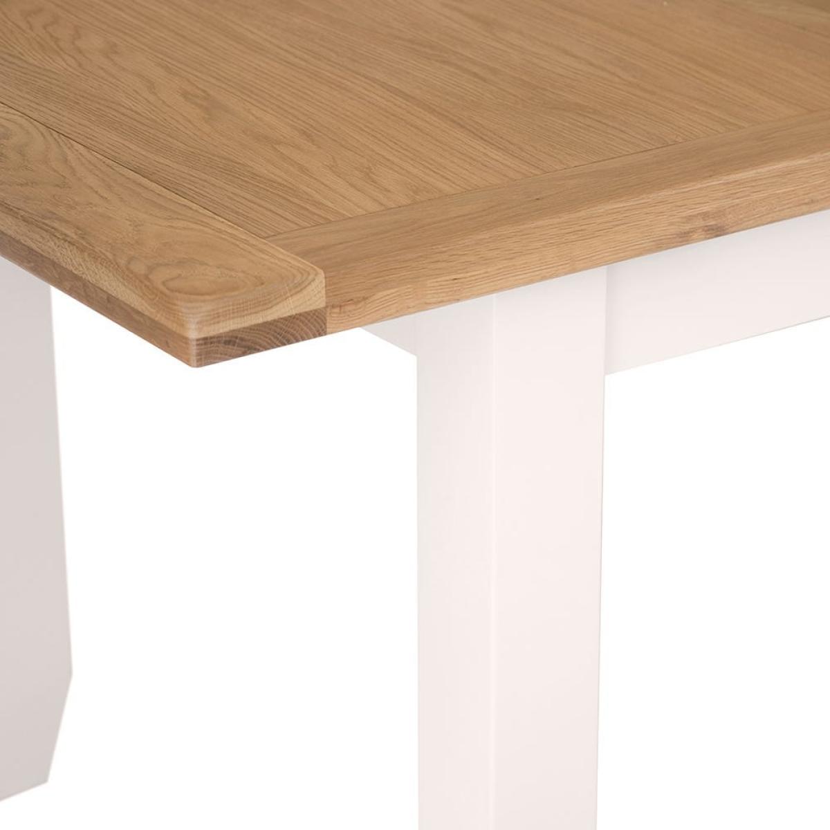 This super-smart Hampshire ivory painted oak medium extending dining table increases from 140cm to a spacious 180cm so you can seat up to eight guests in comfort. The creamy hue of our ivory paintwork draws a classy contrast with the oak top, setting an inviting scene at breakfast, lunch and dinner. Gently tapered legs, plus rounded corners on the top, bring a stylish finish. Roll out your signature roast or experiment with an all-new menu knowing that this generous table is bound to impress your guests. Choose matching dining chairs or browse our other collections for complementary styles.