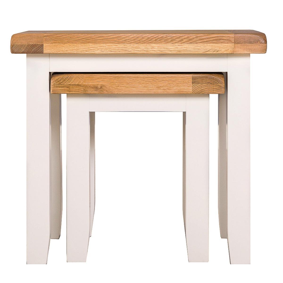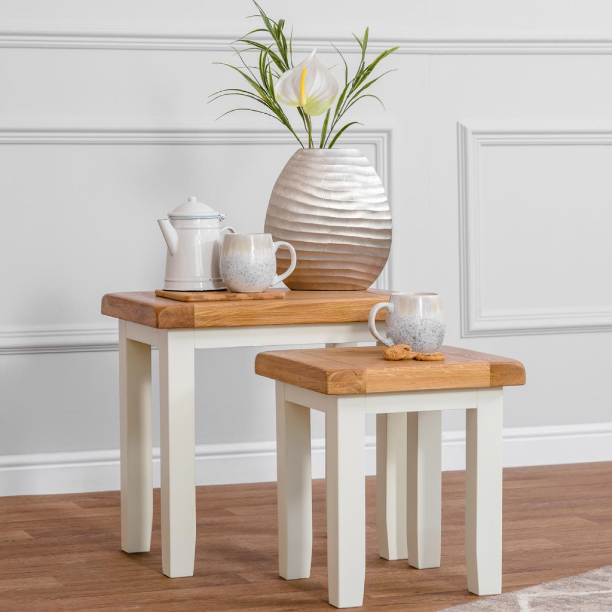 Side Tables are the secret ingredient which allows you to create the homely atmosphere you’ve been striving for. With the Hampshire Ivory Painted Oak Nest of Tables taking pride of place along one wall of the living room you’ll be able to add something casual and stylish with the click of the button. Each table arrives fully assembled and ready to use, meaning you can find the perfect spot for them the moment they arrive. All you need to do now is find the perfect complimentary pieces for the thick oak top and ivory painted finish.