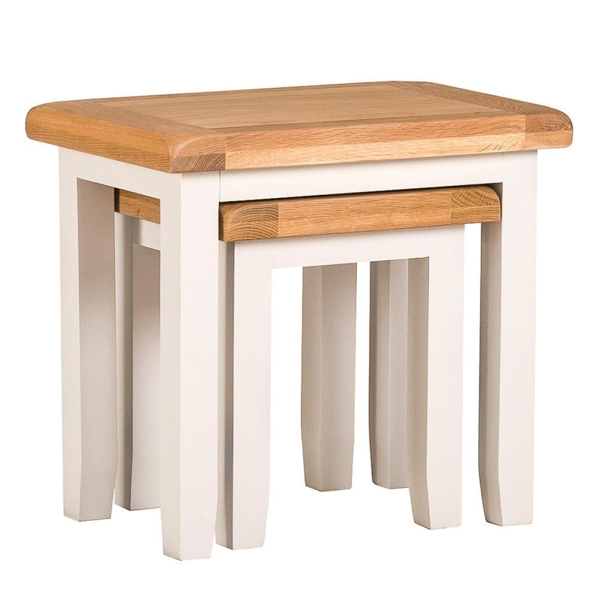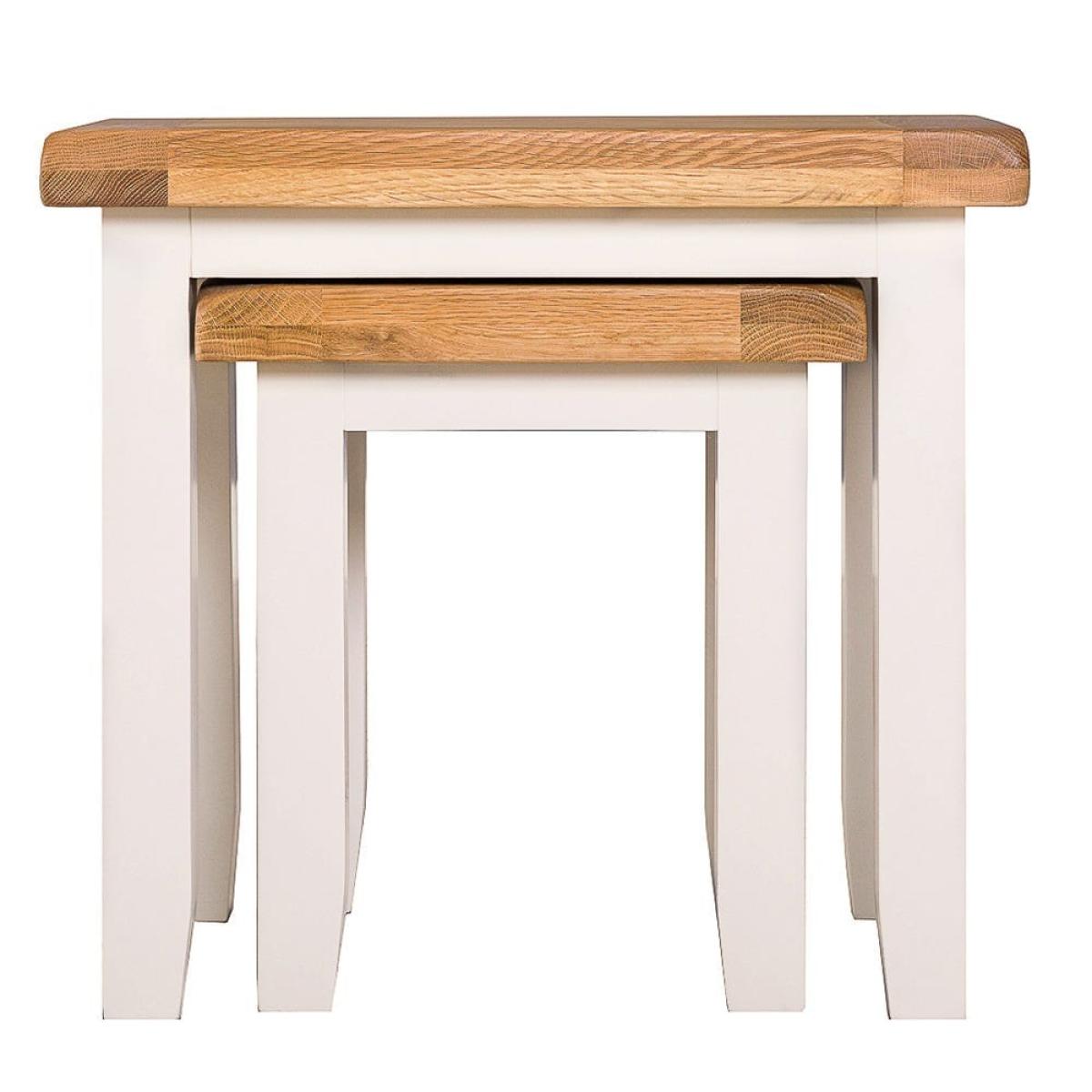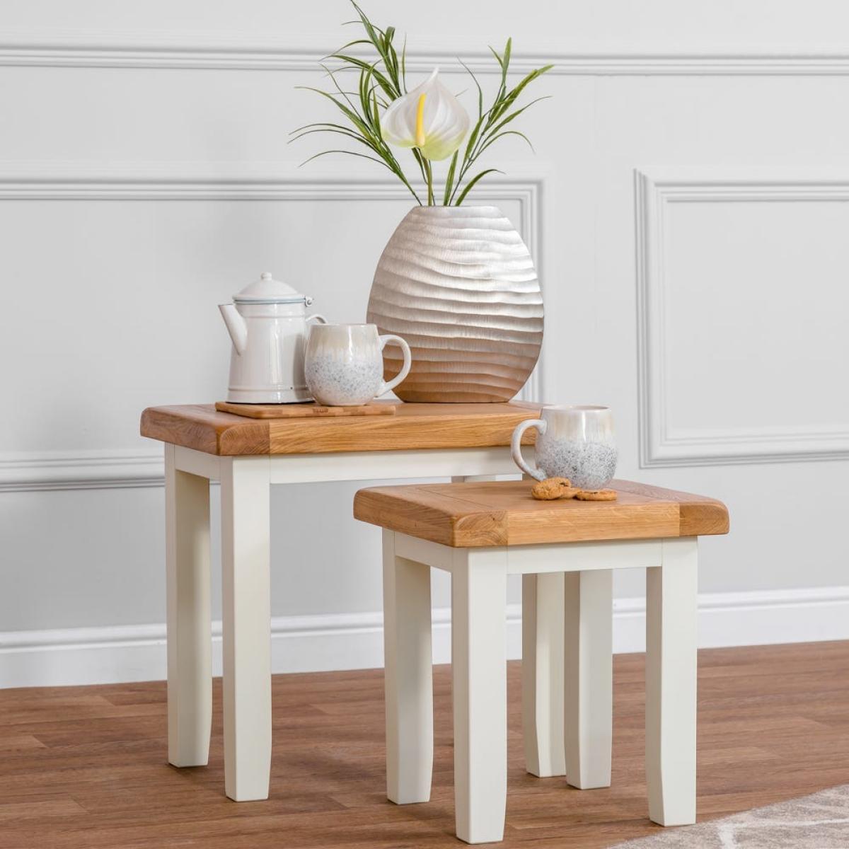 And for its next trick … This Hampshire ivory painted oak nest of 2 tables is a space-saving illusionist, doubling up into a pair of handy side tables when you’re hosting guests. Position them side by side to serve up a traditional afternoon tea, or keep them separate to hold drinks and nibbles at a dinner party. They slot neatly back together when the entertaining’s over. The elegant ivory colour of the frame and legs enhances any space, while the oak top adds an informal feel. Gentle tapering brings that all-important finer detail, and with no assembly required, you simply need to decide where it goes.
