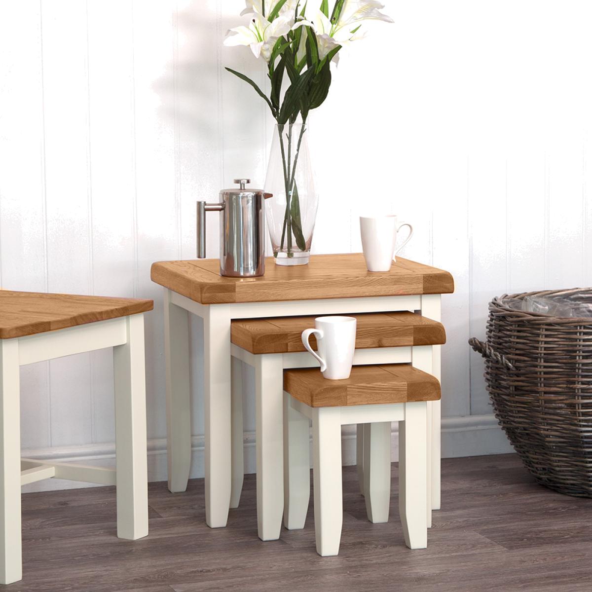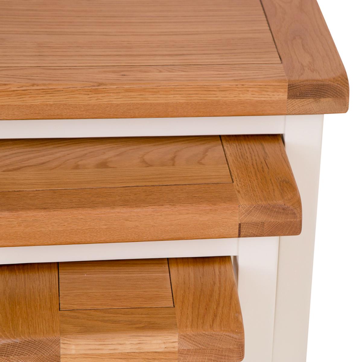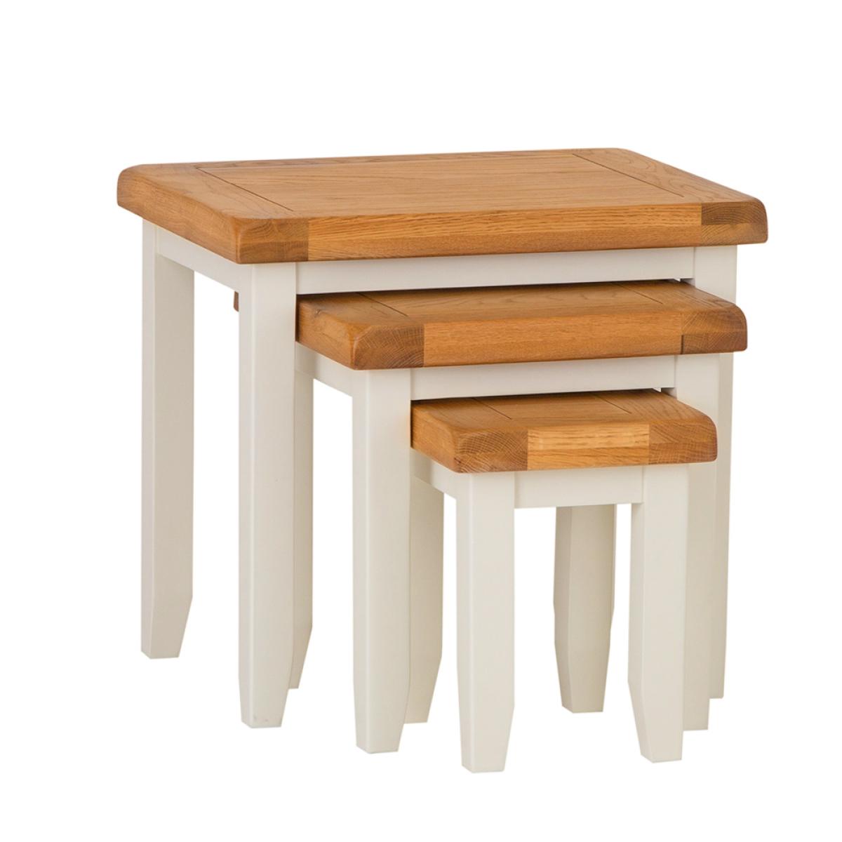 Add the homely, lived-in charm you’ve been looking for with a little help from the Hampshire Ivory Painted Oak Nest of 3 Tables. Side Tables are a great way to add plenty of functional options to the home that are ideal for guests, whilst at the same time providing an additional surface to display a lamp and a couple of beloved or-naments. The thick frame is brought to life by the authentic ivory painted finish to create a truly farmhouse look which compliments the chunky oak top. Just what you need when you want to add charm and style in equal measure.