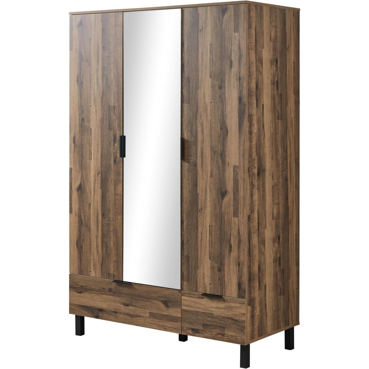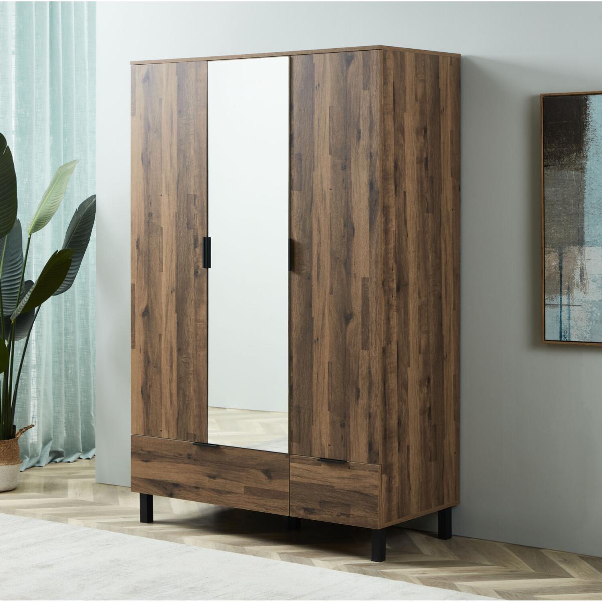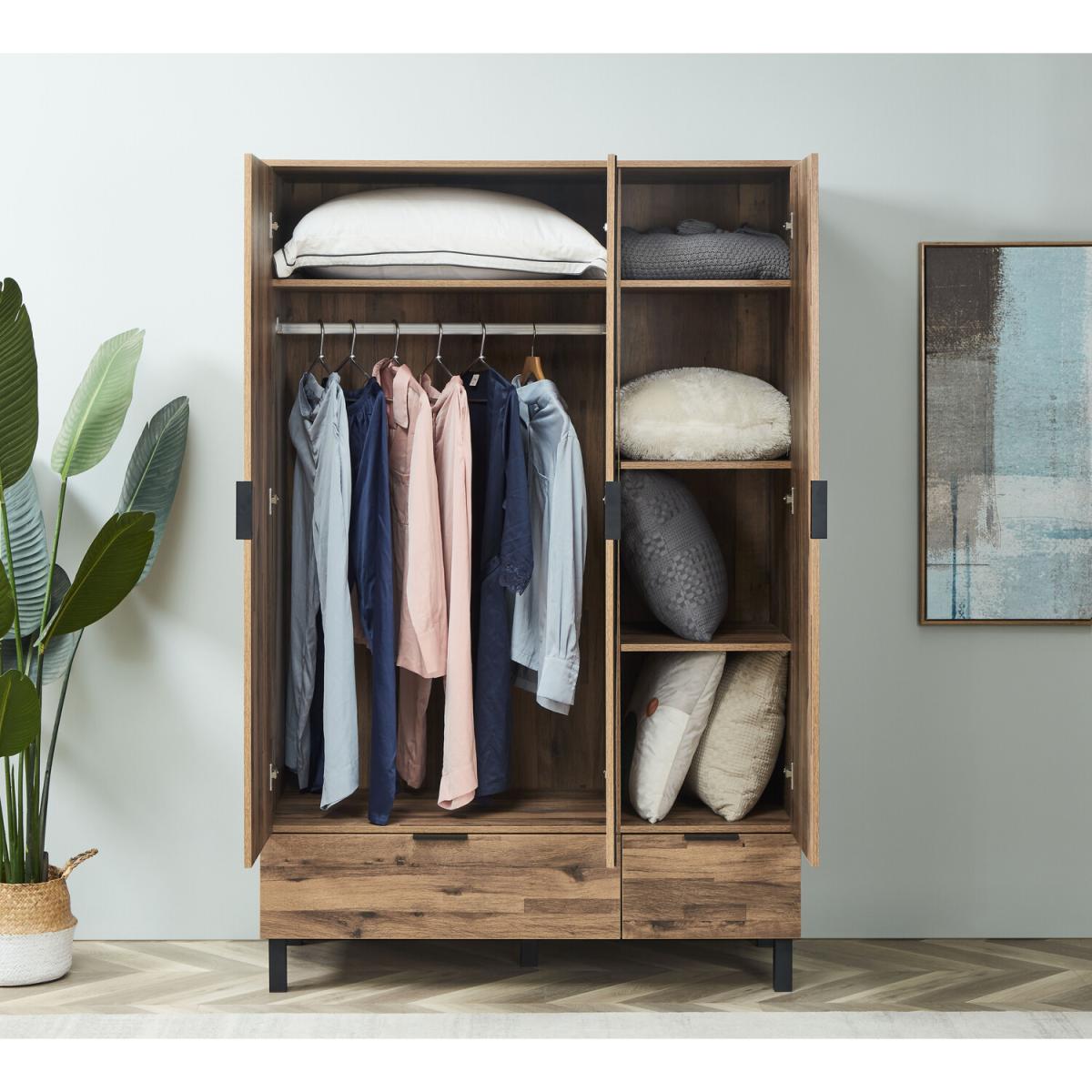 I’m a fan of this oak-effect triple wardrobe with built-in mirror because its clean lines and warm wood grain work in both modern-Scandi and industrial-style bedrooms. The full-length mirror adds light and a sense of space, while the twin drawers below are perfect for everyday bits and bobs. To style, stick to a neutral palette - linen textiles, matte black fittings and woven baskets on top for extra storage - and keep the mirror uncluttered so it reflects the room. Inside, use matching hangers and clear-front boxes to make the most of the generous three-door layout.