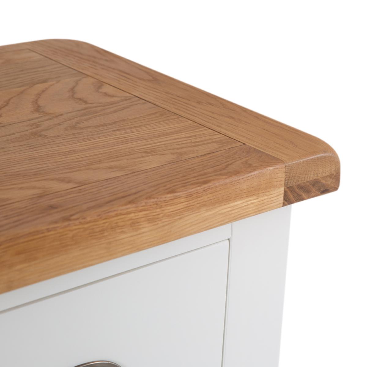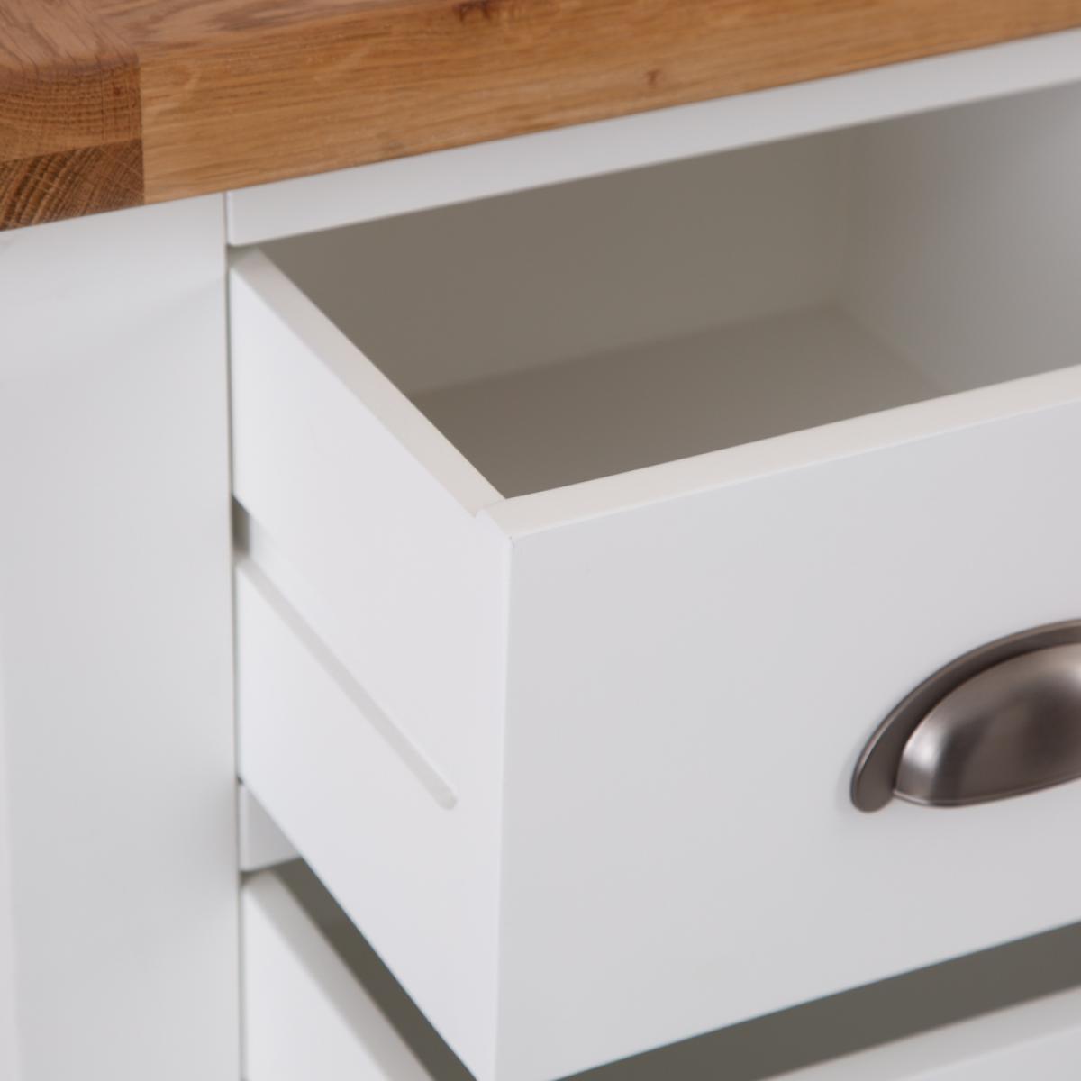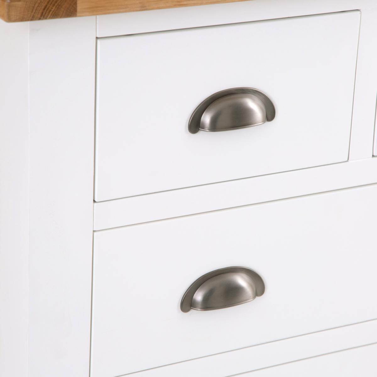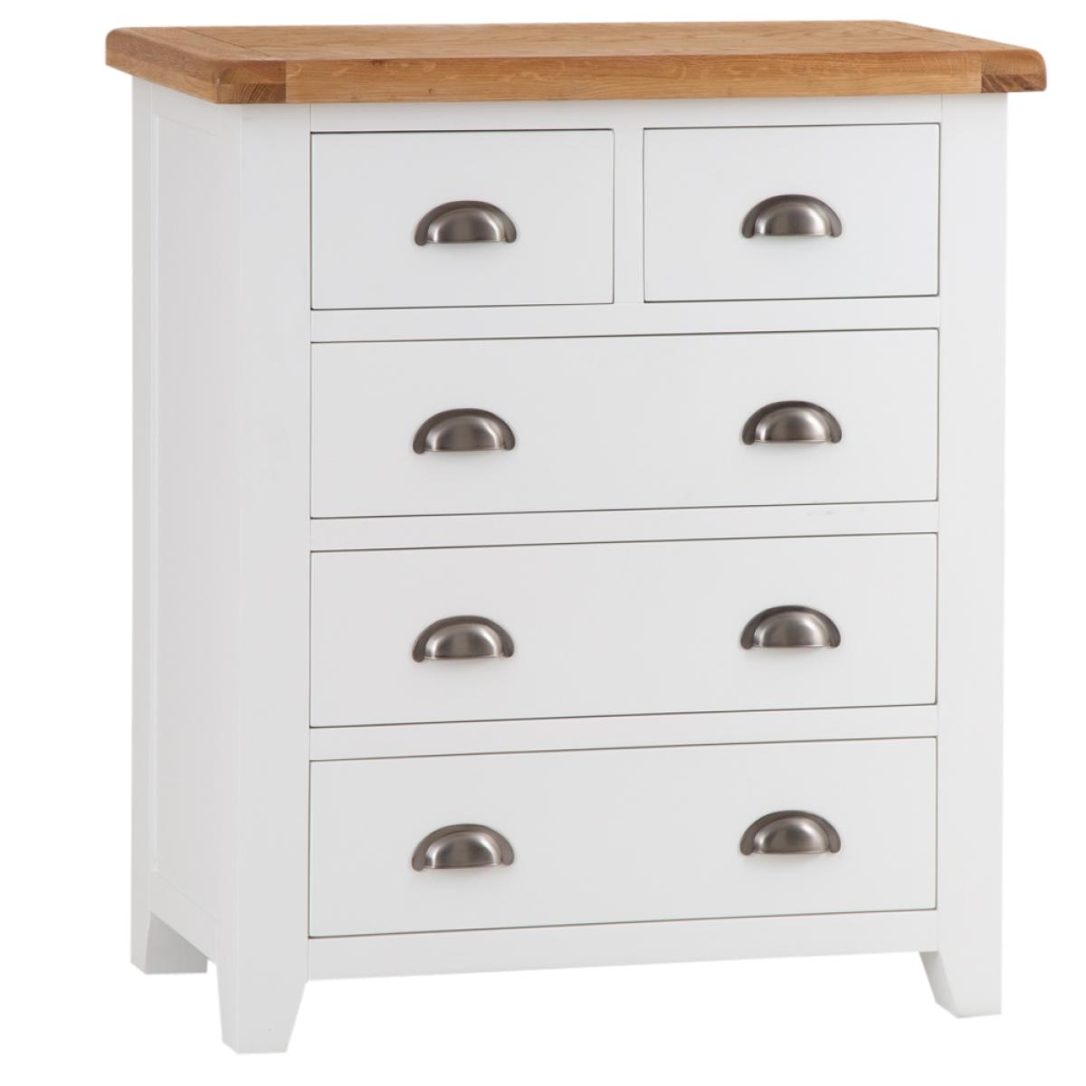 Treat your bedroom to an inspired finishing touch with a little help from the Hampshire White Painted Oak 2 Over 3 Chest. It's a stunning display of master craftsmanship that will take pride of place in any home, and all whilst adding the sought after farmhouse touch that's so in right now. Thick and chunky lines combine with the graceful white painted finish to create a Chest of Drawers that catch the eye from any angle. Look closer and you'll appreciate the way in which the drawers are brought to life by the contemporary twist of the cupped handles. Everything is then finished in style by the chunky oak top.