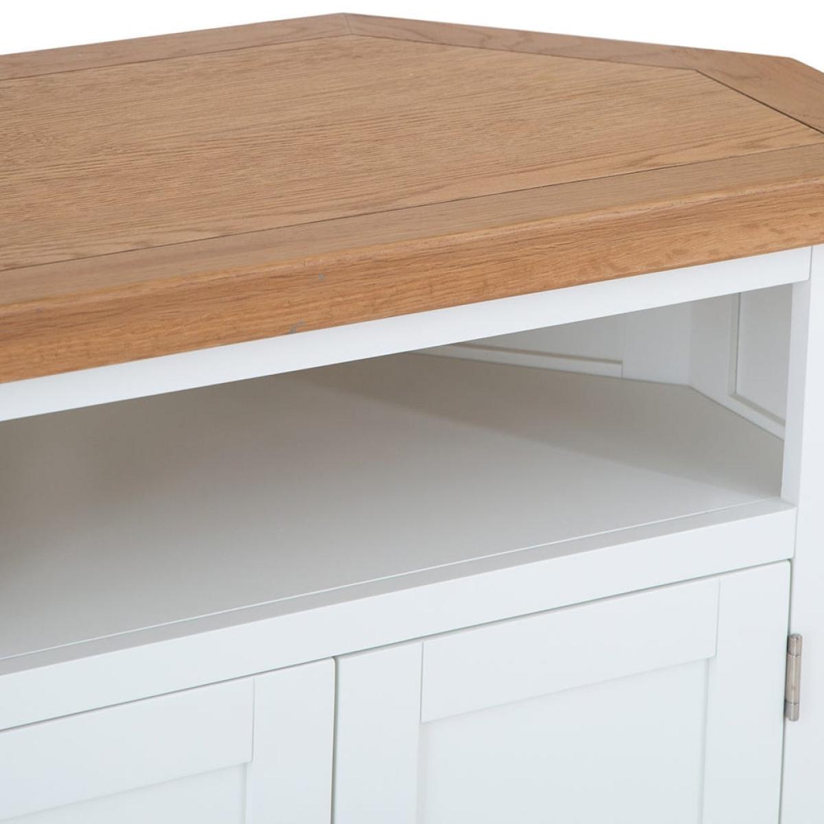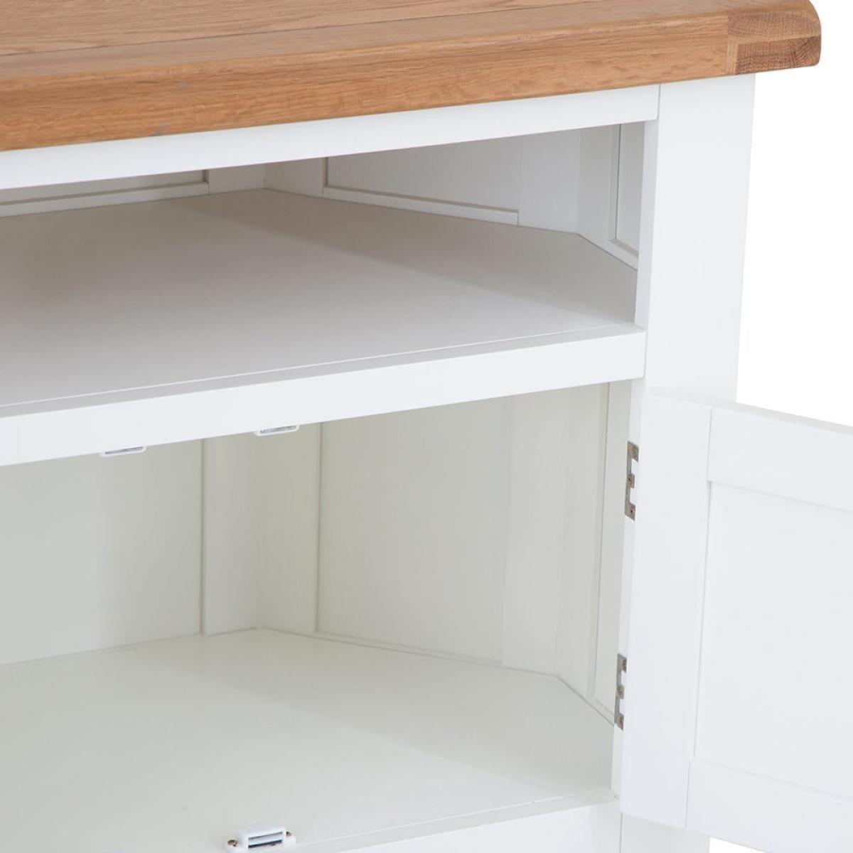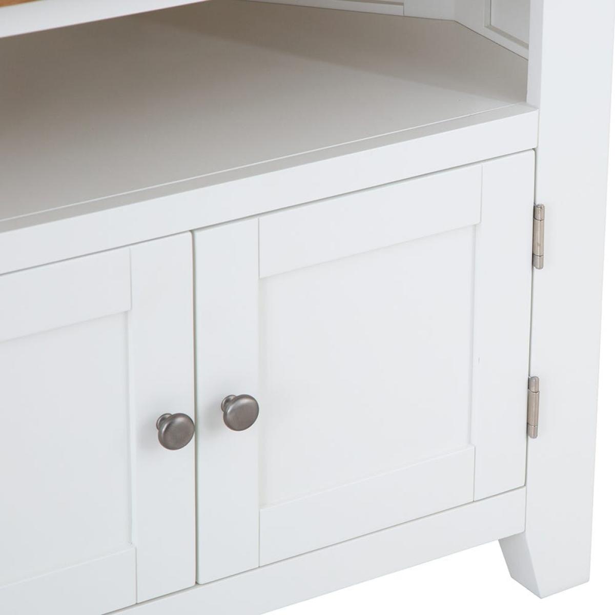 Position this D-shaped Hampshire white painted oak corner TV unit in your living room or bedroom for an entertainment station that won’t encroach on your chilling zone. Its compact surface is ideal for standard smaller sets, leaving room for your favourite display pieces. The double cupboard keeps clutter out of sight, and the shelf accommodates a DVD player or games console. The base is painted in our vivid white to liven up dark corners and is paired with a natural oak top that delivers on traditional charm. Chrome doorknobs, tapered legs and exposed hinges bring the luxury touch. Please note: This item is not pure/brilliant White. It is an off-white, described as ‘antique white’.