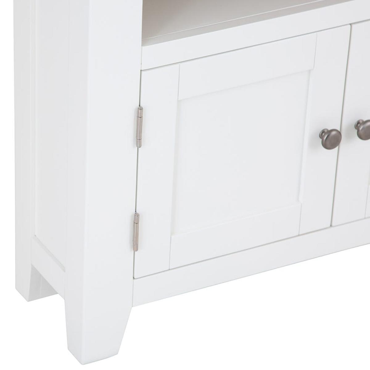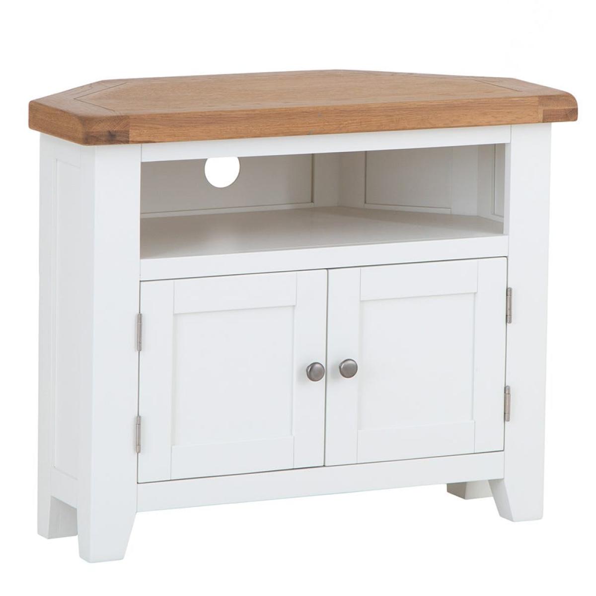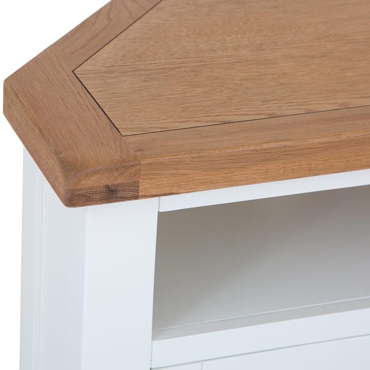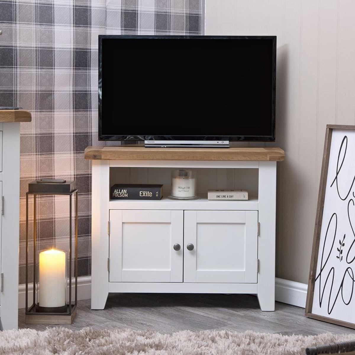 Position this D-shaped Hampshire white painted oak corner TV unit in your living room or bedroom for an entertainment station that won’t encroach on your chilling zone. Its compact surface is ideal for standard smaller sets, leaving room for your favourite display pieces. The double cupboard keeps clutter out of sight, and the shelf accommodates a DVD player or games console. The base is painted in our vivid white to liven up dark corners and is paired with a natural oak top that delivers on traditional charm. Chrome doorknobs, tapered legs and exposed hinges bring the luxury touch. Please note: This item is not pure/brilliant White. It is an off-white, described as ‘antique white’.