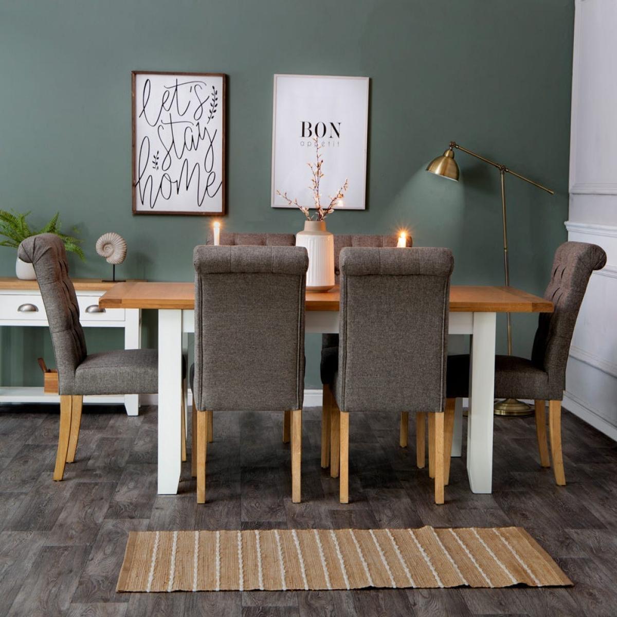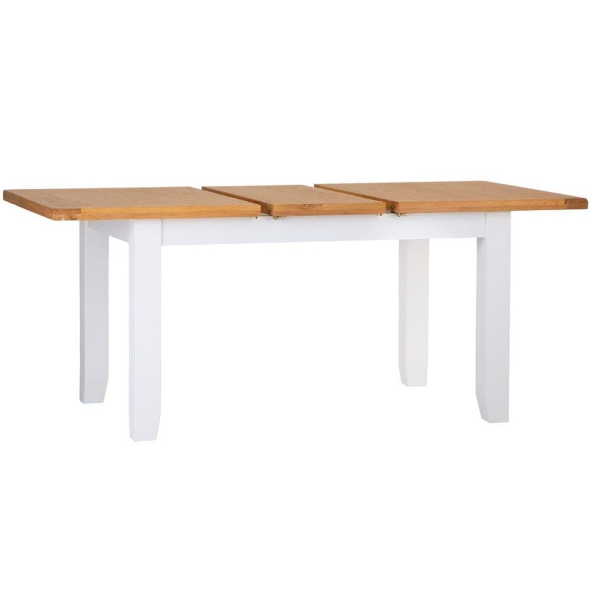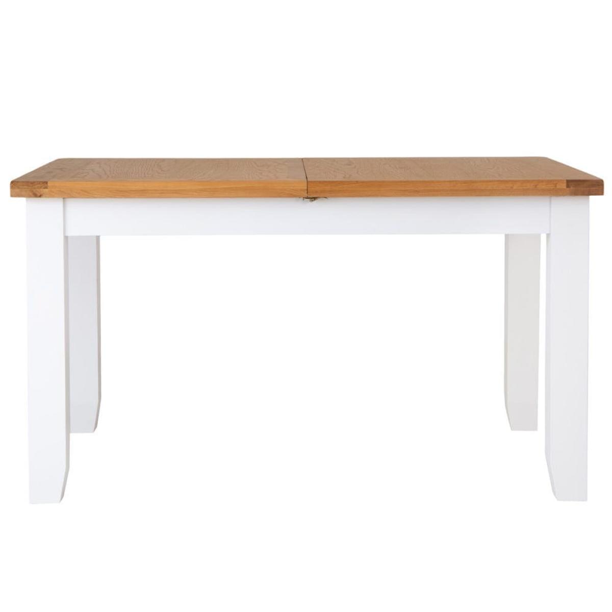 Be the host with the utmost with our Hampshire white painted oak medium extending dining table. It pulls apart to fit a matching insert, extending to 180cm to seat six with ease (or eight at a squeeze!) The sturdy tabletop is built to bear banquets of any proportions, whether it’s a pizza party or a three-course meal, and you can slide it back together when you’re done. Our farmhouse-style natural oak top contrasts with the elegant tapered legs, which are finished in our clean white shade. Choose a set of dining chairs from the same range for synchronised style at your next gathering. Please note:This item is not pure/brilliant White. It is an off-white, described as ‘antique white’.