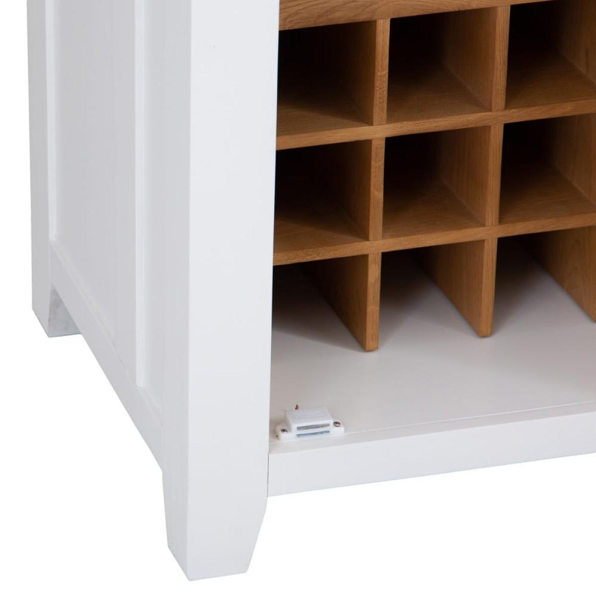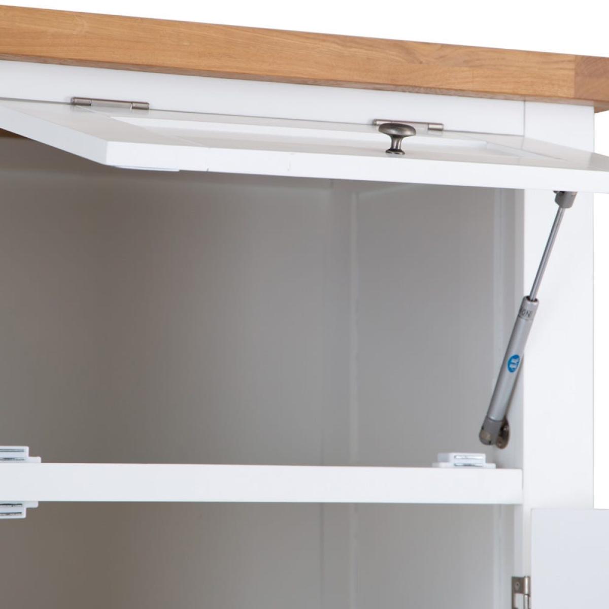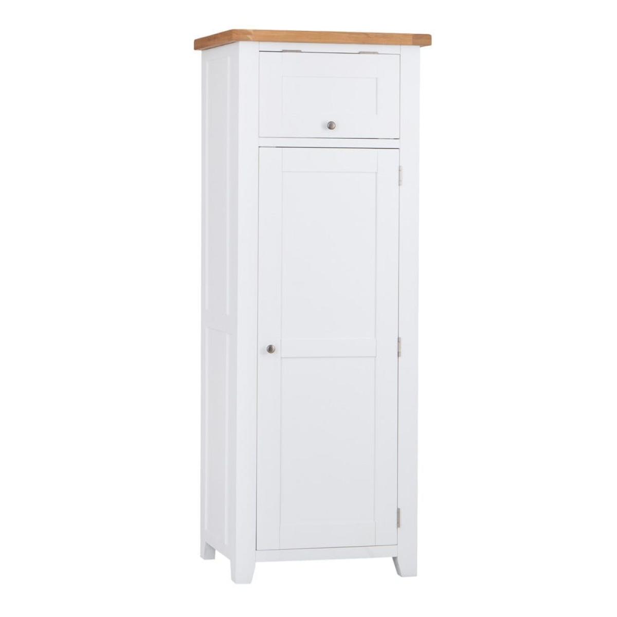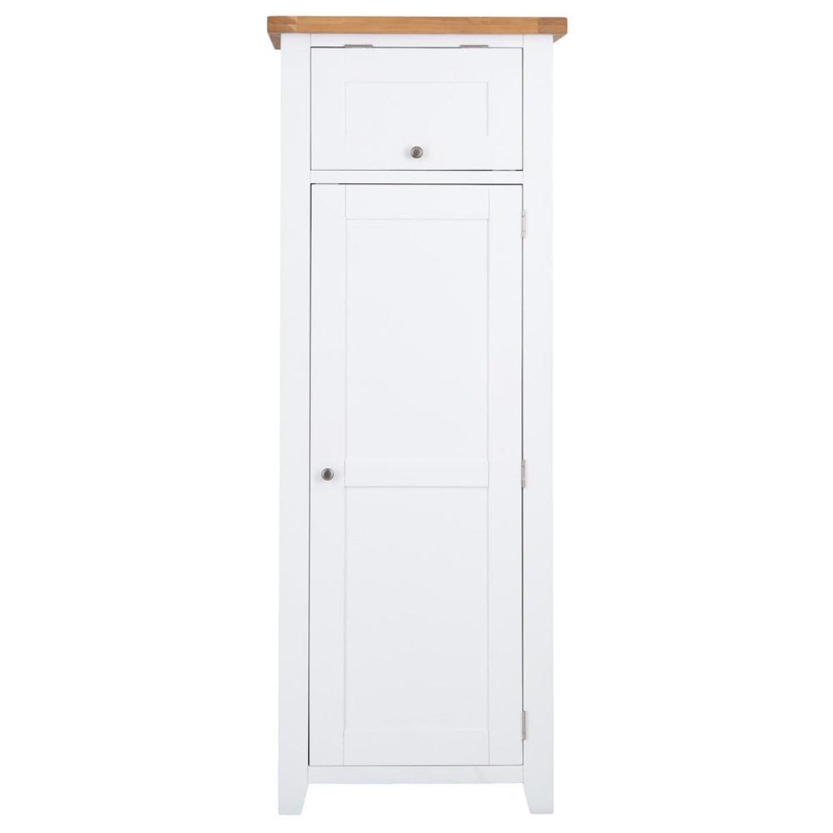 Maximise your kitchen space with this Hampshire white painted oak slim larder cupboard. It’s the perfect size to sit alongside your fitted units, and has plenty of clever features that mean you’ll always look forward to putting away the weekly shop. A spacious drawer is ideal for wooden spoons and spatulas, and sits above a wine-rack that can hold up to 12 bottles. The main shelves are adjustable or removable for large jars and bottles, and the door compartments are ideal for condiments and relishes. The oak interior enhances our breezy white, with tapered legs softening the sturdy frame. Please note:This item is not pure/brilliant White. It is an off-white, described as ‘antique white’.