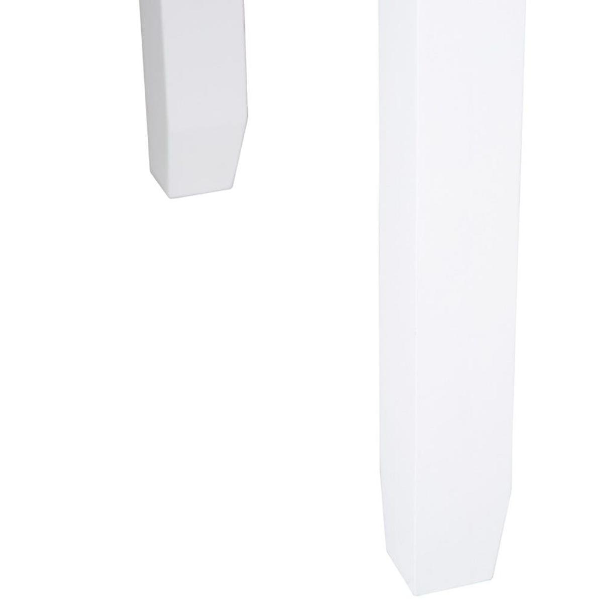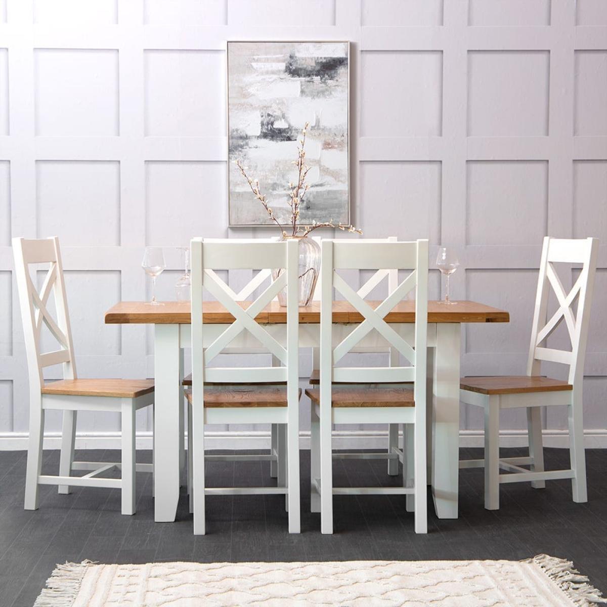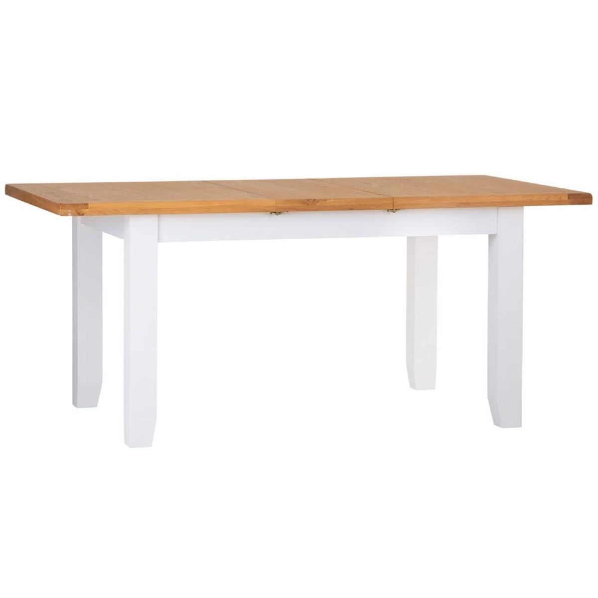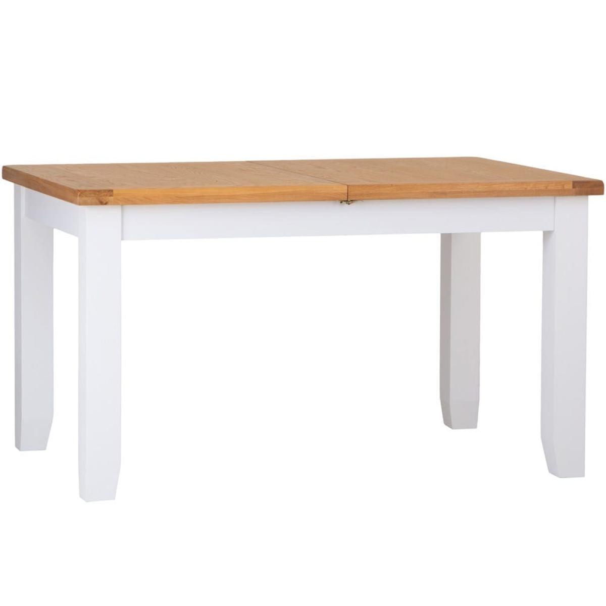 Unexpected guests? No problem. Our super-smart Hampshire white painted oak small extending dining table extends to accommodate those last-minute extras, so there’s always room for a little one (or two). It brings a touch of class to breakfast, lunch and dinner, with the honey-coloured chunky oak tabletop striking a perfect contrast with its white tapered legs. This table slides apart to accommodate a handy insert, for an overall length of 150cm, and neatly slots back together when the party’s over. Its timeless style suits both contemporary and traditional interiors, and the clever design makes it the ideal space-saving solution. Please note:This item is not pure/brilliant White. It is an off-white, described as ‘antique white’.