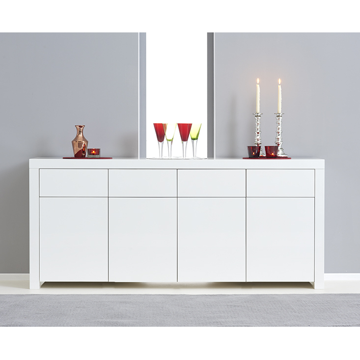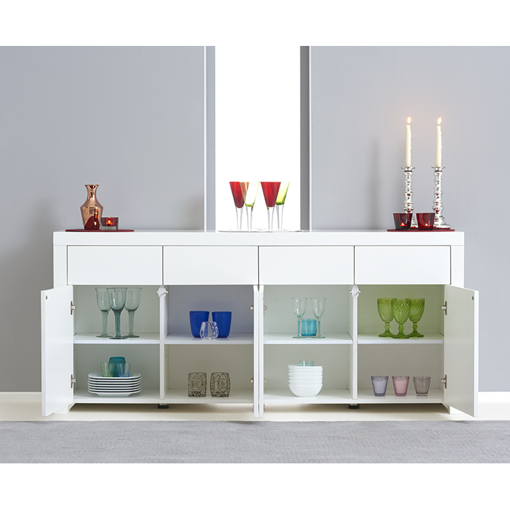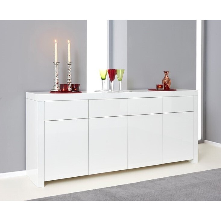 Hampstead 4 Door 4 Drawer Sideboard features a smooth minimalist design to complement any décor. Stylish and practical, the white high gloss sideboard makes a stunning impression in any home. Crafted from durable MDF, the sideboard features four cupboards with a shelf in each and four convenient drawers. The drawers and cupboard doors feature enhanced soft-close mechanisms. The 4 Door 4 Drawer Sideboard is complete with a bright white high gloss finish that is simply wiped clean.
