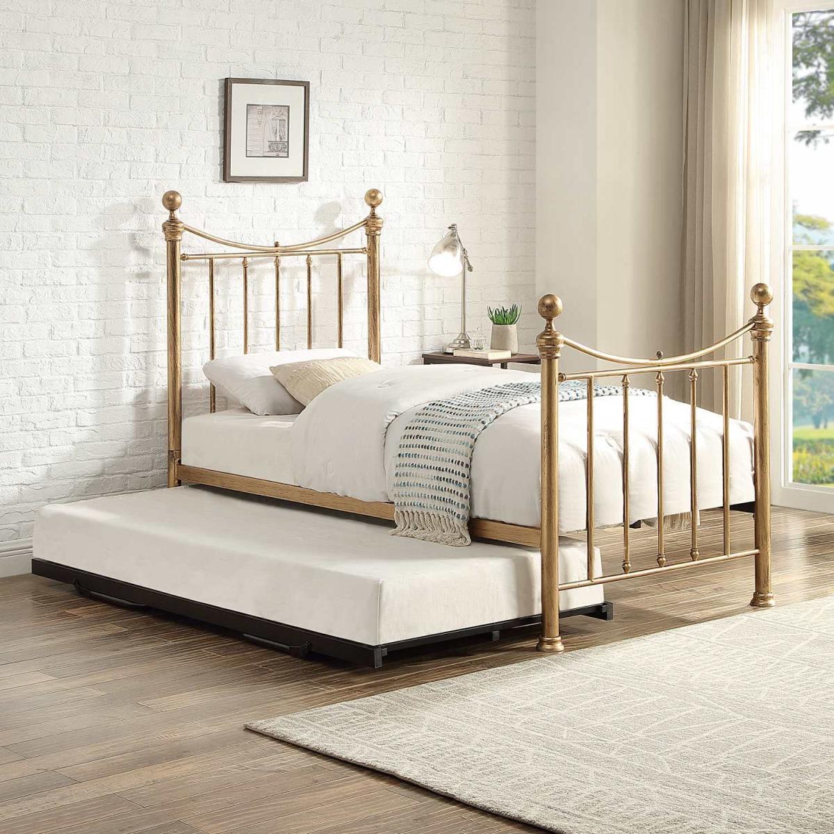 Enhance your bedroom with the exquisite charm of the Hampstead Antique Brass Effect Metal Guest Bed with Trundle by OAT. Hand painted over a black underlay to give a distressed antique brass effect look, its traditional Victorian design is adorned with ball finials on each post, for a touch of elegance. The sturdy metal bar slatted base offers comfort and support for a peaceful night's sleep, while the handy pull out trundle bed is perfect for sleepovers. Exclusively from OAT Home, this bed frame is a must-have for those who value quality and style.