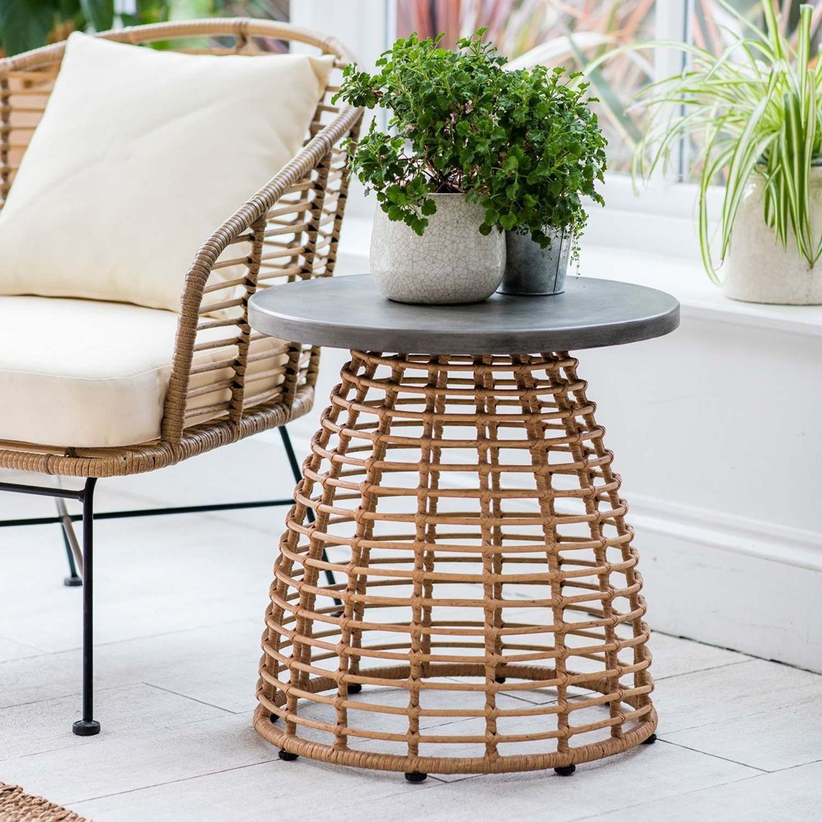 With a Scandinavian-inspired aesthetic, our Hampstead side table features a bullet-shaped open weave base, crafted from plastic strips designed to look like bamboo, intricately wrapped around a powder-coated steel frame. Finished with a circular, rolled edge resin top designed to look like industrial concrete, this lightweight table perfectly combines minimalism and functionality.