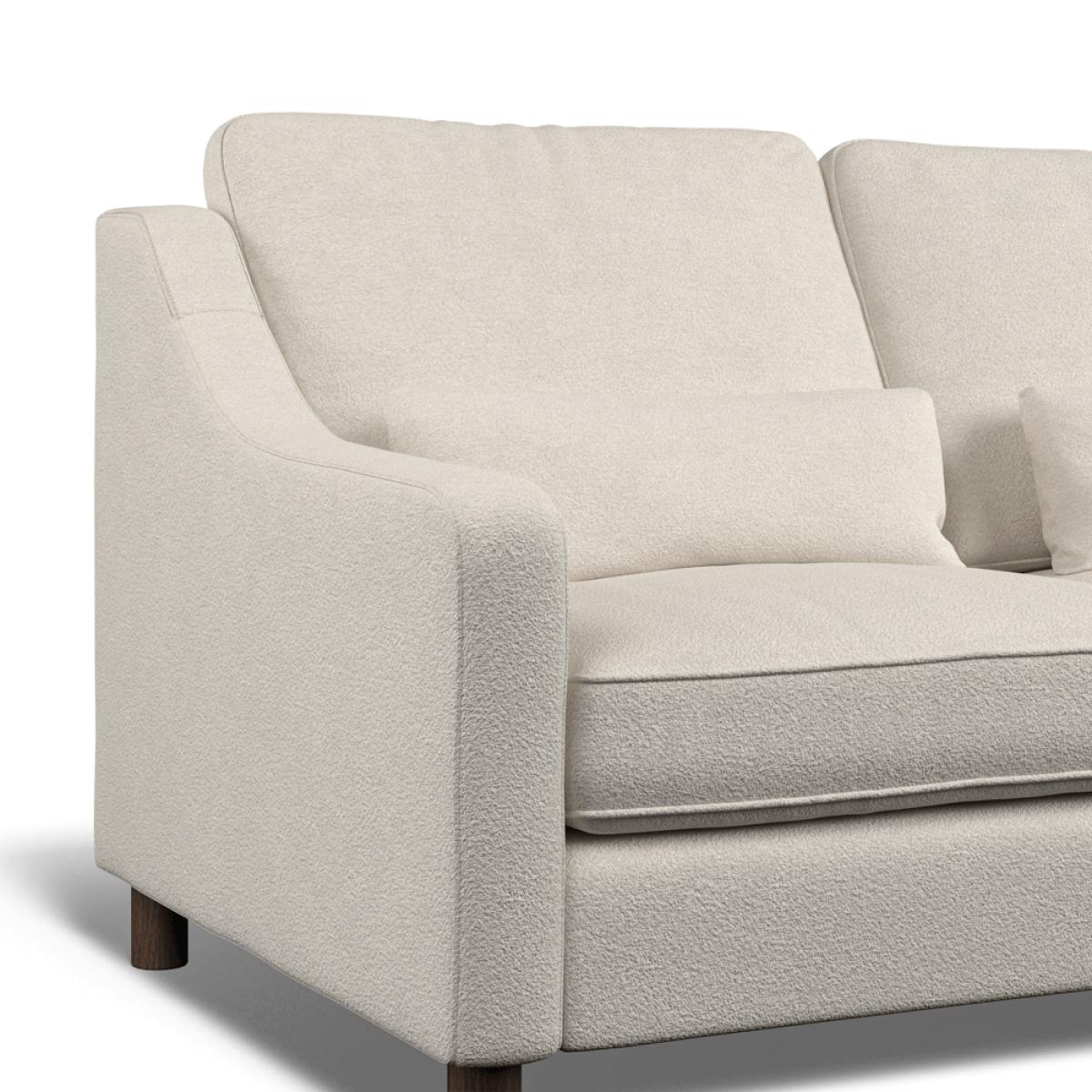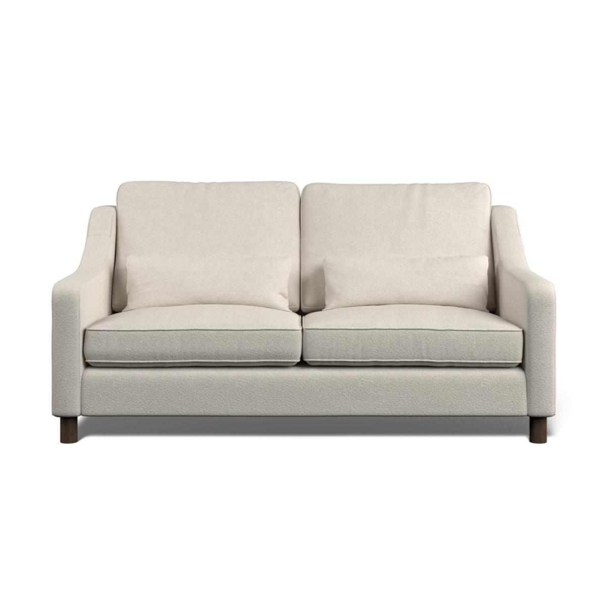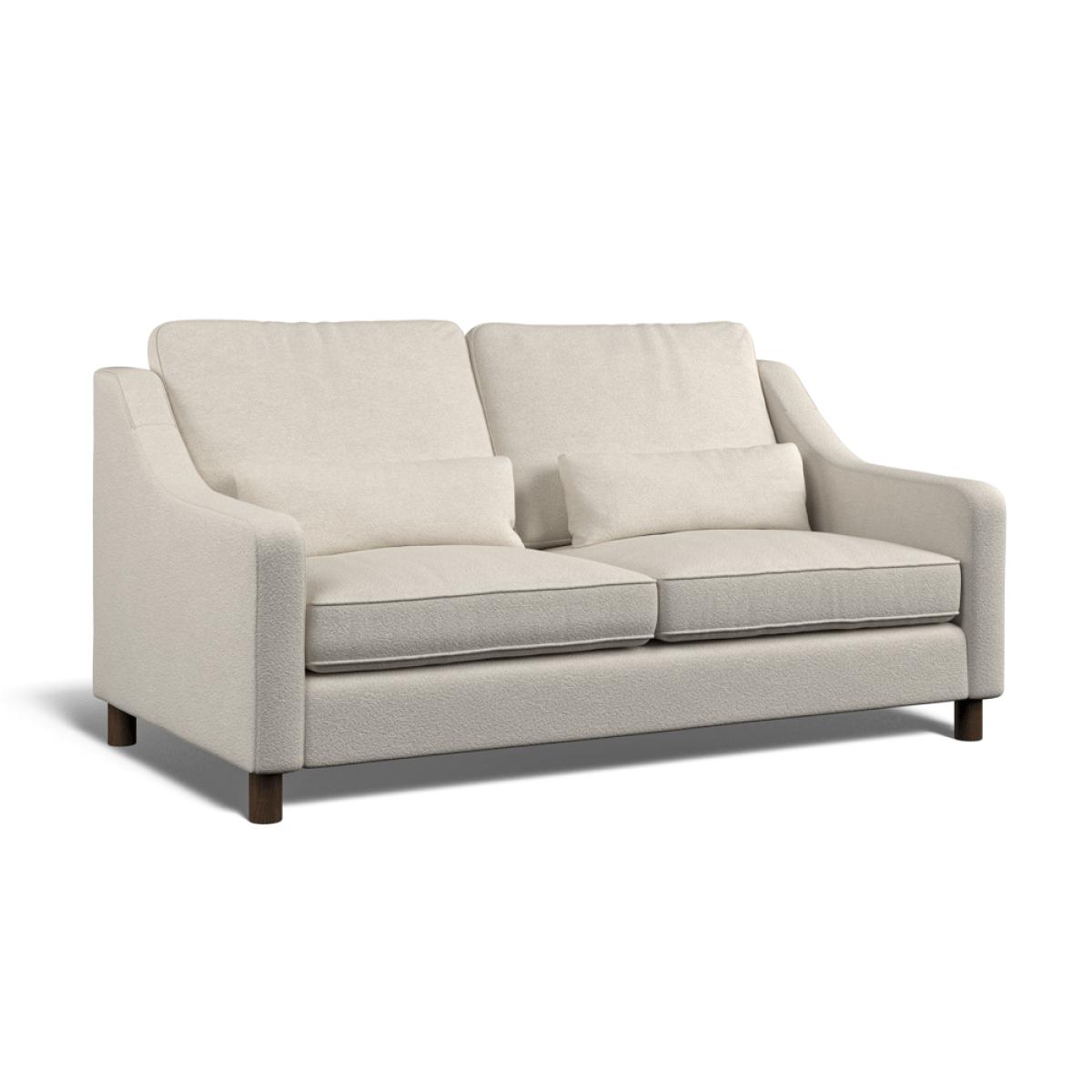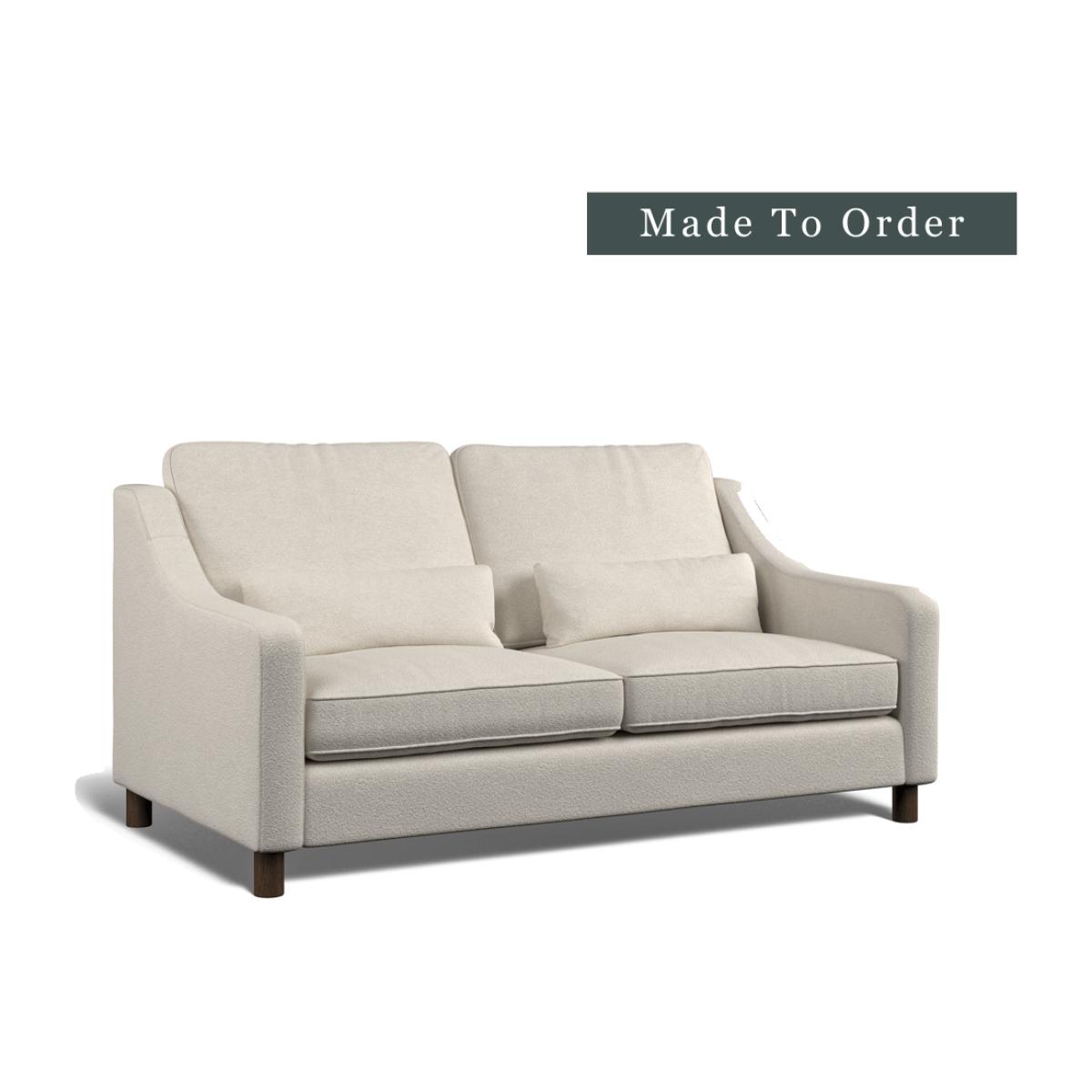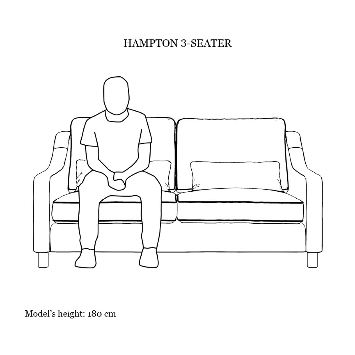 Our Hampton 3 Seat Sofa is made to be lounged in, and its comfortable, elegant proportions are perfect for any formal or casual living space. This classic style incorporates comfortable high back cushions, swooping armrests, and supportive lumber cushions. It sits on solid beech wood legs. Elegant and timeless, the Hampton collection includes a matching range of armchairs, loveseats and 3 and 4 seater sofas. All with generous proportions for maximum comfort. This range offers a medium-to-soft supportive ‘sit’, with high back cushions constructed from soft fibre, and seat cushions constructed with a medium density foam core with soft fibre wrap. The scatter cushions are filled with premium European duck feather for a perfectly soft recline. Skilfully produced by master upholsterers in UK using premium materials such as a hardwood frame, which has been glued and screwed for a robust build that will last the test of time. Each item is made to order and upholstered in your choice of either Bouclé (2 colours available) or Easy Clean Eco Velvet (8 colours available). Our Sofas and Armchairs are handmade to order in our UK factory.