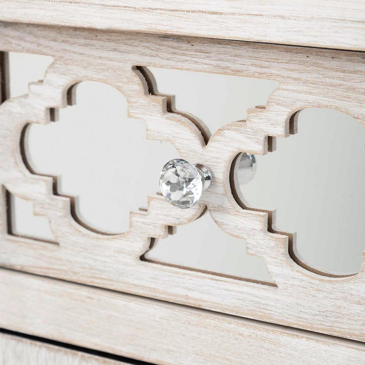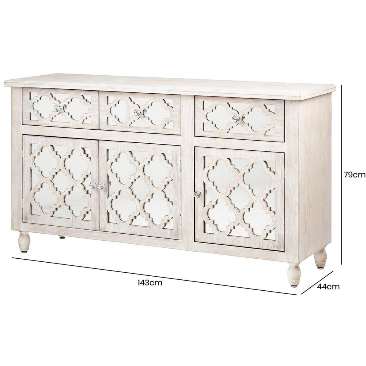 The Hampton Beach 3 door 3 drawer cabinet is inspired by the understated elegance of a New England beach home. Featuring a washed ash effect finish, the spacious doors and drawers are beautifully enhanced by mirror overlayed with intricate fretwork detailing and crystal handles.