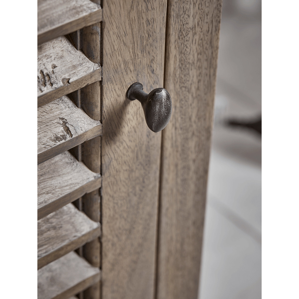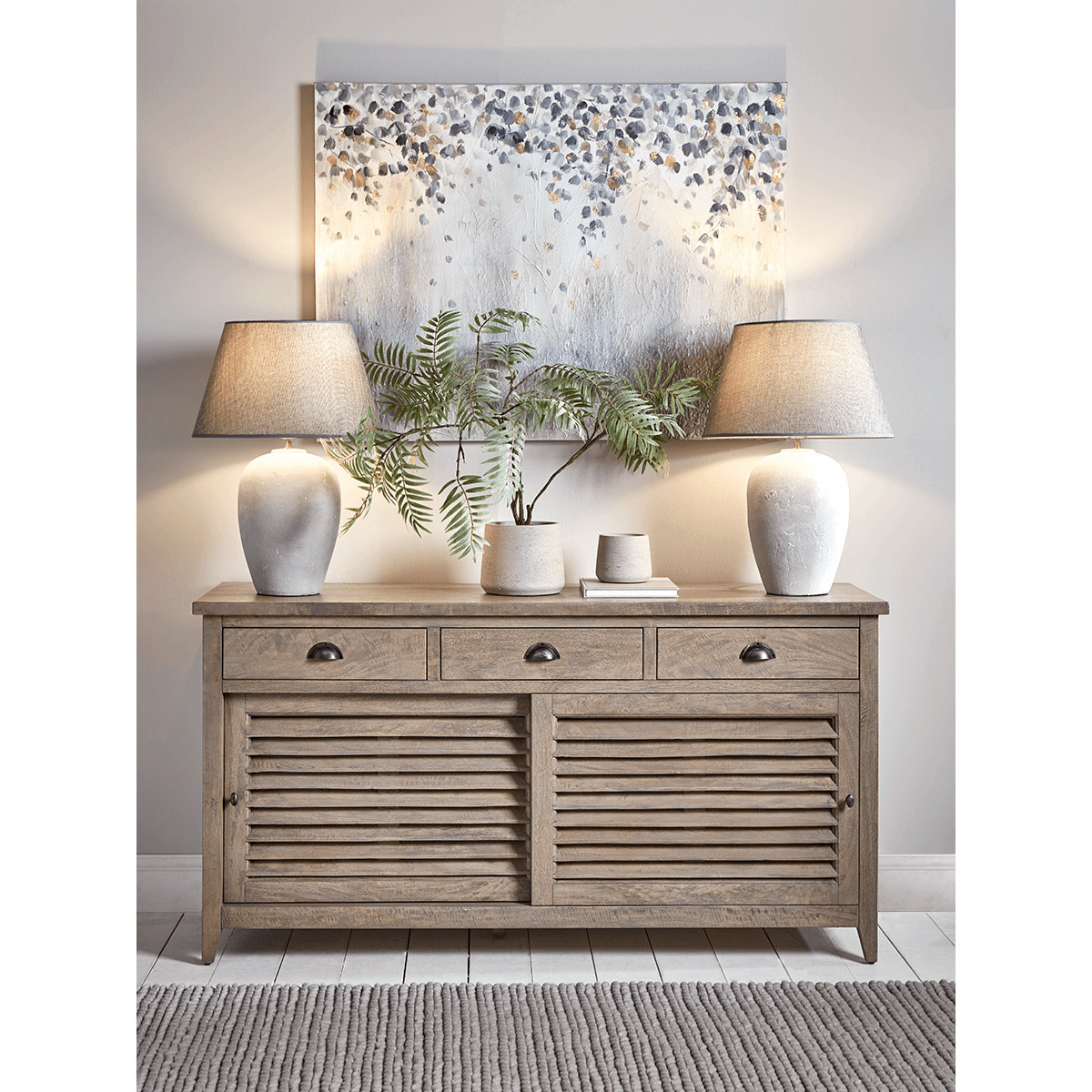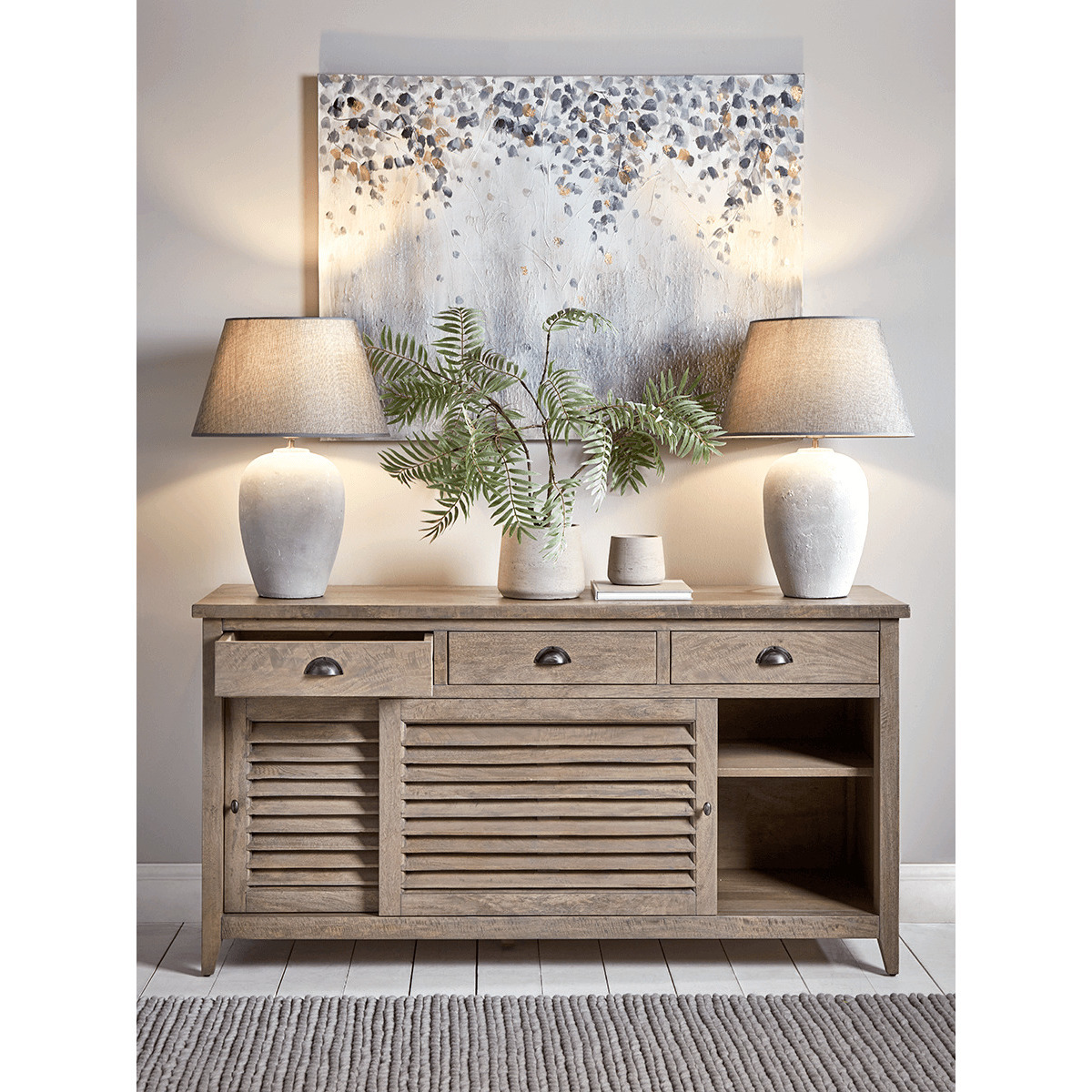 I love this sideboard because of its versatile and timeless design, which works well in both modern and coastal interiors. Its natural, weathered finish adds warmth and texture, making it an ideal piece for living rooms, dining areas, or hallways. Practical styling tips include keeping the surface uncluttered with a few statement accessories, such as a pair of matching lamps, like shown, or some greenery to soften the look. The slatted doors also lend a subtle hint of texture, perfect for adding visual interest without overwhelming the space. This piece is not only functional storage but also an understated statement that can anchor different decorative styles.