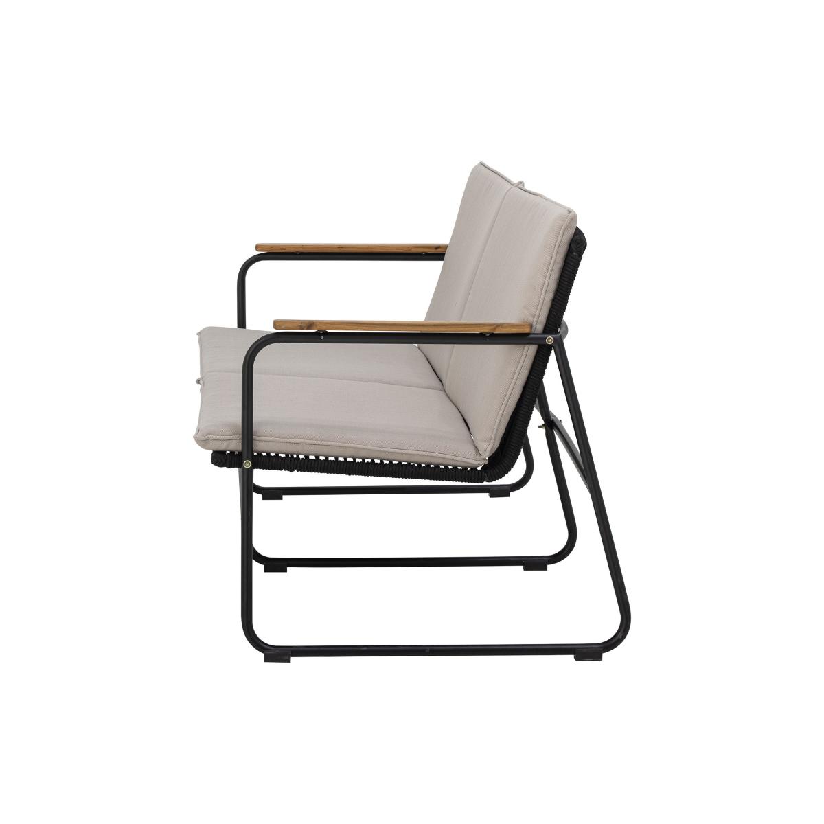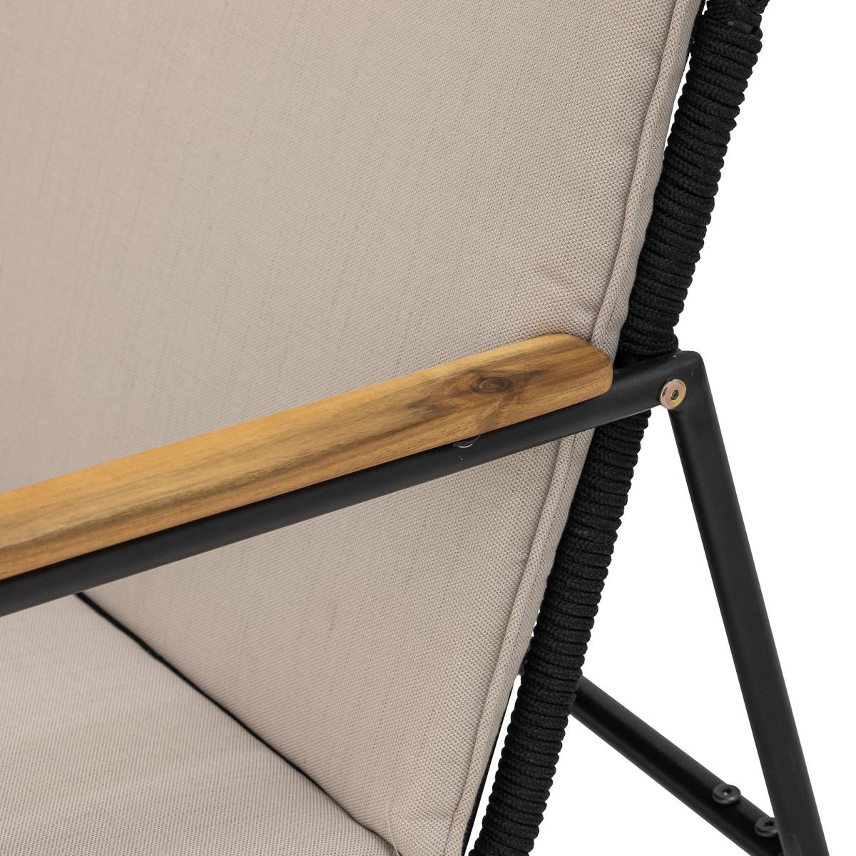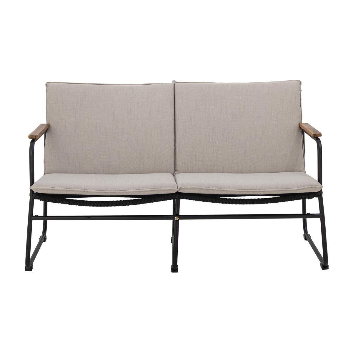 Compact and elegant, the Hampton sofa is perfect on a small terrace or in a small space. The sofa’s frame is black metal, while the seat and back are made of braided polyester cord and, together with the cushions, provide a wonderful place to sit. The armrests are made of acacia wood. PLEASE NOTE. Not weatherproof: use indoors, or outdoors in dry weather (bring inside in case of rain) or in a covered outdoor space.