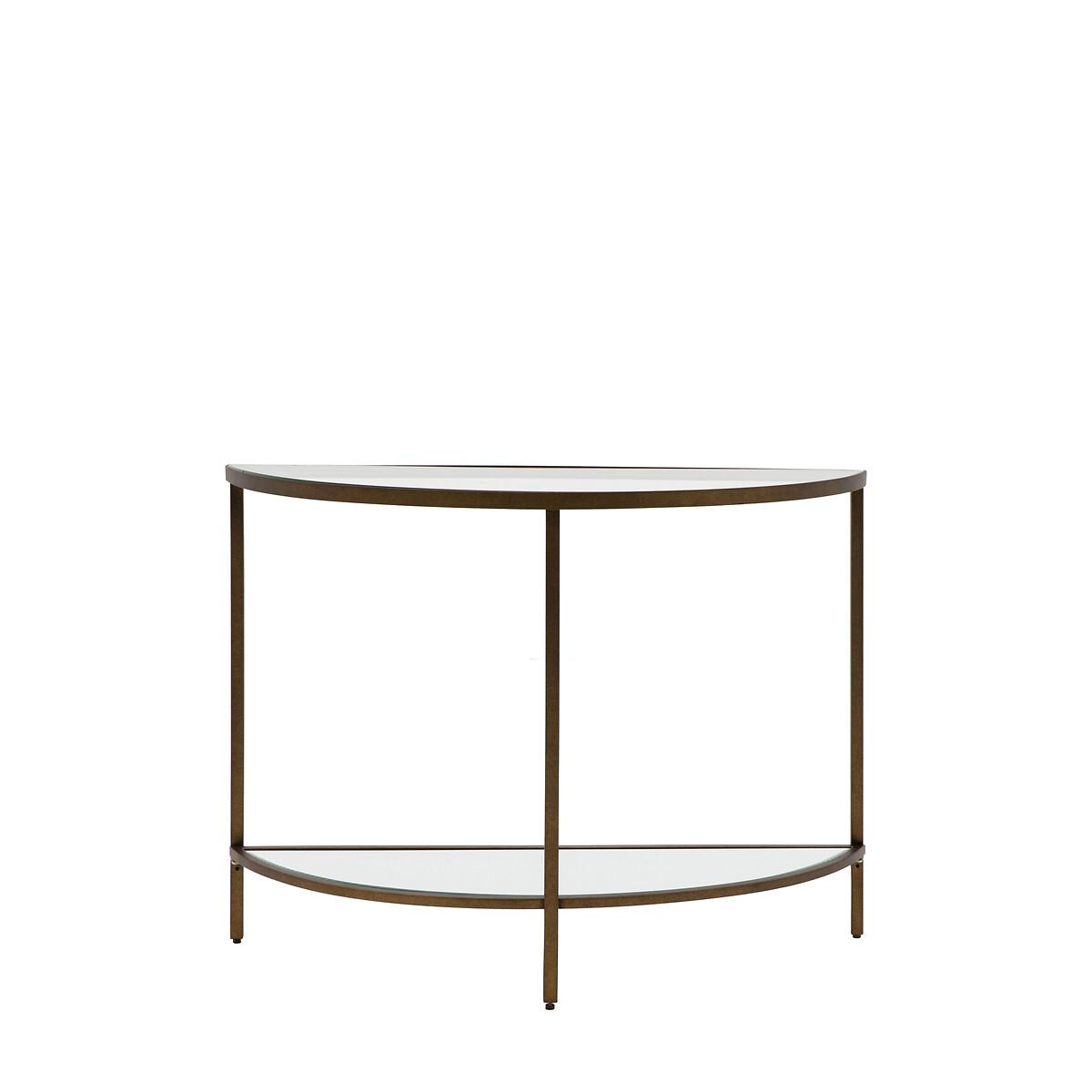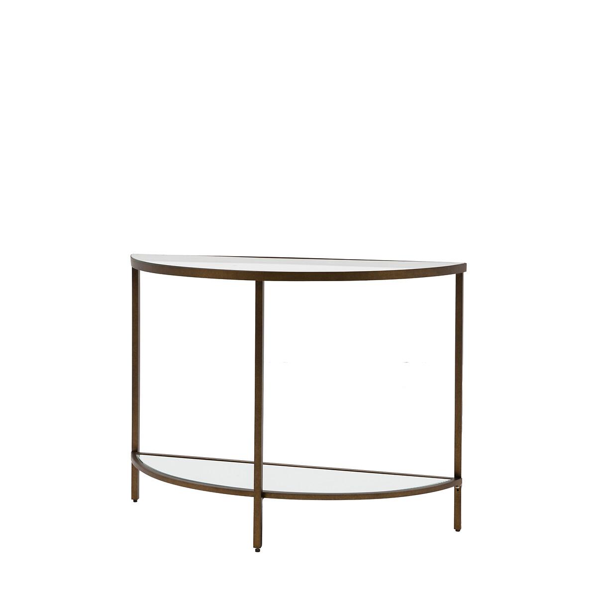 Glamorous and eye catching, the Demi Lune shaped Console Table perfect for hallways, living rooms and bedrooms alike. The tempered glass top shelf & mirror glass bottom shelf in a vintage metal frame will add a touch of luxury to any room. Product details. Fixed shelving. Aged gold leaf style legs. Anti-topple kit provided. Fully assembled. Product Composition - Metal / Glass / MDFProduct Dimensions - 35 cm x100 cm x75 cm , Weight - 10.5 KGDistance Between Shelves- 57 cm Clearance to floor- 13.5cm Package Dimensions - 129 cm x 41 cm x 18 cm, Weight 16.4 kg. This product will be dispatched by one of our trusted suppliers. You’ll be contacted by their selected courier about your delivery. Please note: this product cannot be delivered to all Offshore Islands, Northern Ireland or Republic of Ireland. GALLE01
