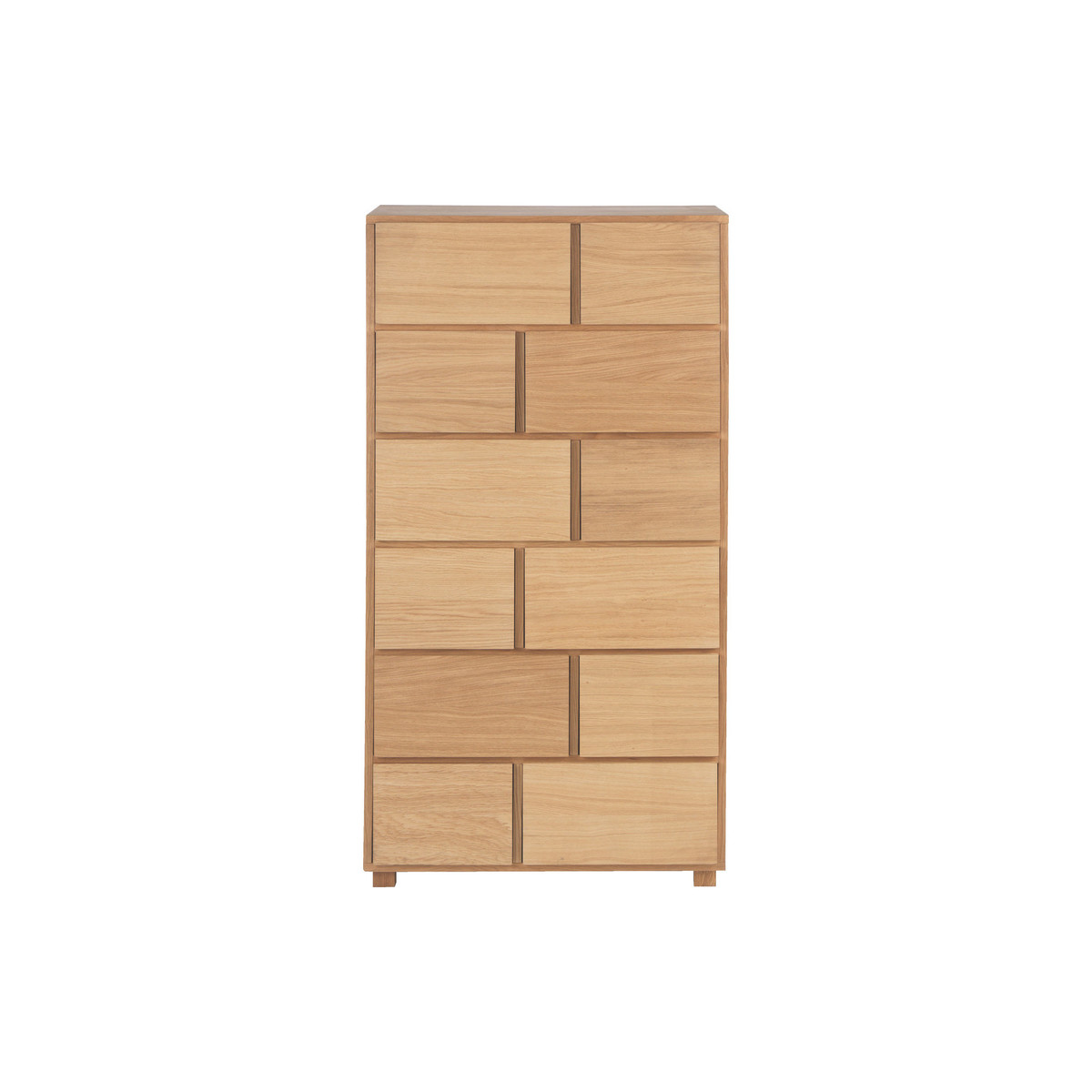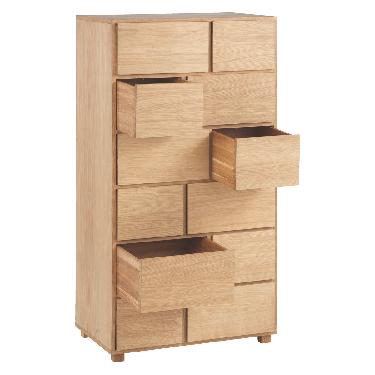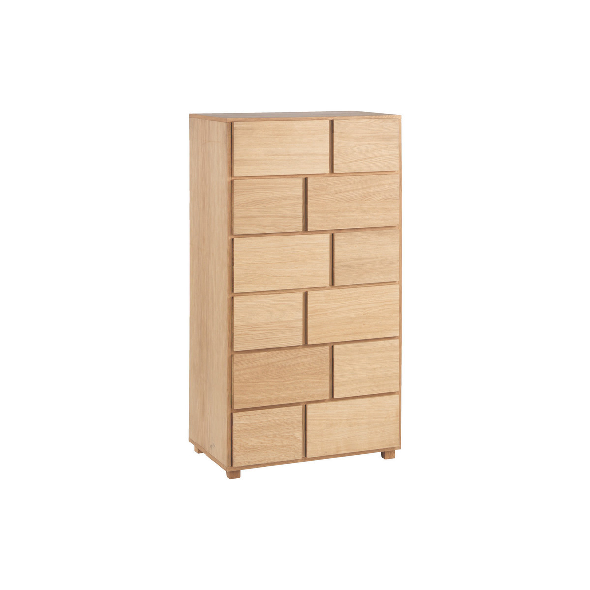 The Hana II oak 12 drawer tall chest is part of the elegant, timeless bedroom furniture range, made from oiled solid oak and oak veneer for structural integrity and stability. The 12 differently sized drawers are pre-assembled and feature decorative dovetail joints, which provide high tensile strength to withstand constant pulling and pushing motions. Each drawer has a hidden groove to alllow easy opening and slides on traditional wooden runners. Each piece of the Hana furniture is hand finished and uses traditional cabinet making techniques to ensure strength and longevity. Designed by Award winning designer Bethan Gray, the Hana bedroom collection offers substance and style for your home.