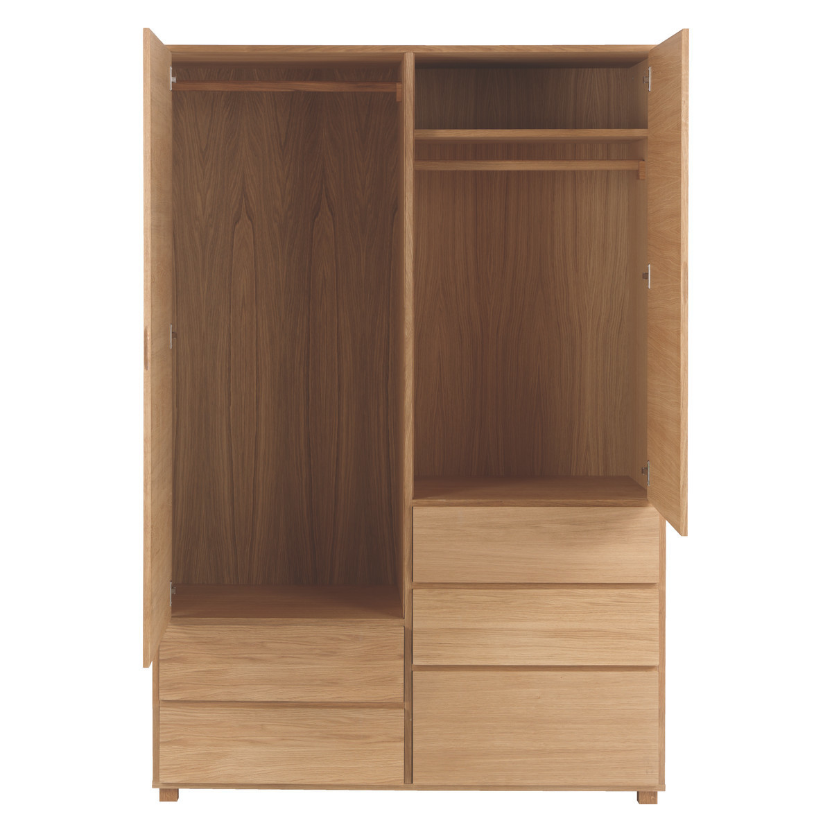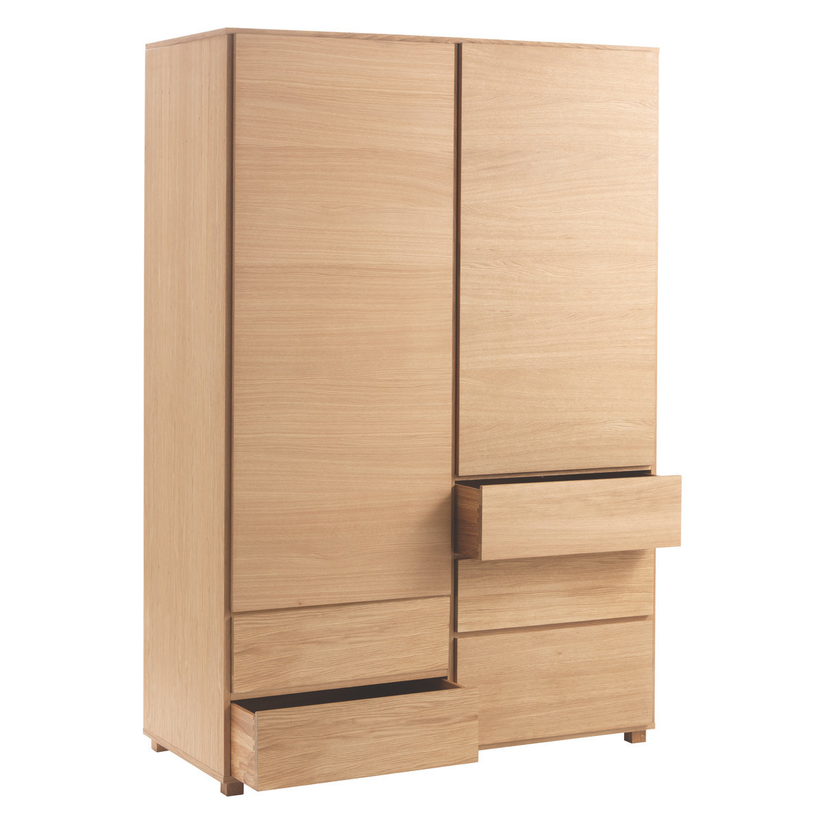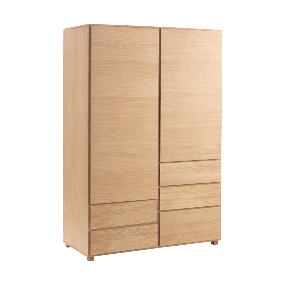 The Hana II oak 2 door wardrobe with 5 storage drawers is part of the elegant, timeless bedroom furniture range, made from oiled solid oak and oak veneer for structural integrity and stability. The double wardrobe includes 2 wooden hanging rails, a shelf and 5 drawers. Each piece of the Hana furniture is hand finished and uses traditional cabinet making techniques to ensure strength and longevity. The oiled finish brings out the natural beauty of the wood and highlights the beautiful features of oak. Designed by Award winning designer Bethan Gray, the Hana bedroom collection offers substance and style to your home.
