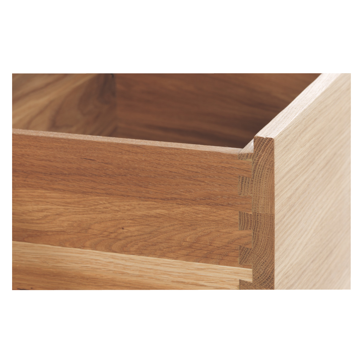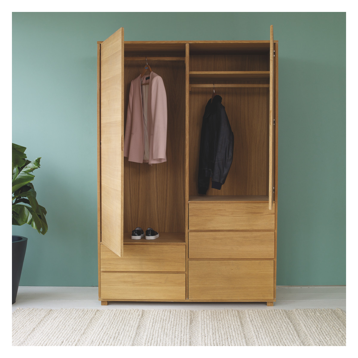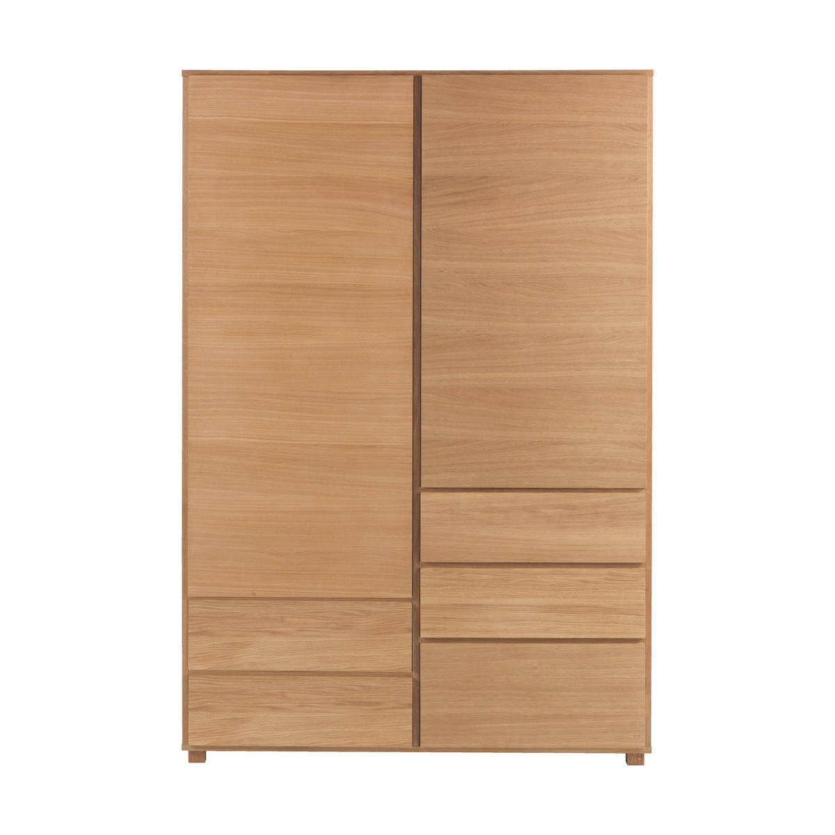 The Hana II oak 2 door wardrobe with 5 storage drawers is part of the elegant, timeless bedroom furniture range, made from oiled solid oak and oak veneer for structural integrity and stability. The double wardrobe includes 2 wooden hanging rails, a shelf and 5 drawers. Each piece of the Hana furniture is hand finished and uses traditional cabinet making techniques to ensure strength and longevity. The oiled finish brings out the natural beauty of the wood and highlights the beautiful features of oak. Designed by Award winning designer Bethan Gray, the Hana bedroom collection offers substance and style to your home.