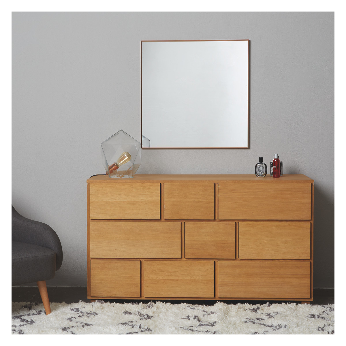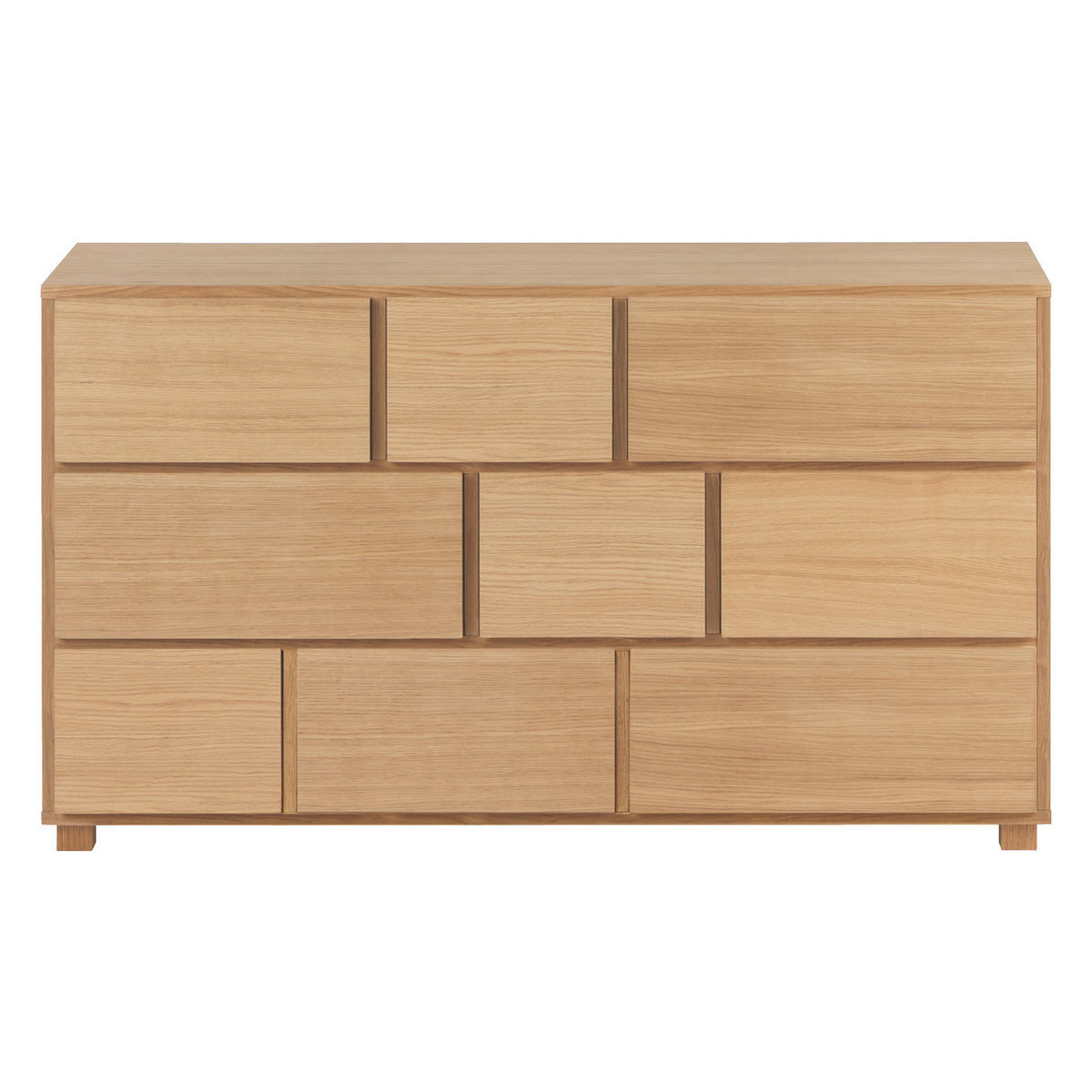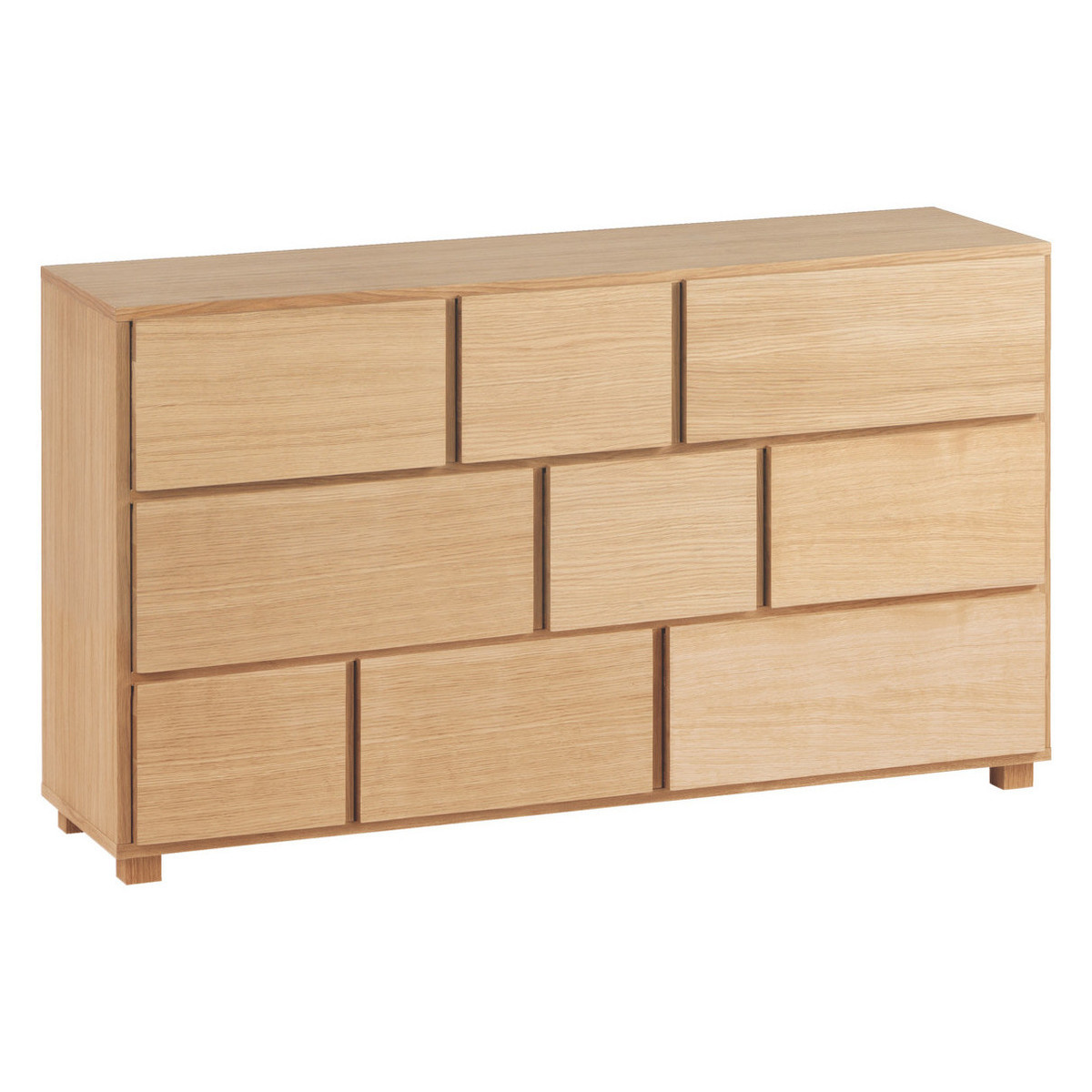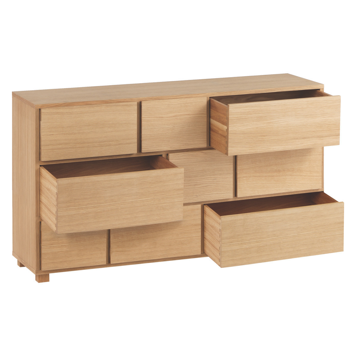 The Hana II oak 9 drawer wide chest is part of the elegant, timeless bedroom furniture range, made from oiled solid oak and oak veneer for structural integrity and stability. The 9 differently sized drawers are pre-assembled and feature decorative dovetail joints, which provide high tensile strength to withstand constant pulling and pushing motions. Each drawer has a hidden groove to alllow easy opening and slides on traditional wooden runners. Each piece of the Hana furniture is hand finished and uses traditional cabinet making techniques to ensure strength and longevity. Designed by Award winning designer Bethan Gray, the Hana bedroom collection offers substance and style for your home.