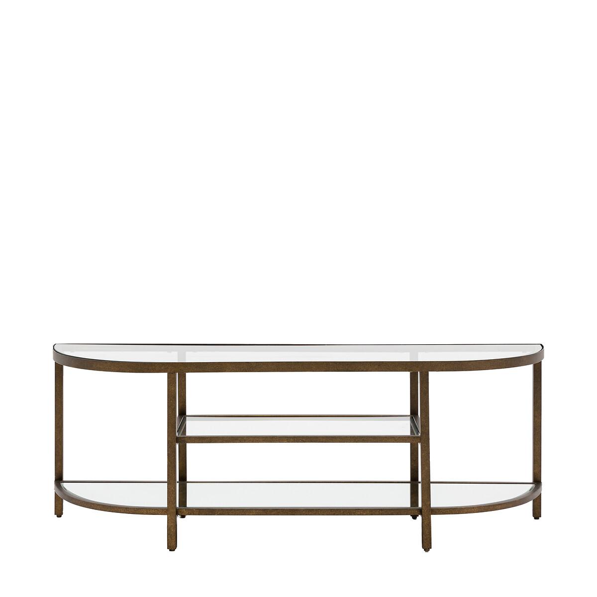 Thoughtfully designed, the elegant Hana media unit is the perfect option for adding a little vintage romance to the living room. Softly curving edges in a gentle half moon shape create a genteeel silhouette. The two glass shelves and mirrored glass base shelf add a luxe touch and are beautifully complemented by the vintage finished metal frame. Product details. Fixed shelving. Shorter central shelf. Open back. Aged gold leaf style legsFreestanding. Anti-topple kit provided. Recommended TV size –43”Max weight capacity – 50 kg. Fully assembled. Product Composition - Metal / Glass / MDFProduct Dimensions - 35 cm x120 cm x45 cm , Weight - 17.4 KGDistance Between Shelves- 16 cm / 16 cm Clearance to floor- 8 cm Package Dimensions - 129 cm x 41 cm x 18 cm, Weight 23.5 kg. This product will be dispatched by one of our trusted suppliers. You’ll be contacted by their selected courier about your delivery. Please note: this product cannot be delivered to all Offshore Islands, Northern Ireland or Republic of Ireland. GALLE01