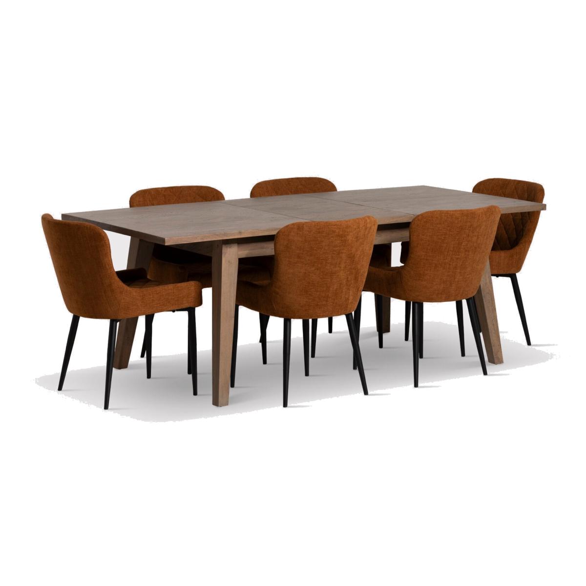 Elevate your dining space with the Mango Wood 160-210cm Extending Dining Table and six Rust Orange Quilted Chairs—a blend of bold design and smart functionality. Expertly crafted from solid mango wood with a distressed salvage grey finish, the table extends to 210cm, effortlessly adapting to everyday meals or larger gatherings. Paired with four Rivington chairs in rich rust orange, each featuring quilted upholstery, supportive foam cushioning, and sleek black metal legs, this set delivers striking style and enduring comfort. Perfect for modern interiors, it’s a sophisticated solution for both casual dining and special occasions