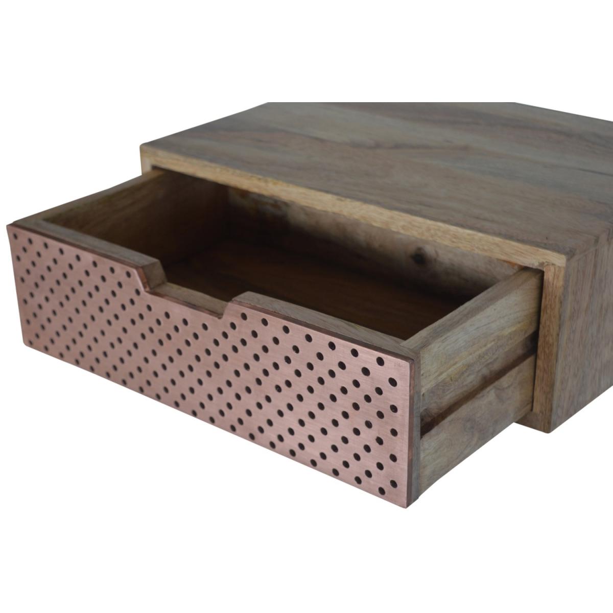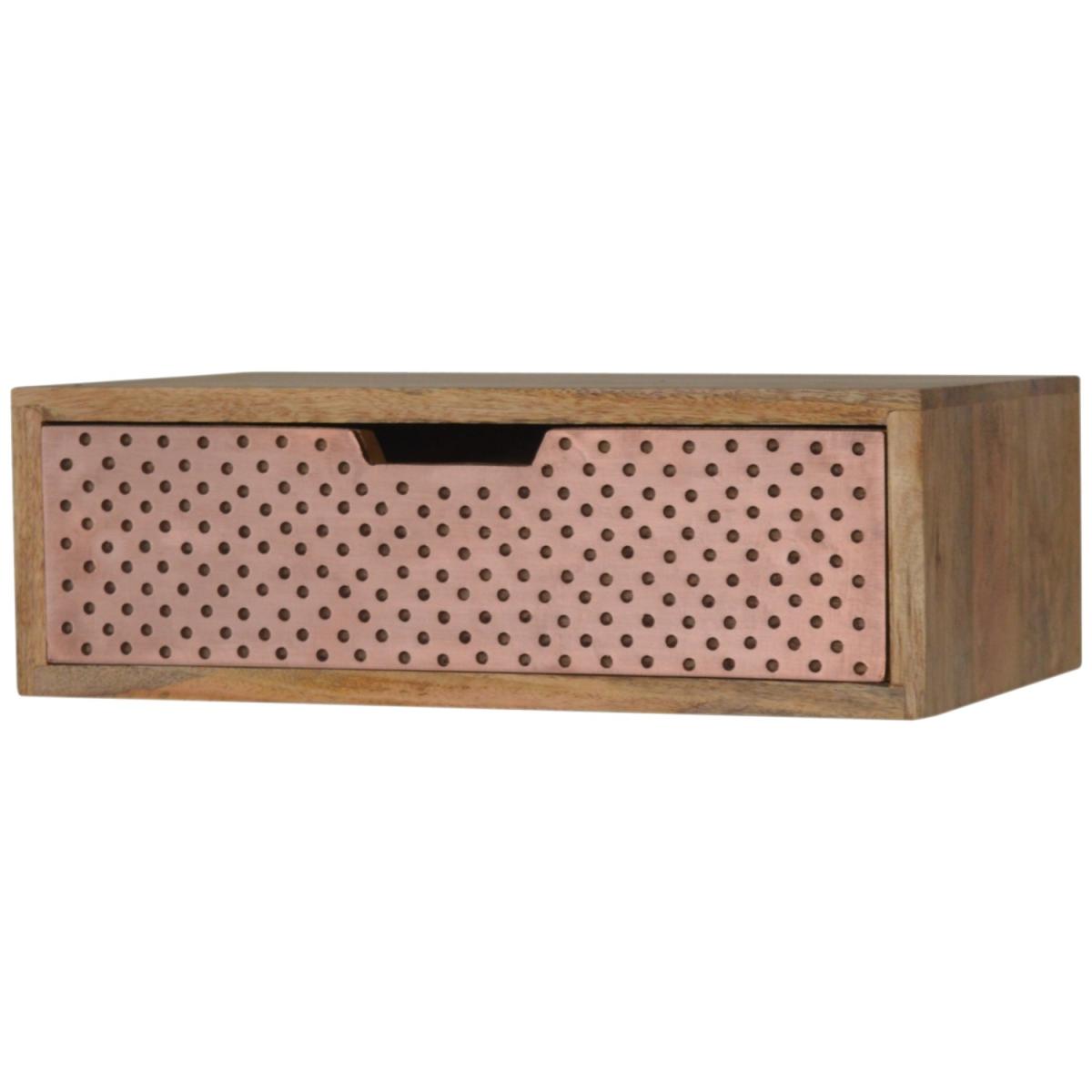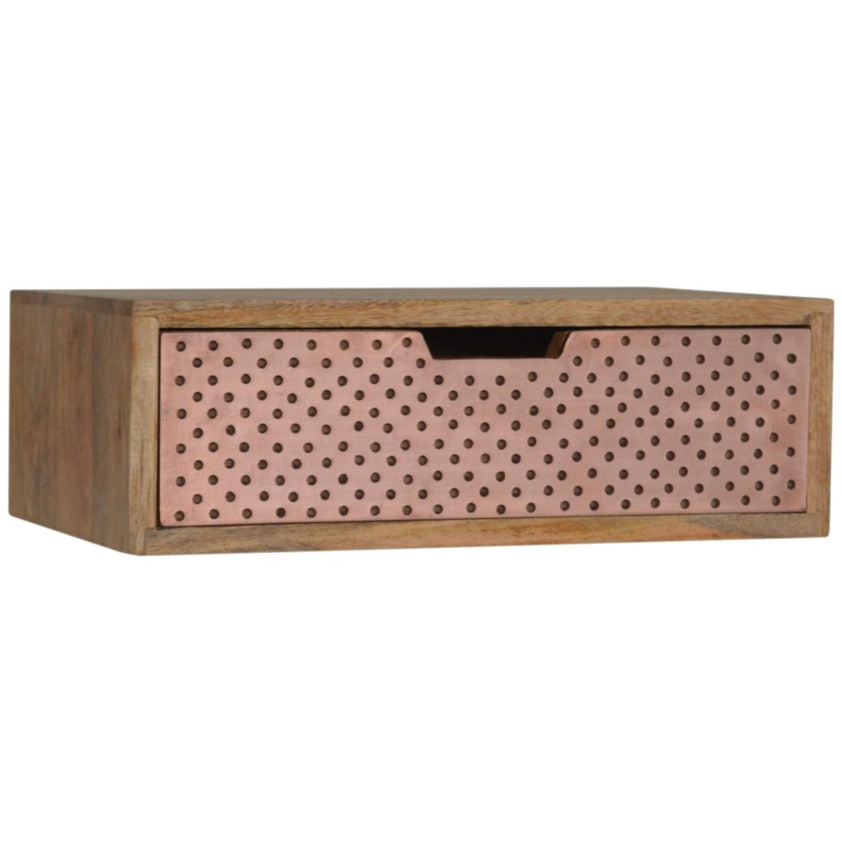 This wall mounted unit has been constructed from 100% solid mango wood in a oak-ish finish and features 1 copper front drawer and a cut out access for easy access in to and from the drawer. This piece is perfect for storing any bits and pieces you wish to keep close by before bedtime. It's neat and clean design can easily be mounted on the wall without the fuss of any legs. Caution! Do not sit on the unit.