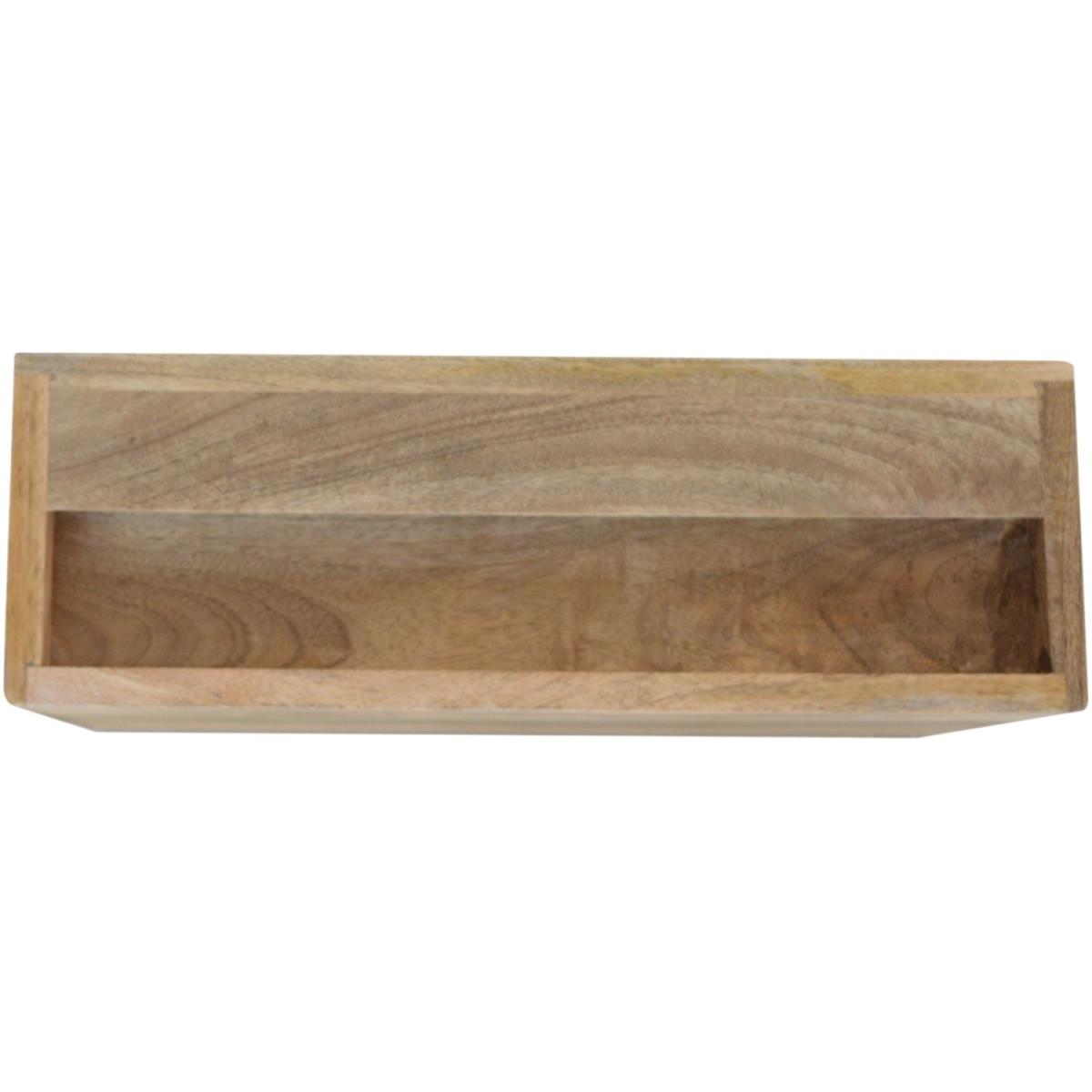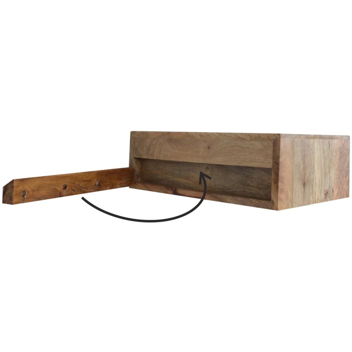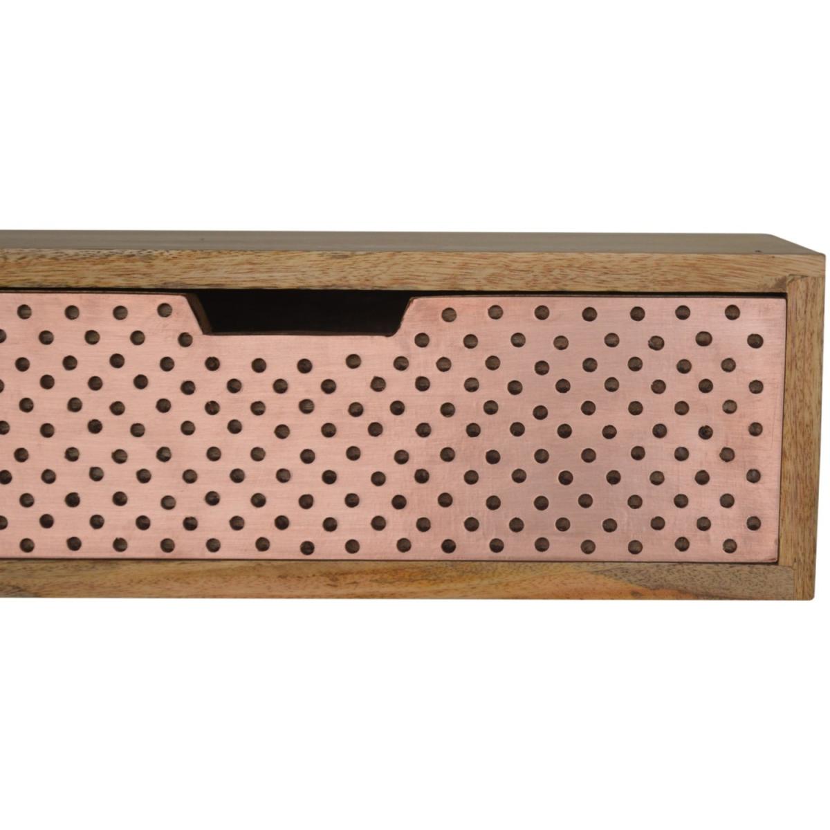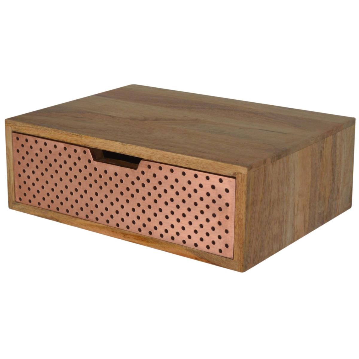 This wall mounted unit has been constructed from 100% solid mango wood in a oak-ish finish and features 1 copper front drawer and a cut out access for easy access in to and from the drawer. This piece is perfect for storing any bits and pieces you wish to keep close by before bedtime. It's neat and clean design can easily be mounted on the wall without the fuss of any legs. Caution! Do not sit on the unit.