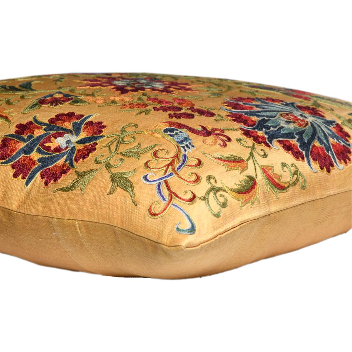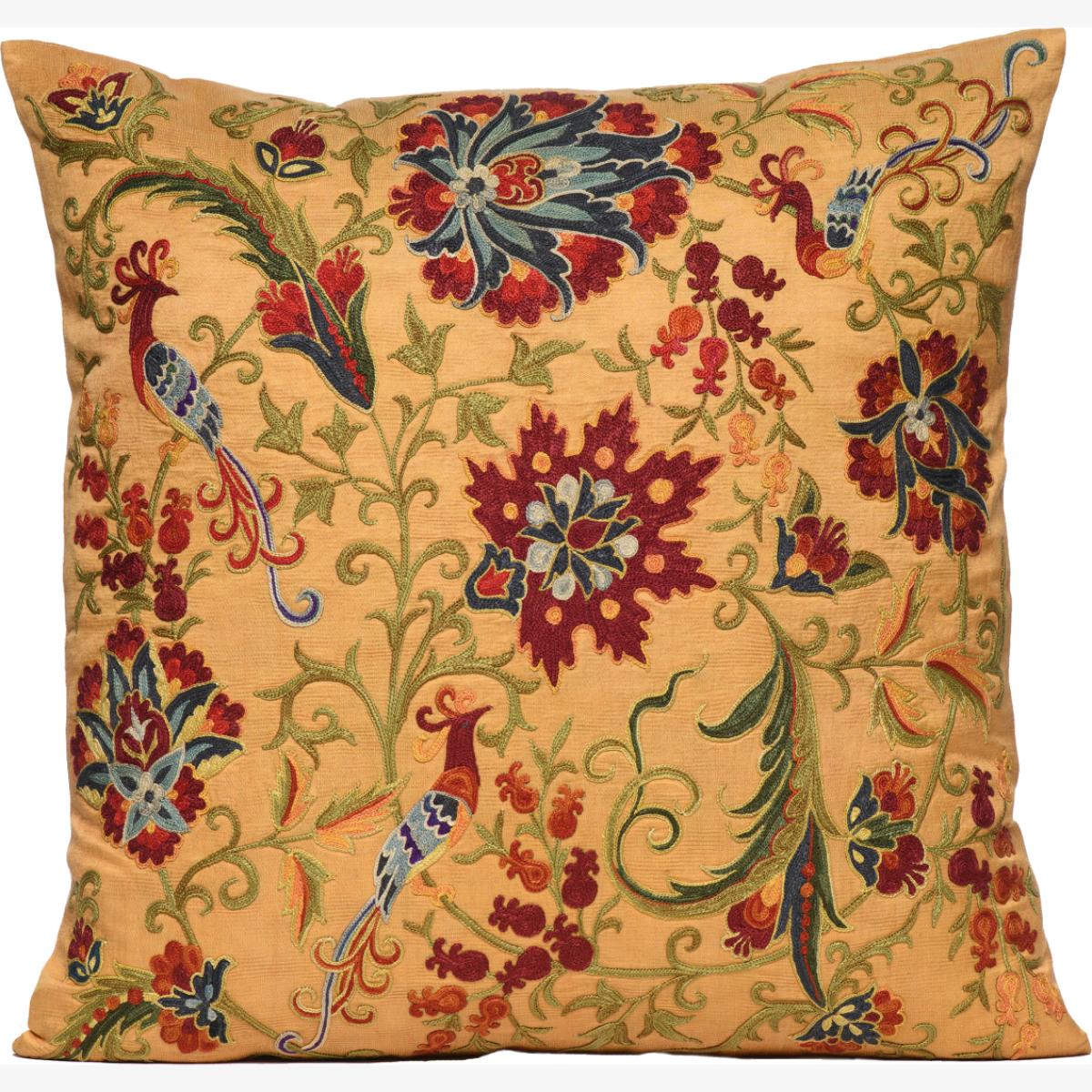 Our luxurious embroidered Birds of Paradise cushion has been inspired by original design motifs of Uzbek Suzanis that have been individually hand-embroidered onto the hand-woven silk-cotton fabric. Each item is made with a tremendous amount of care and with our own heritage rooted in Uzbekistan, we work directly with artisans that we know and who are among the most talented in their field. Due to the hand-made nature of our cushions, there may be slight variations in patterns and colours in the material, which all adds to the unique nature of each item.