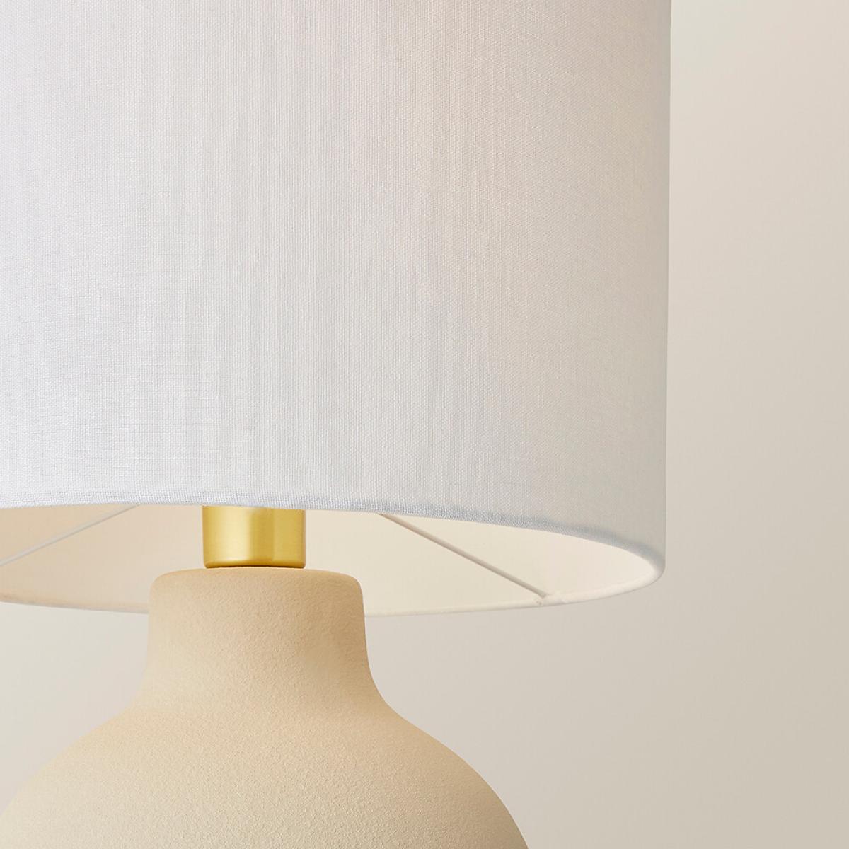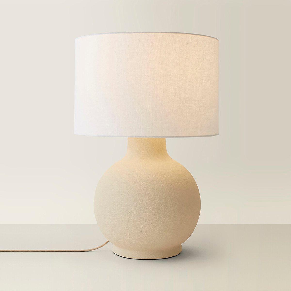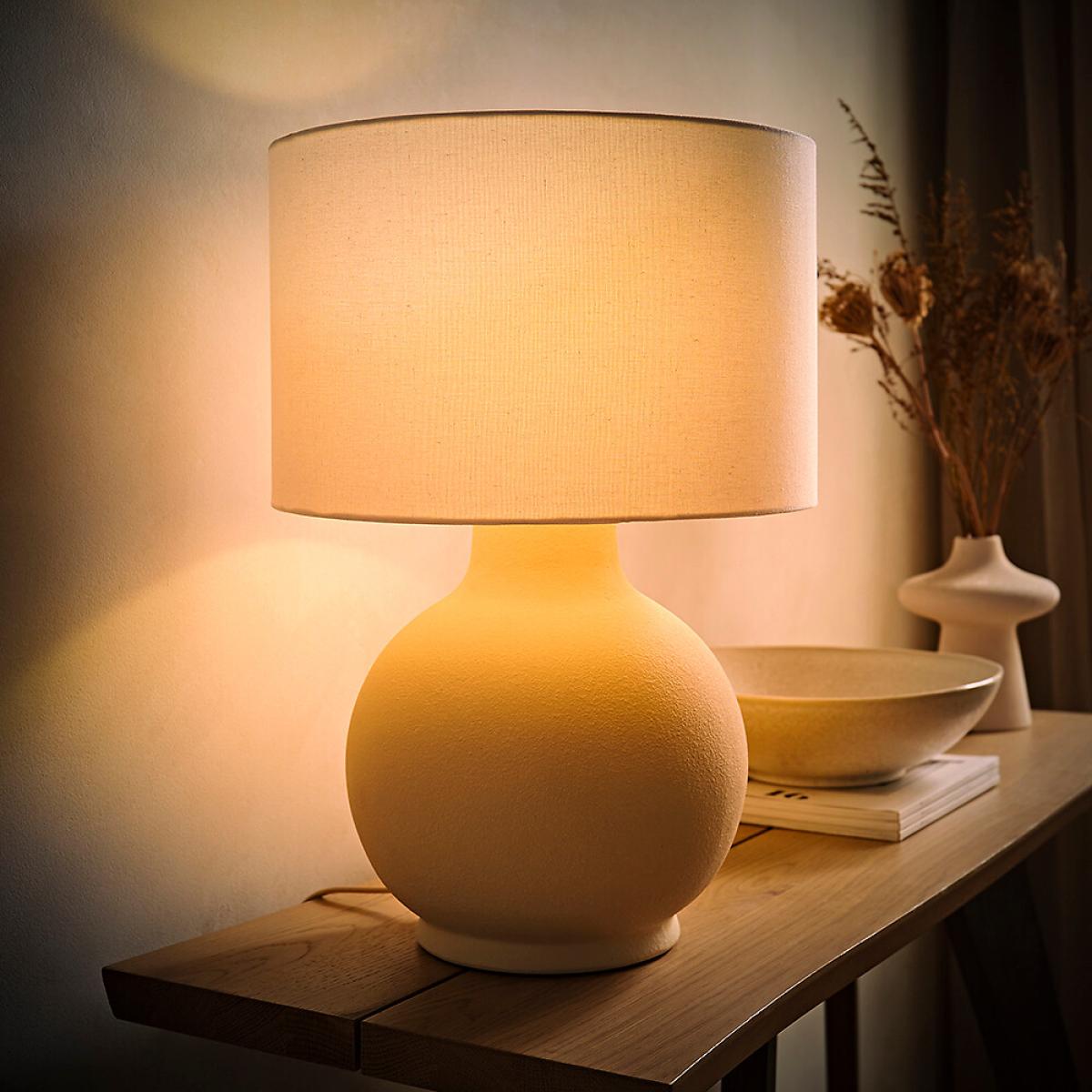 With a hand-finished round beige ceramic base, this lamp brings texture and charm to any room. The metallic cap and colour-matched fabric cable keep things chic and coordinated, while the linen shade softens the light for a warm, cosy atmosphere. This lamp's the perfect mix of elegance and functionality, making her a must-have for those who like their lighting both classy and effortlessly cool.