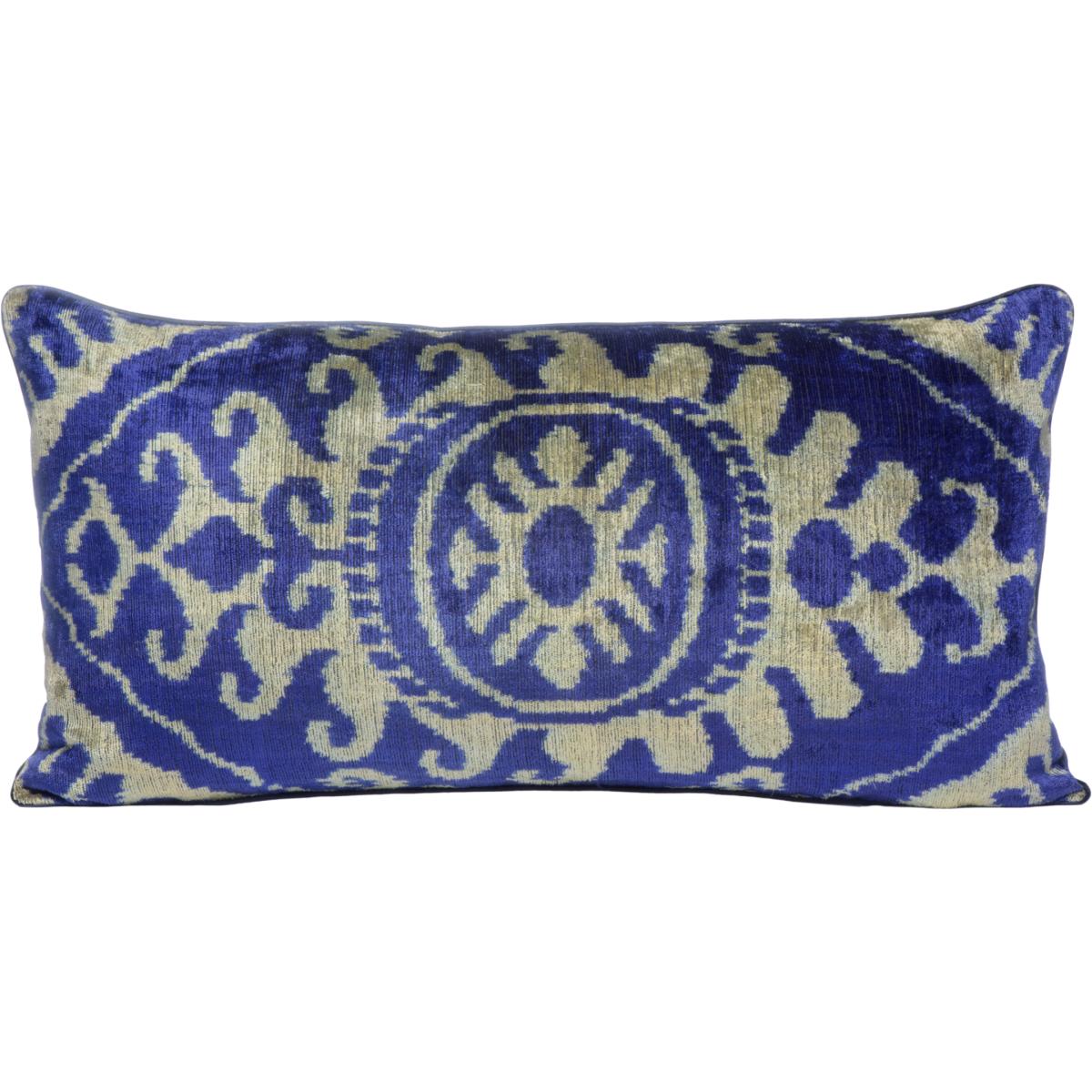 Theses stunning Royal Blue, Turquoise and Cream Ikat cushions are made from hand-woven and hand-dyed silk velvet fabric, known in Uzbekistan as Bakhmal. It is a velvet fabric with a silk pile, based on a silk and cotton background. The Ikat technique which is used to create this beautiful fabric produces a distinctive vibrancy of colour and design evident in these cushions. Due to the hand-made techniques used in the creation of our fabrics, there may be slight variations in patterns and colours in the material, which all adds to the unique nature of our cushions. Double faced Velvet Ikat cushion finished with dark blue piping. Front in hand-woven Silk Velvet, reverse in hand-woven Silk Ikat fabric.