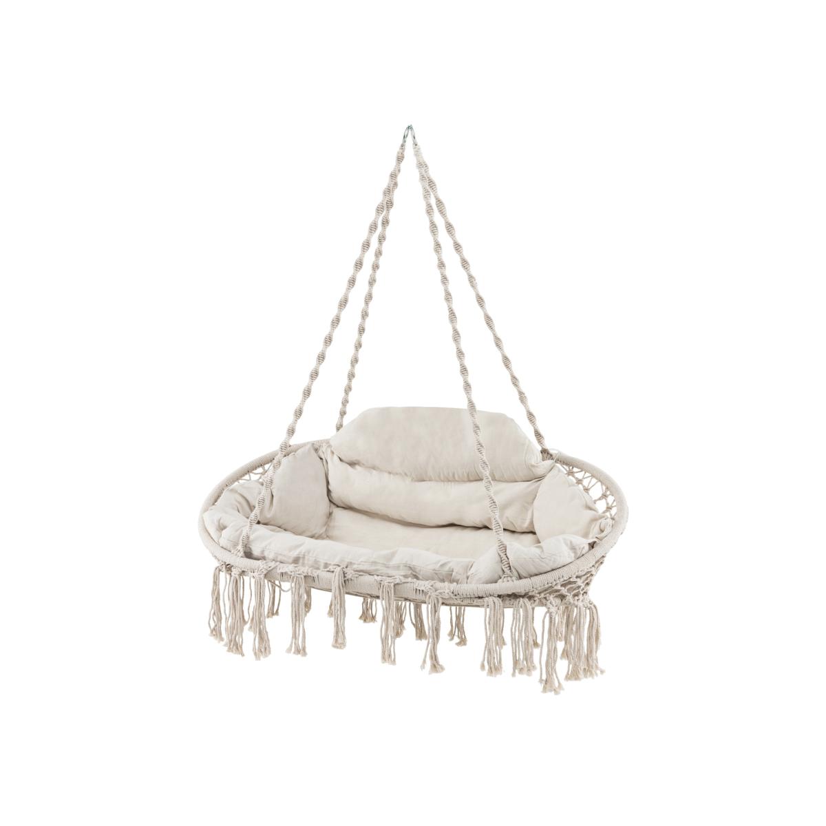 This swing chair offers an ultra-thick cushion crafted from premium poly-cotton, designed to be easily detached for hassle-free maintenance. The swing chair's long-lasting folding metal frame, capable of withstanding weights up to 150 kg, folds compactly for space-saving storage. Exquisitely woven with a dual-layer braid and an 8-strand spiral pattern, the ropes provide both strength and a sophisticated aesthetic. Hand-Woven Rope Hanging Chair with Thick Cushion - White