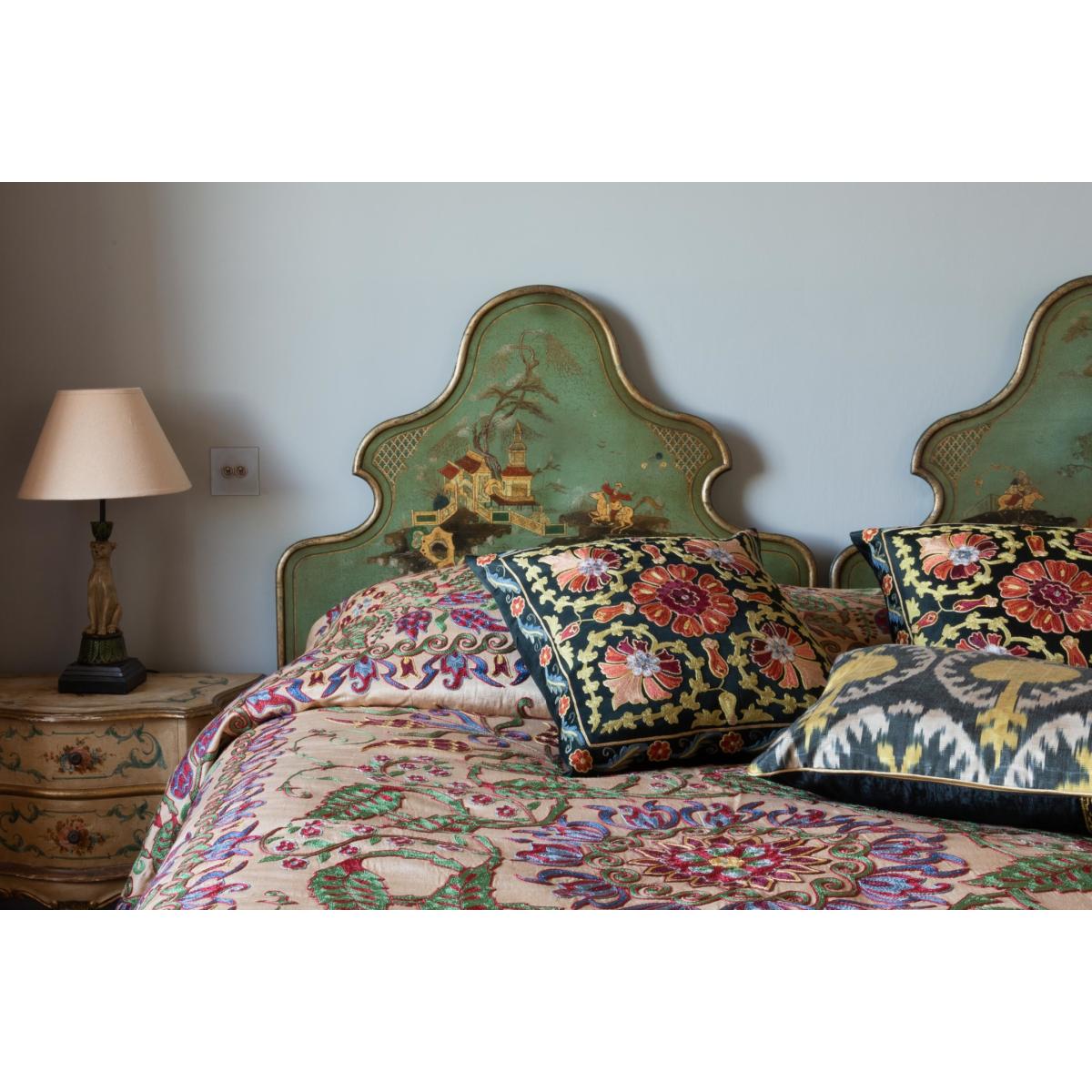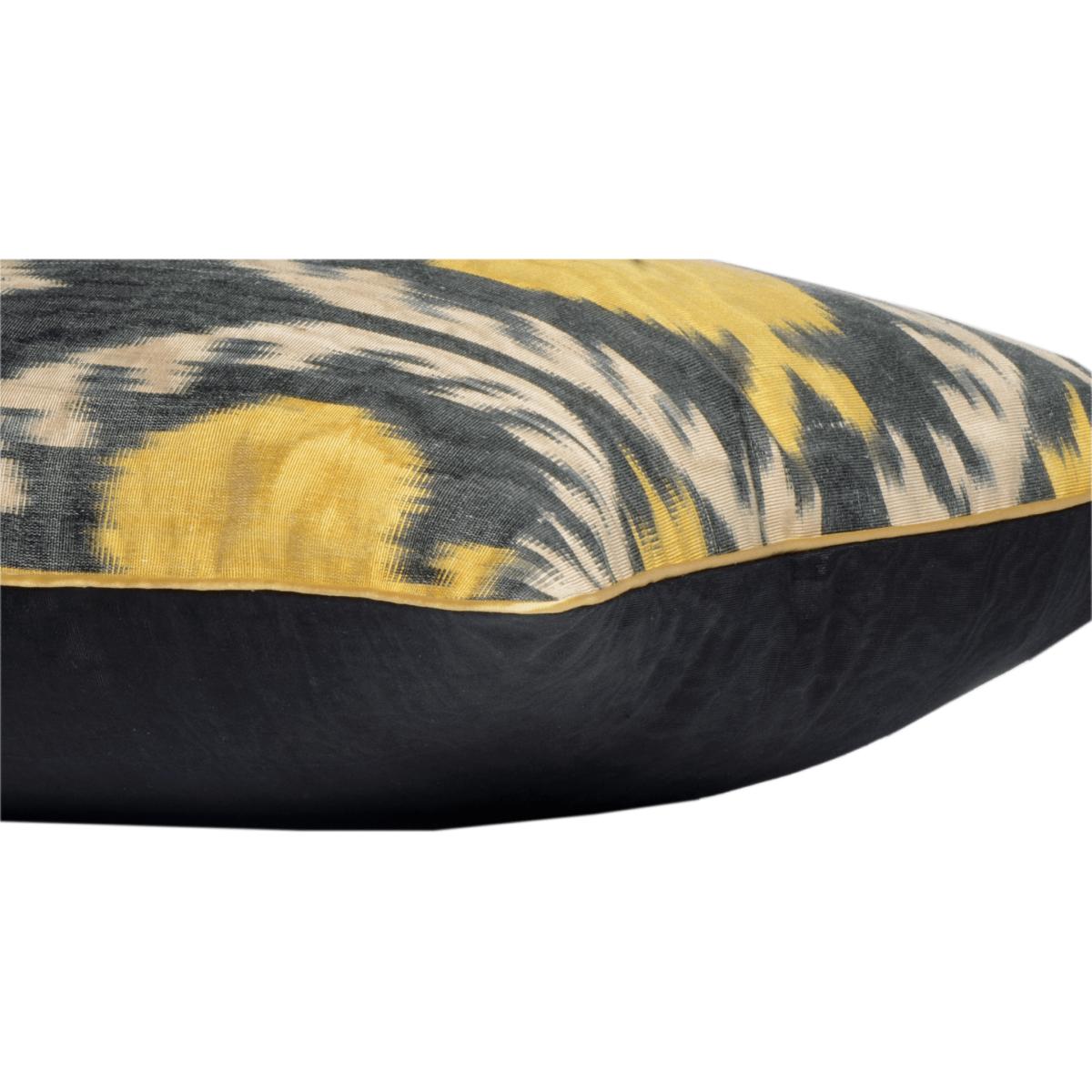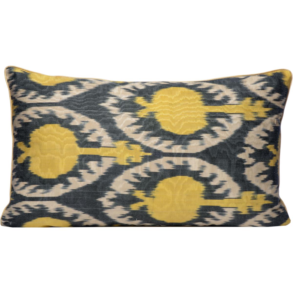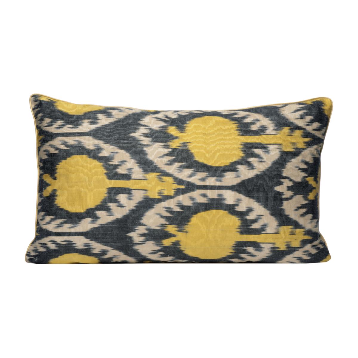 To create our beautiful Silk Ikat - Yellow Pomegranate cushions, we use hand-woven and hand-dyed fabrics known as Ikat materials. In Uzbekistan the Ikat technique is called Abrband, which is an ancient way of creating designs in fabric by resist-dyeing the threads before the fabric is woven. This technique produces a distinctive vibrancy of colour and design.