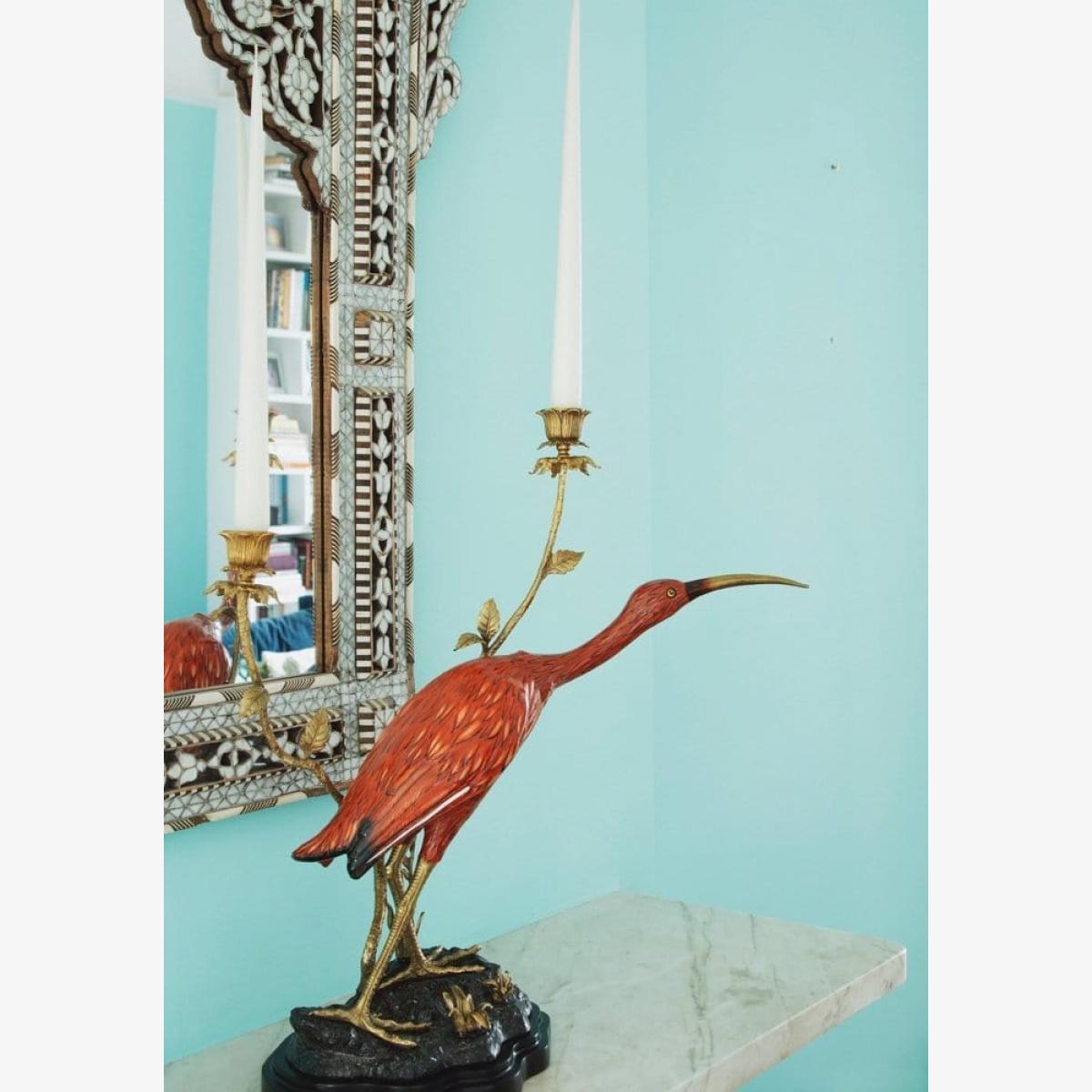 This exquisite candleholder showcases the delicate art of cloisonné enameling, featuring a graceful red ibis in mid-stride. Fine copper wires create intricate compartments filled with vibrant red enamel, capturing the bird's distinctive form and elegant neck curve. The ibis stands proudly atop a brass base, its long legs supporting a brass candleholder designed for standard taper candles.