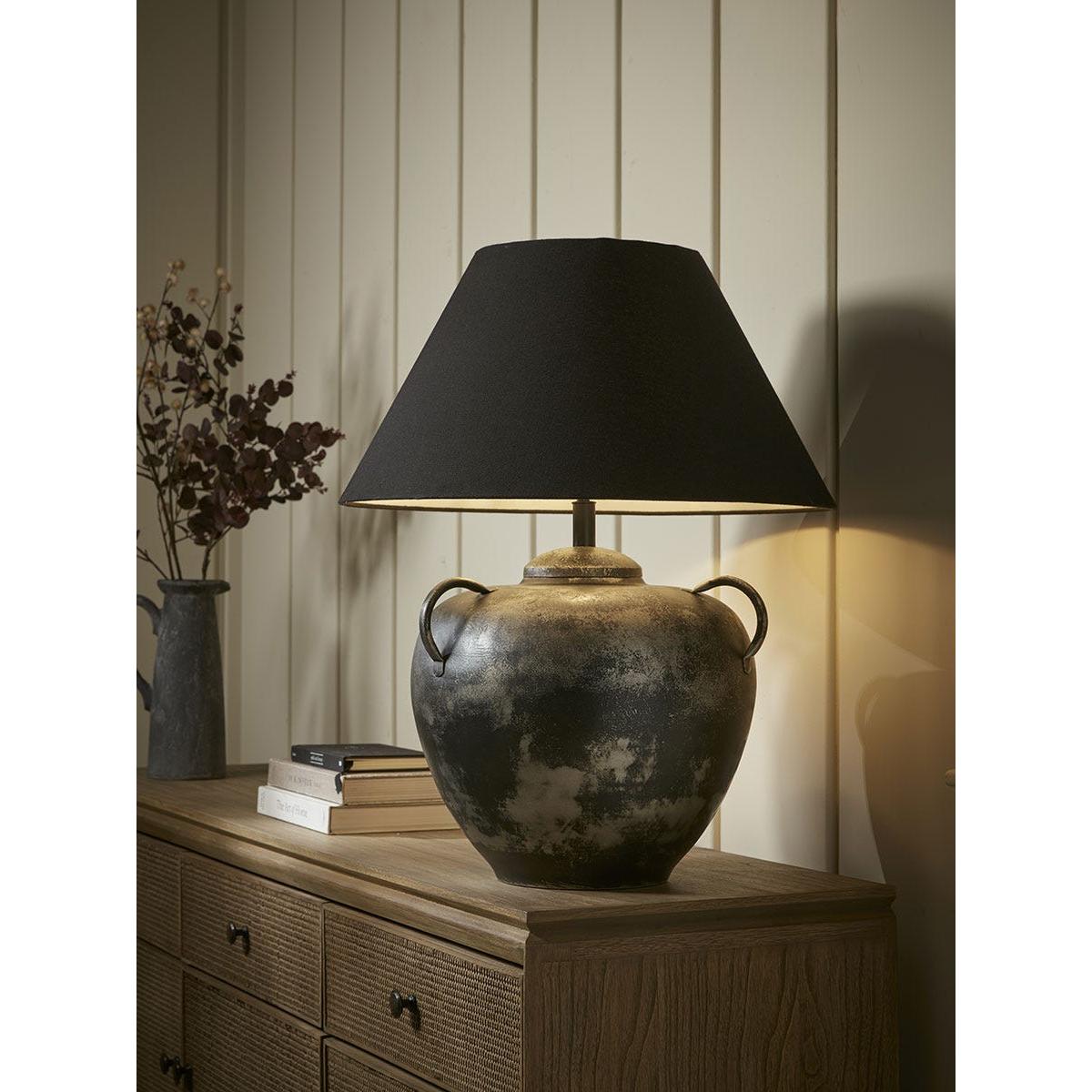 Rustic charm radiates from this table lamp, with a base crafted from iron that has a heavily distressed finish. Contrasting tones of black with the natural iron colour work to create an individual look on each lamp. Finished with two handles and a black cotton shade, this lamp has a refurbished look, perfect for a home that is inspired by a unique and eclectic style, akin to that of our English Rustic trend. Discover how to create the perfect lighting scheme for your home using our Lighting Buying Guide.