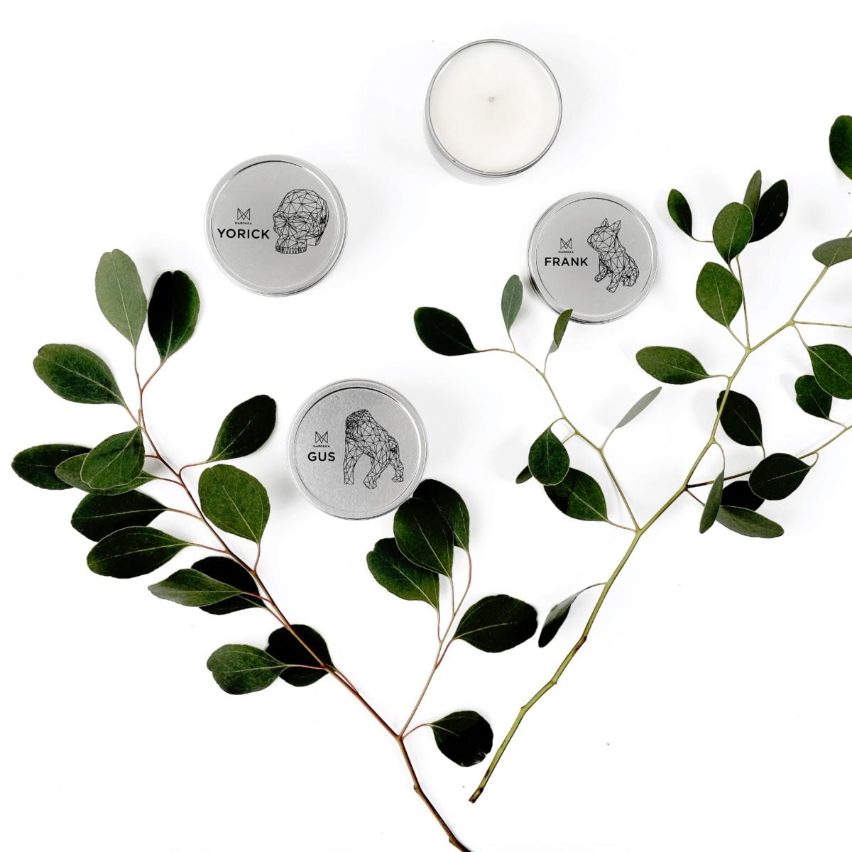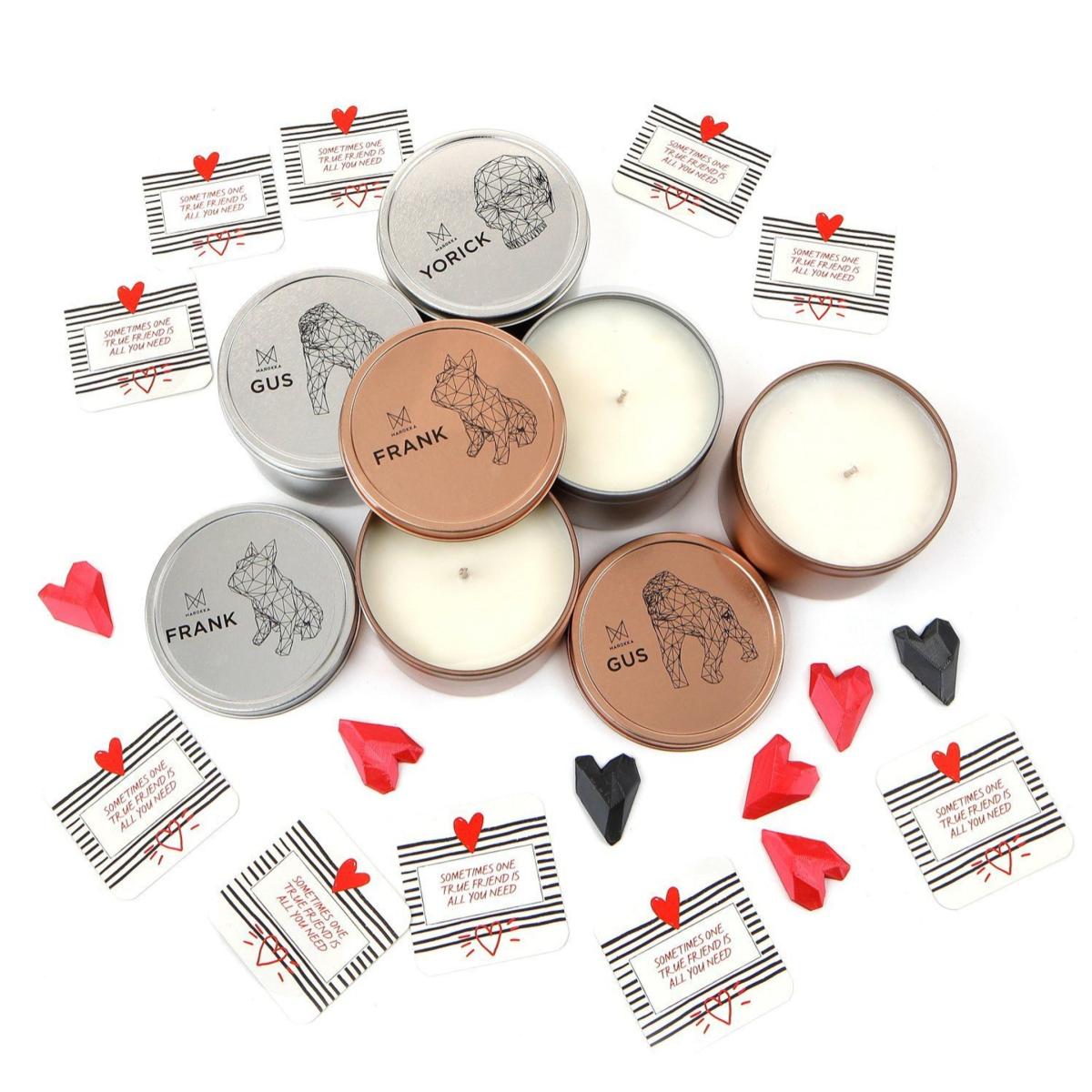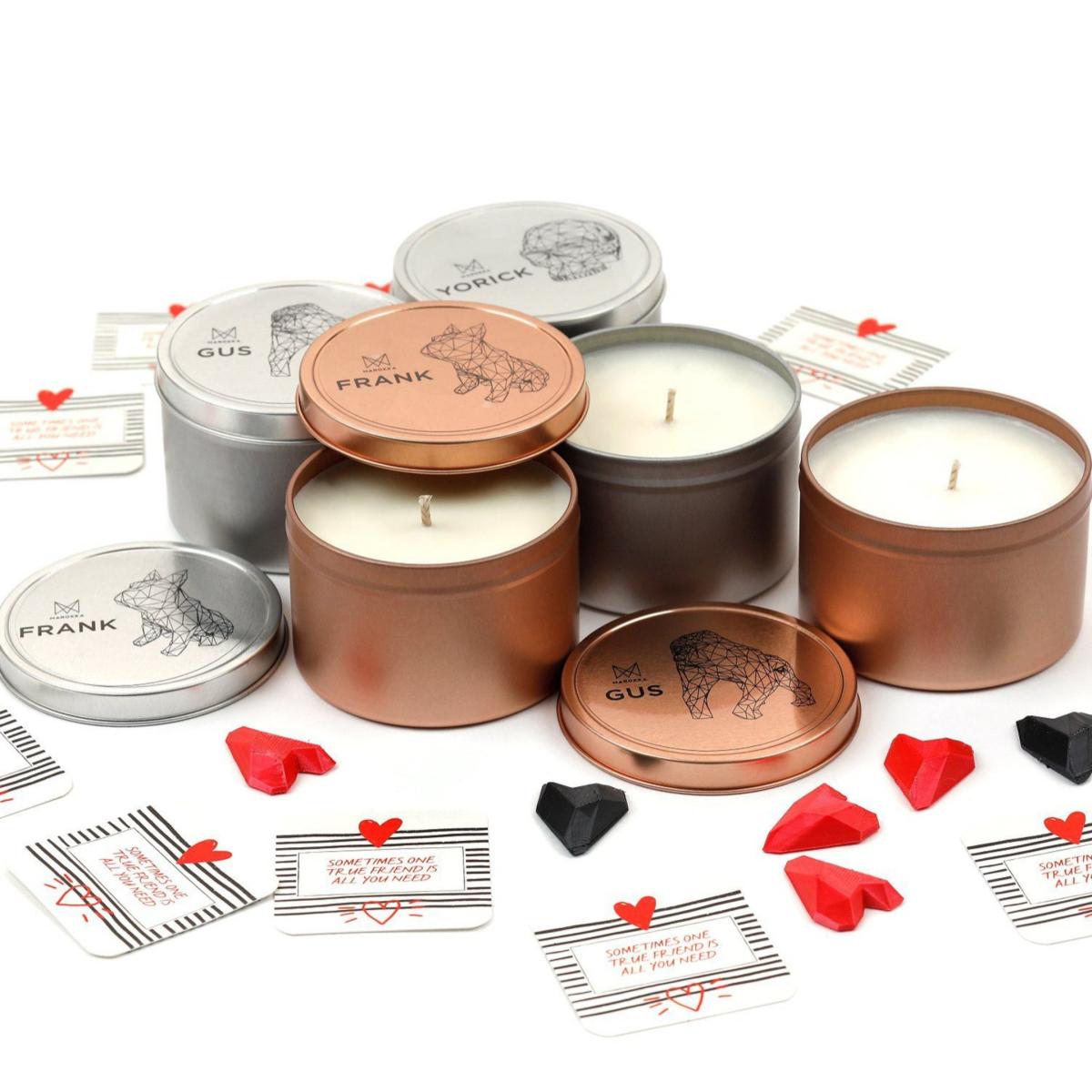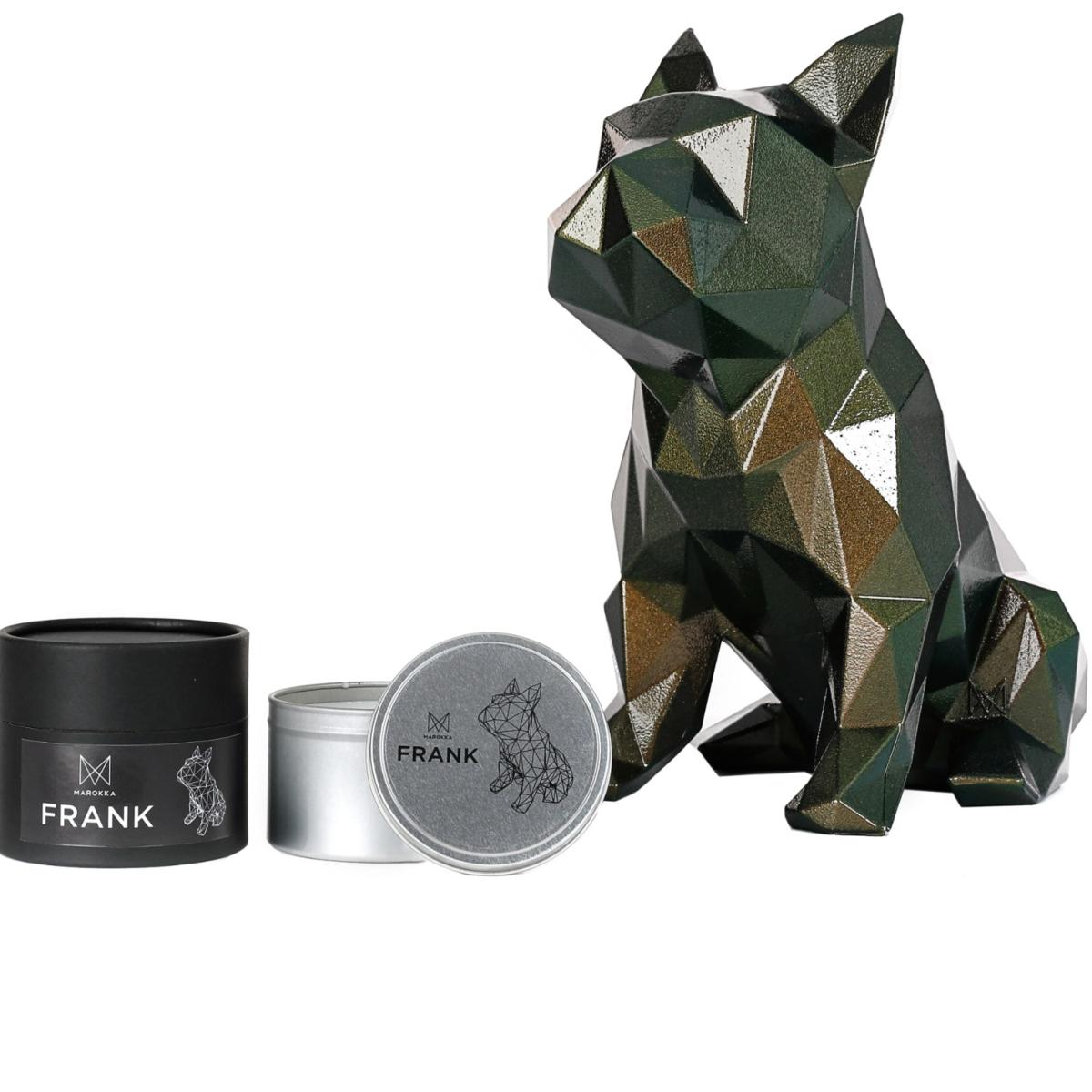 Inspired by the origin of Frank the French Bulldog, this gorgeous scent evokes memories of England and France. The Frank candle scent starts with notes of peony and red apple followed by generous notes of rose, jasmine, and carnation. This beautiful floral fragrance is expertly completed with soft notes of violet and plum on a base of musks and dry amber. It is a natural wax scented candle in a reusable tin container complete with geometric heart and message, made and designed with love in England - a candle for life. Please note Frank sculpture is for display purposes only and can be purchased separately.