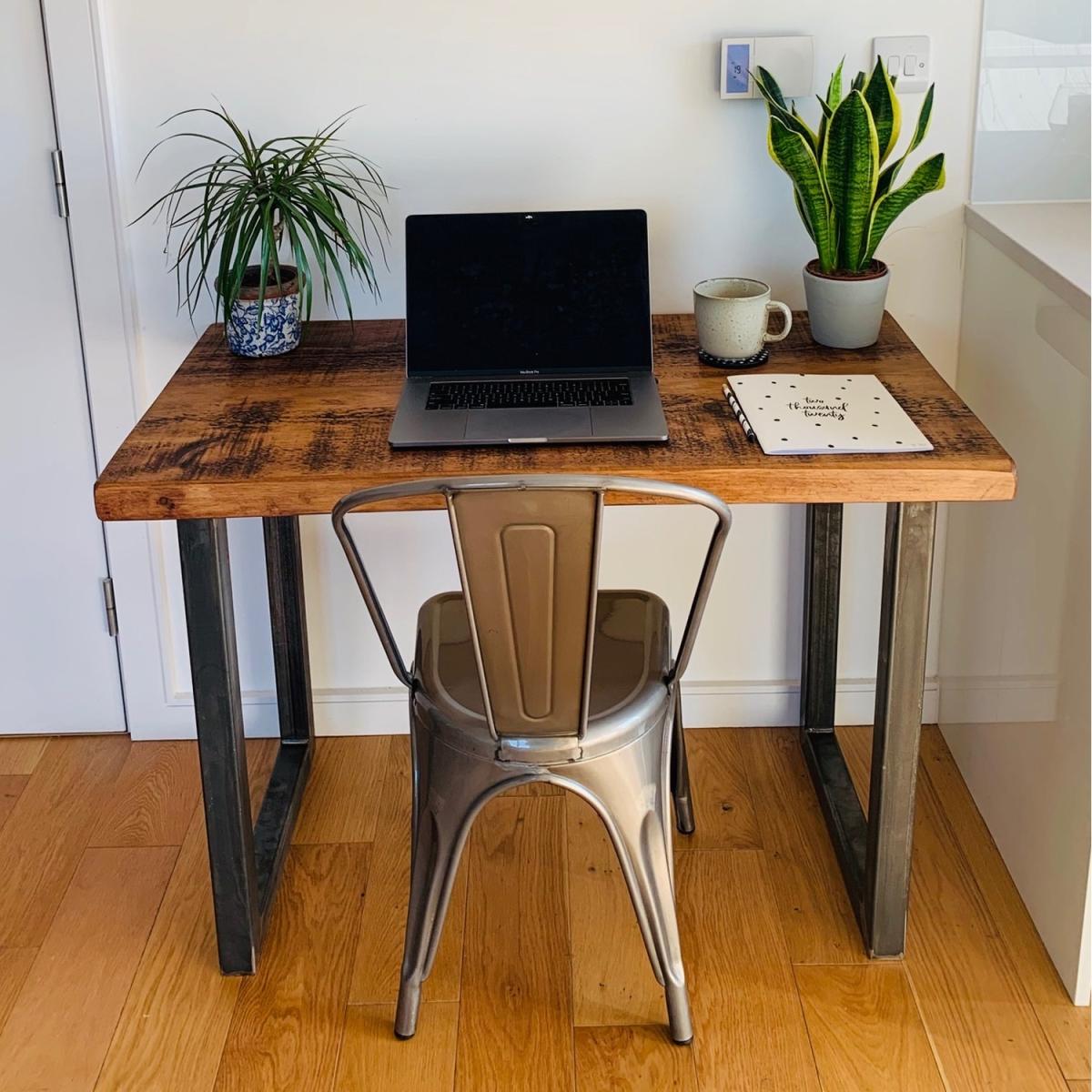 I’m a fan of this rustic-industrial desk for its mix of warm, reclaimed-look timber and sturdy black metal legs - it brings just the right balance of texture and structure to a workspace. At around 80 cm wide, it’s ideal for compact corners, loft-style flats or a pared-back home office where you don’t want an overbearing footprint. Styling-wise, keep your colour palette neutral: a slim black task lamp, monochrome notebook and one or two potted plants will enhance the industrial vibe without cluttering the surface. Fit a discreet cable tray underneath to hide plugs, and if you need extra storage, mount a simple shelf above the desk rather than crowding the floor. That way you’ll maintain a clean, purposeful look while still feeling inviting.