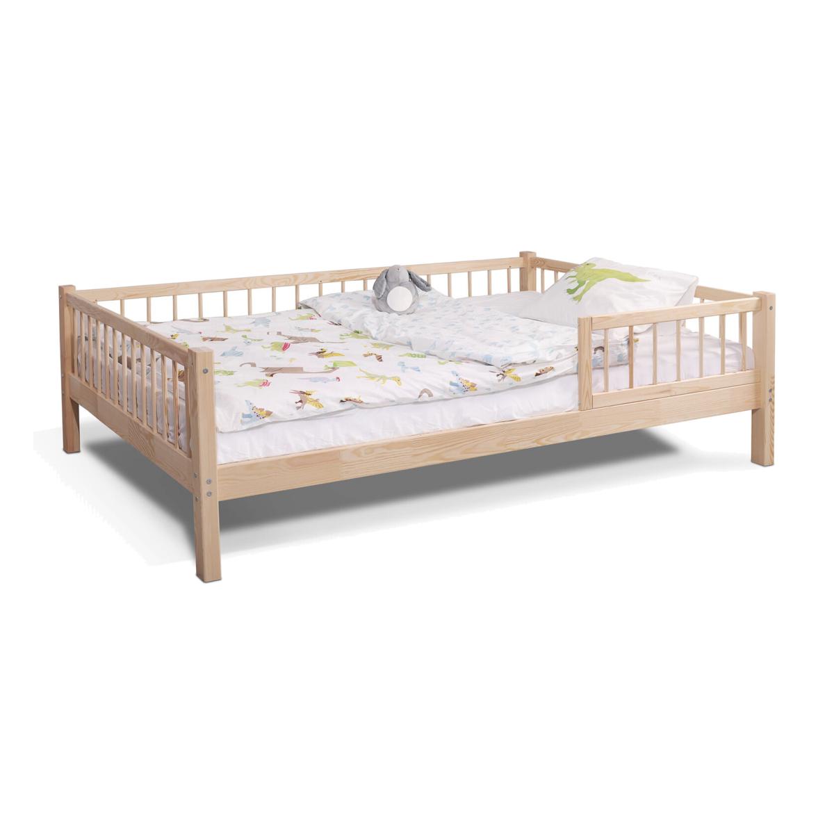 Montessori bed with safety barrier and baby safe finishing. This high quality toddler to child bed will look great in any boy's or girl's bedroom with it's minimalist modern design. It is handmade in Europe using FSC certified A grade pine wood from sustainable sources giving a strong finish that will last. The slats are included so you only need to add a mattress. The bed posts have a thickness of 65mm x 45mm and the beams are 90mm x 20mm. The post height is 60cm with the barrier height being 30cm.