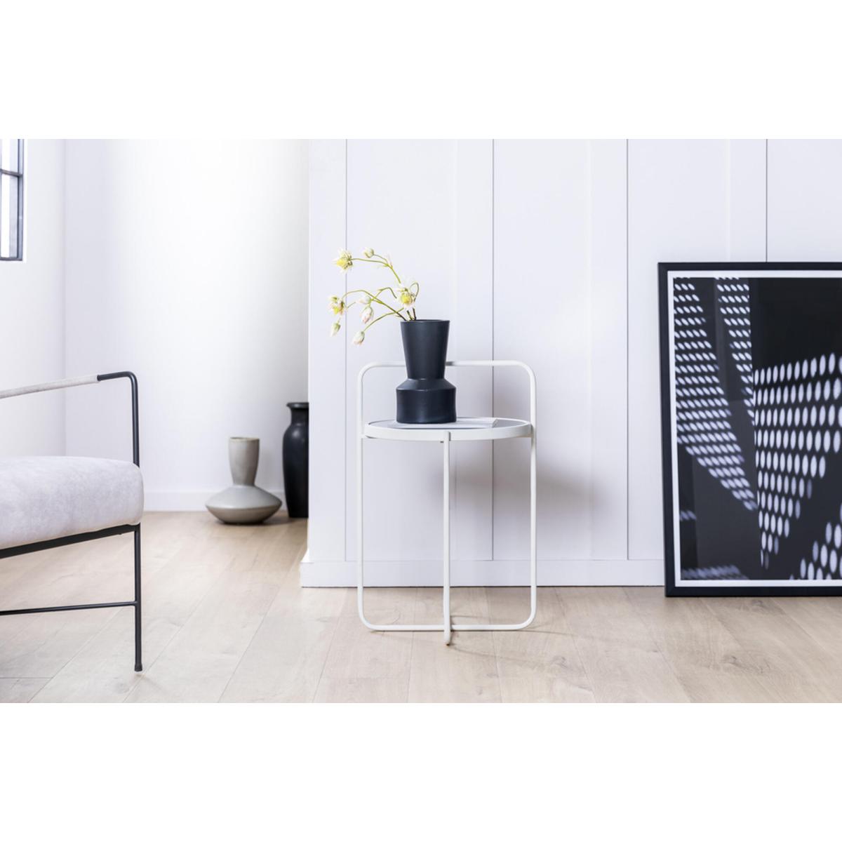 I love this side table for its clean, minimalist design that works well in a variety of interiors. Its white finish makes it highly versatile, perfect for modern, Scandinavian, or even eclectic settings. Using it next to a sofa or bed, it offers practical surface space for a lamp, books, or a drink. To style it effectively, consider adding a small plant or decorative object on top to soften the look, or pairing it with contrasting textures, like a colourful cushion or a textured rug nearby. Its simple structure also means it can comfortably sit in both small spaces and open-plan areas without overwhelming the room.