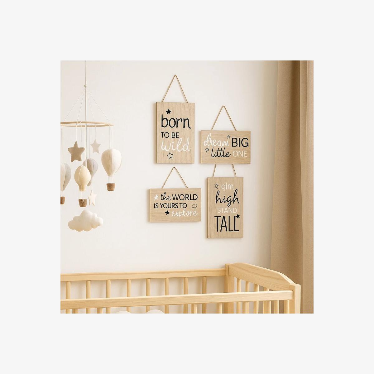 Make your babys room one you will never want to leave. These 4pc signs are sure to bring your babys room together. Made from hard wearing and durable wood and rope, these signs can be hung anywhere in your nursery with inspirational words for them to grow up with. Have them scattered, in a line or bundled together above them while they sleep.