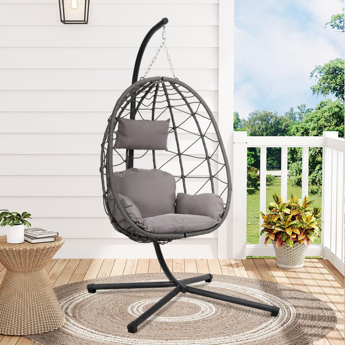 Transform your outdoor relaxation with this stylish hanging chair! Its egg-shaped design comfortably accommodates one person, complete with a plush tufted seat cushion and a supportive pillow for the ultimate lounging experience. The soft, breathable cushions are perfect for year-round unwinding. With its elegant rattan frame, this chair not only offers comfort but also adds a touch of natural charm to any space, making it a stunning focal point on your patio, balcony, or even indoors. Hanging Chair with Cushion - grey / pe Polyester Steel