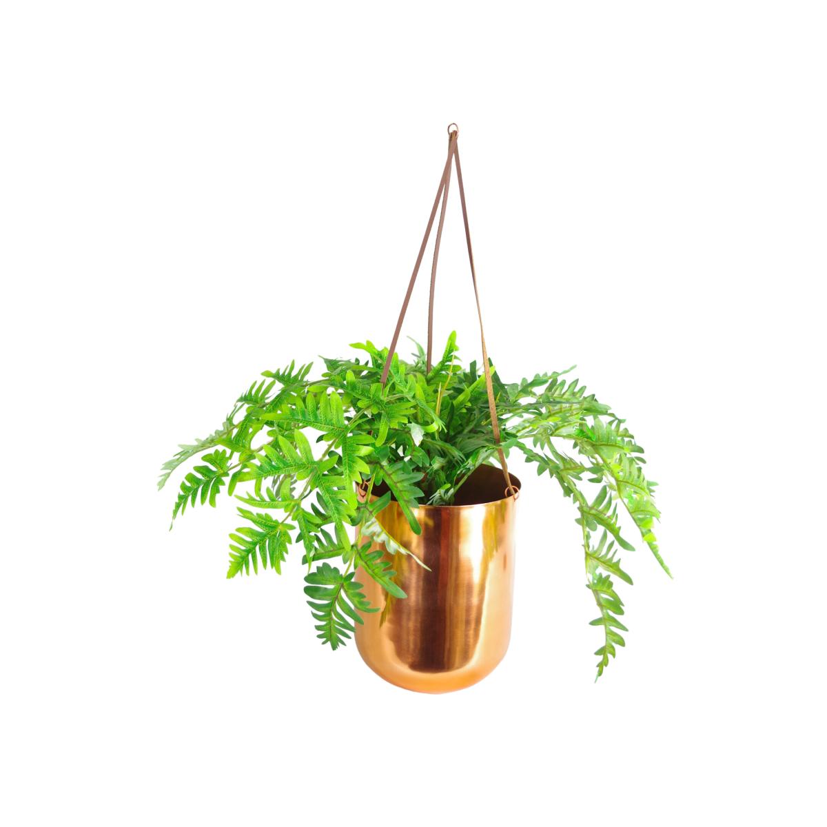 Hanging Copper Planter with Artificial Evergreen Fern Plant - Green