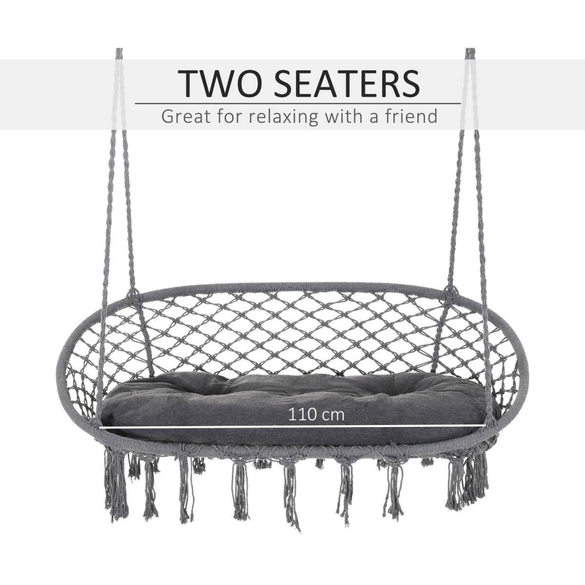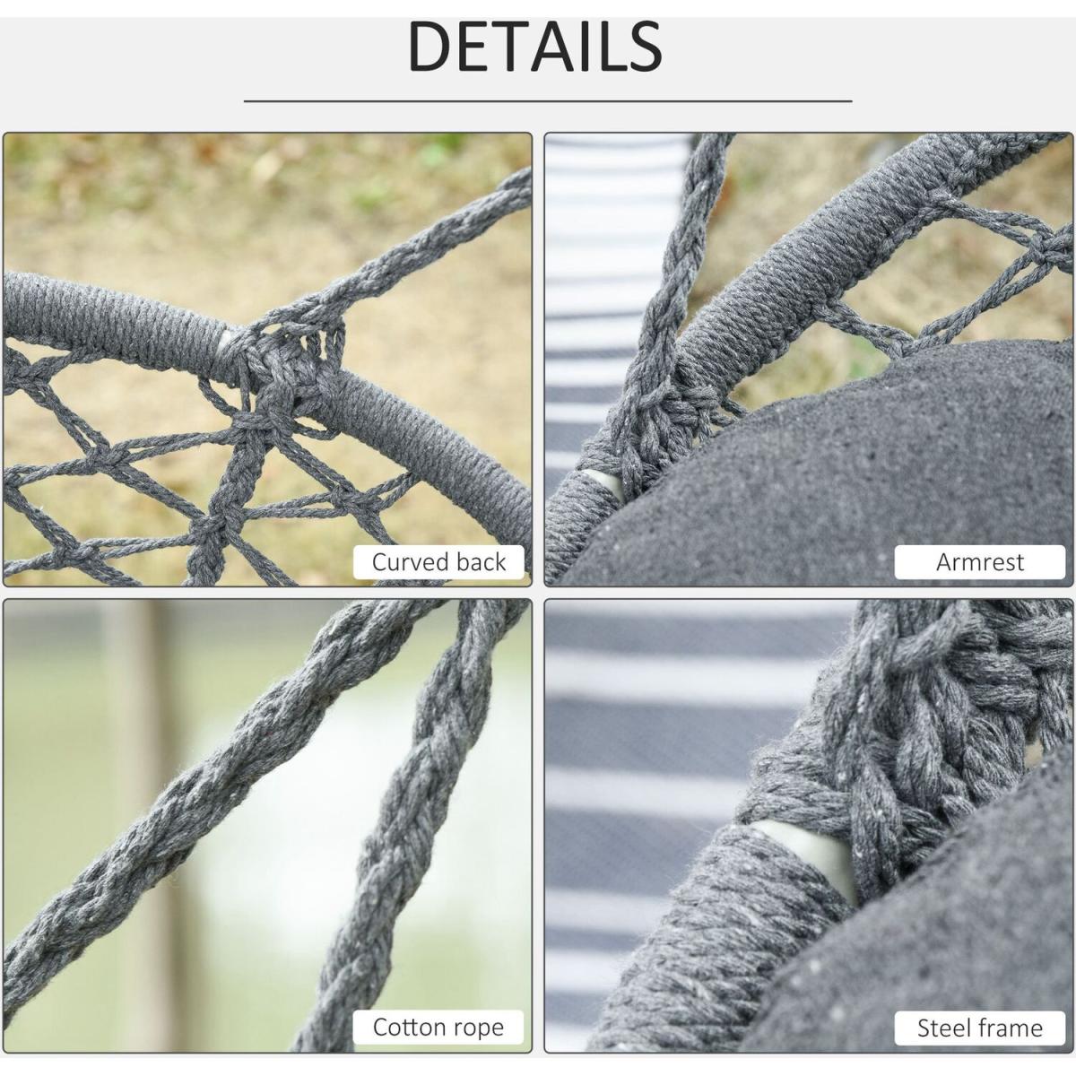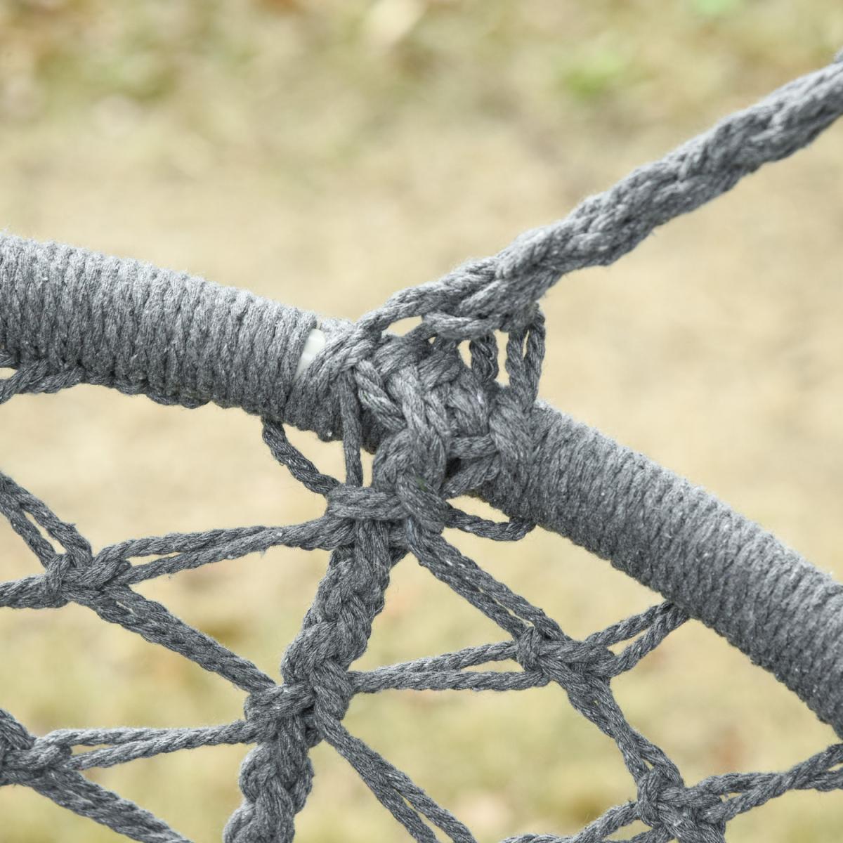 Infuse elegance into your indoor and outdoor spaces effortlessly with this hanging rope hammock chair from Outsunny. Boho style chair is crafted into a spacious two-seater design, where netting cotton rope forms the seat and back, and with fringe tassels for an attractive and unique looking. Made from metal for strength and reliability, the front seat is slightly curved for a comfortable seat, and with an armrest offering support when needed.