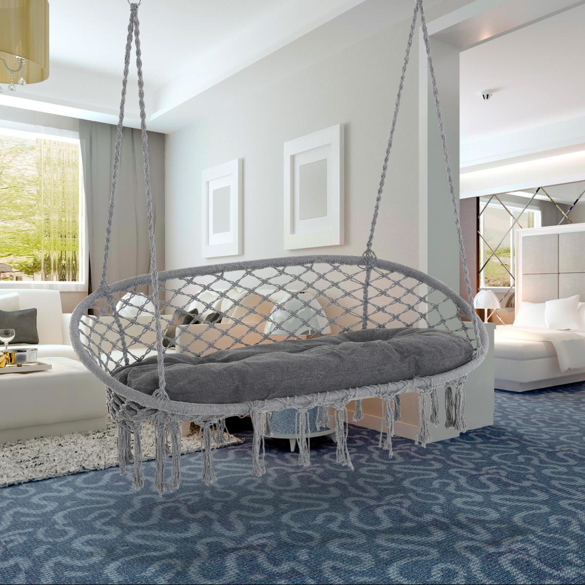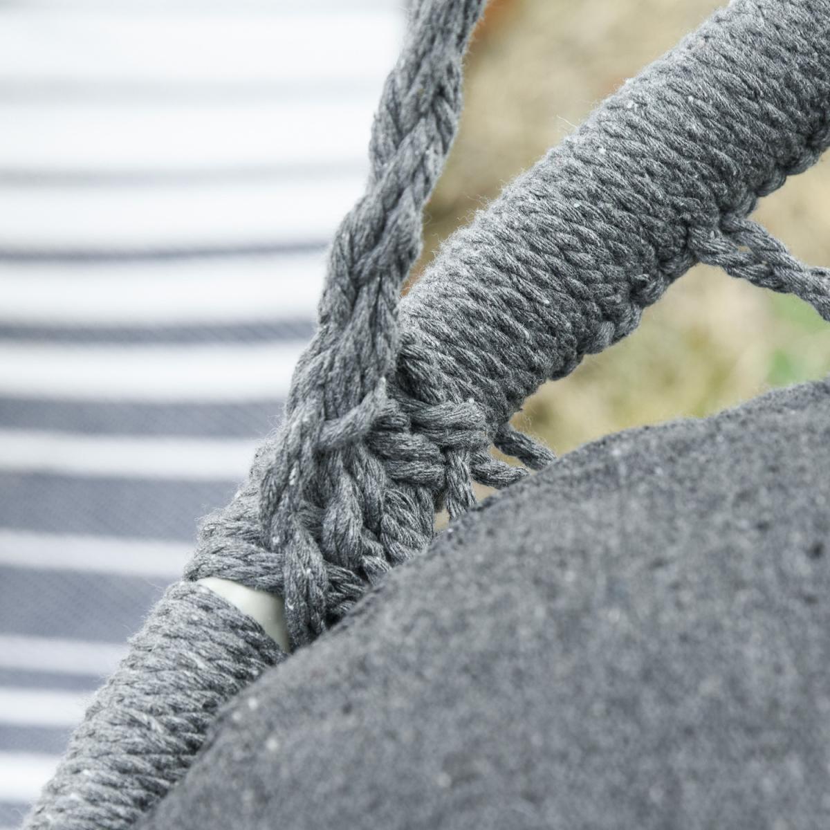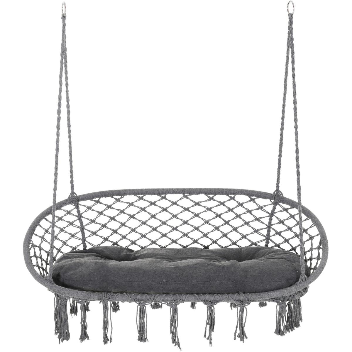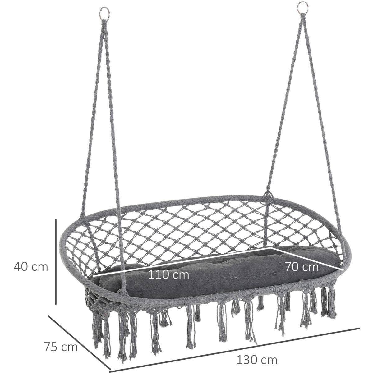 Infuse elegance into your indoor and outdoor spaces effortlessly with this hanging rope hammock chair from Outsunny. Boho style chair is crafted into a spacious two-seater design, where netting cotton rope forms the seat and back, and with fringe tassels for an attractive and unique looking. Made from metal for strength and reliability, the front seat is slightly curved for a comfortable seat, and with an armrest offering support when needed.