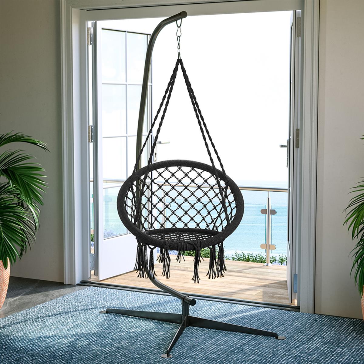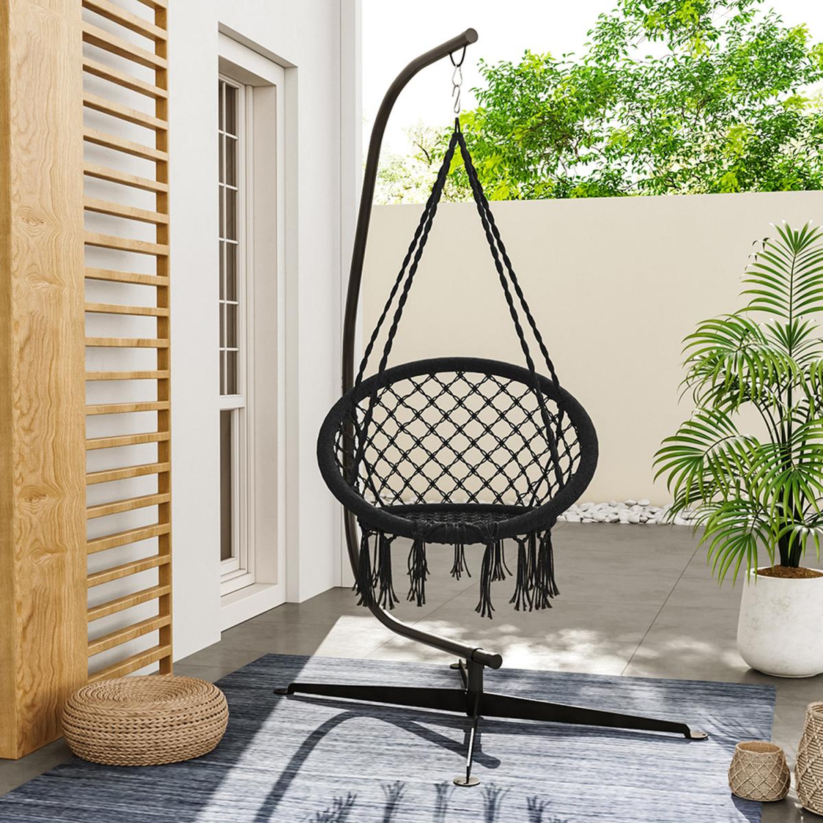 Cotton is hand-woven on a sturdy frame to enhance its robustness to ensure they are not torn or damaged, supporting up to 150kg of weight. You can enjoy charming sunshine in the comfortable swing chair(without cushion), stretching your body at full length and feeling free from gravity. In addition, there are two ways of hanging, you can hang it with a stand or just simply hook it on a ceiling or tree with a strong metal ring. You can use it outside on your balcony, terrace, backyard, you can read books, magazines, listen to the sound of crickets, birdsong, or enjoy a quiet night.