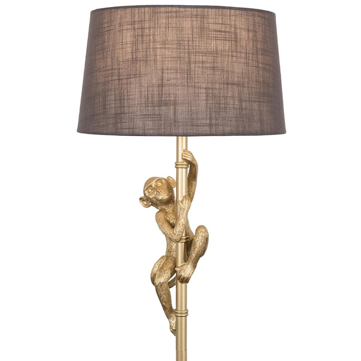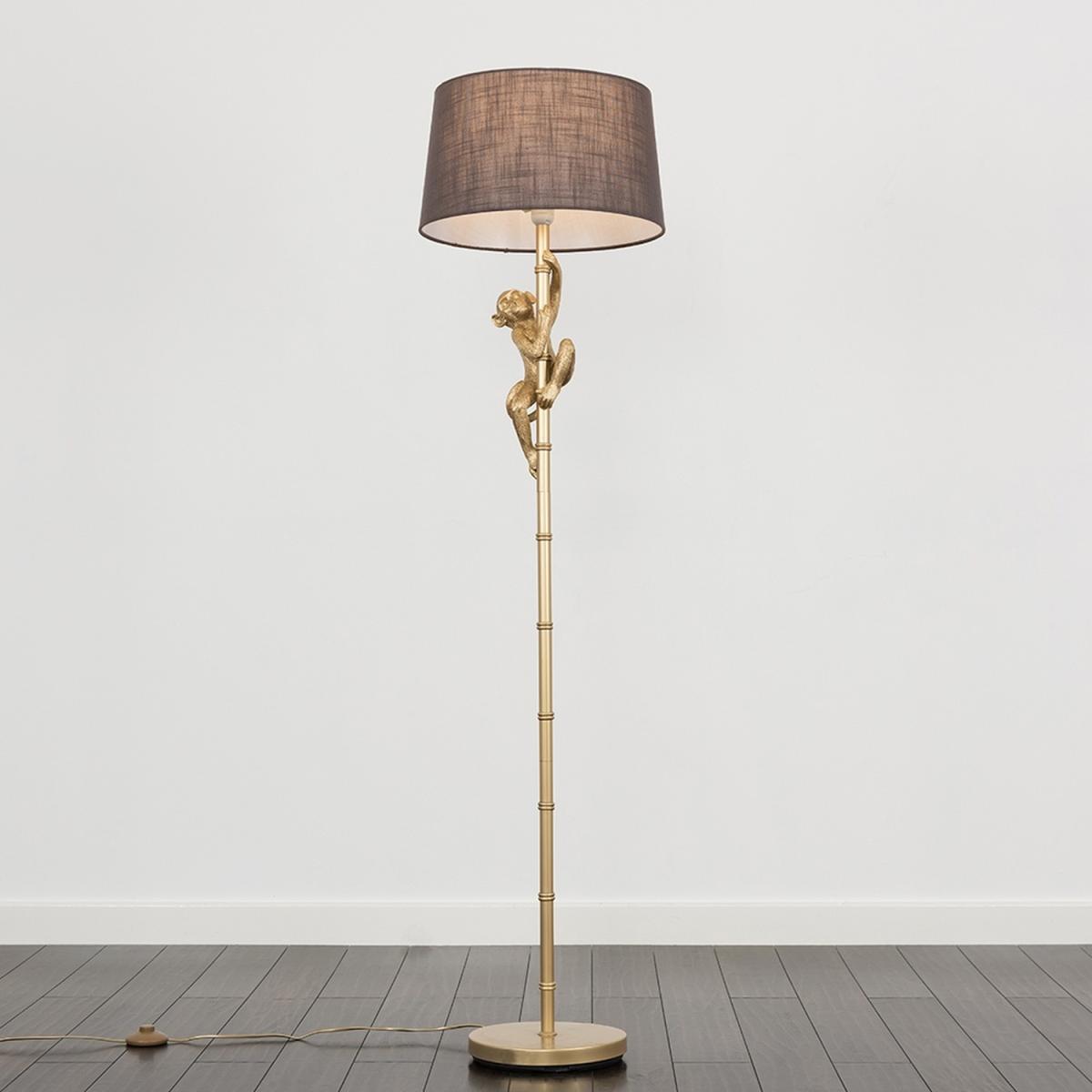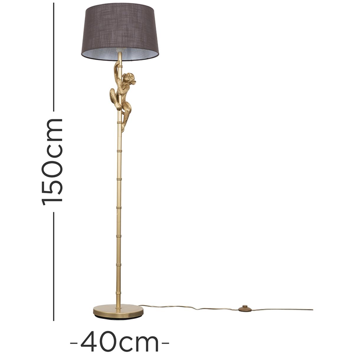 Modern floor lamp with a hanging monkey on the stem in a gold polyresin finish. Comes complete with a dark grey faux linen tapered lamp shade. Features an in-line onoff switch for easy use. This lamp is a great focal point - the right fitting can create a statement and complete your living space look. Ideal for lounges and other living areas.