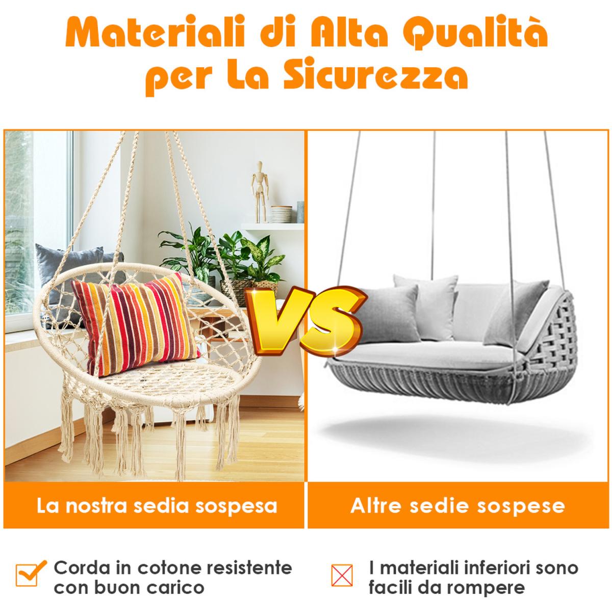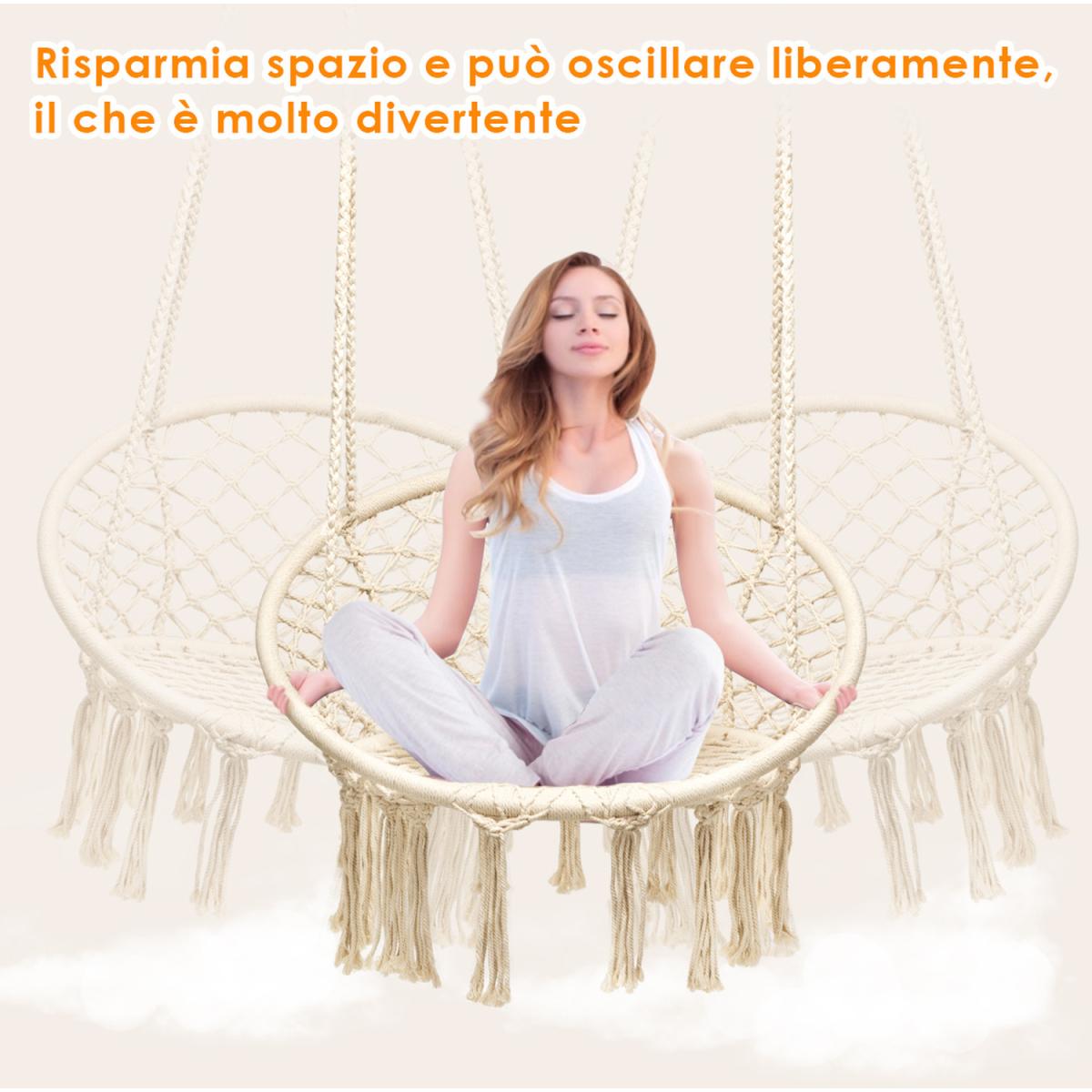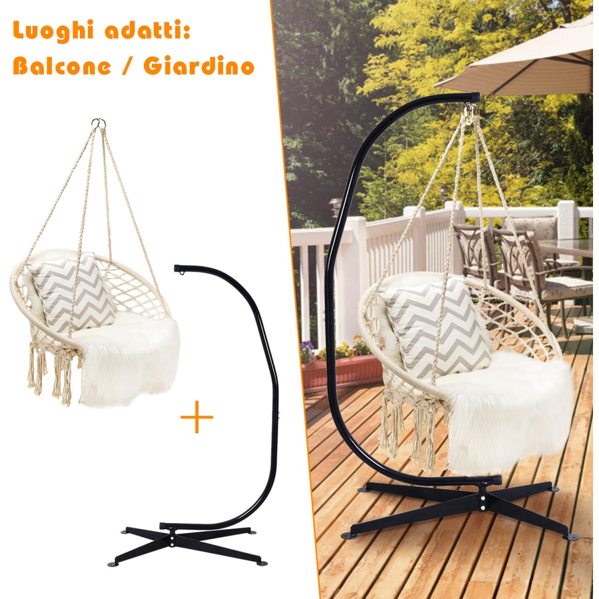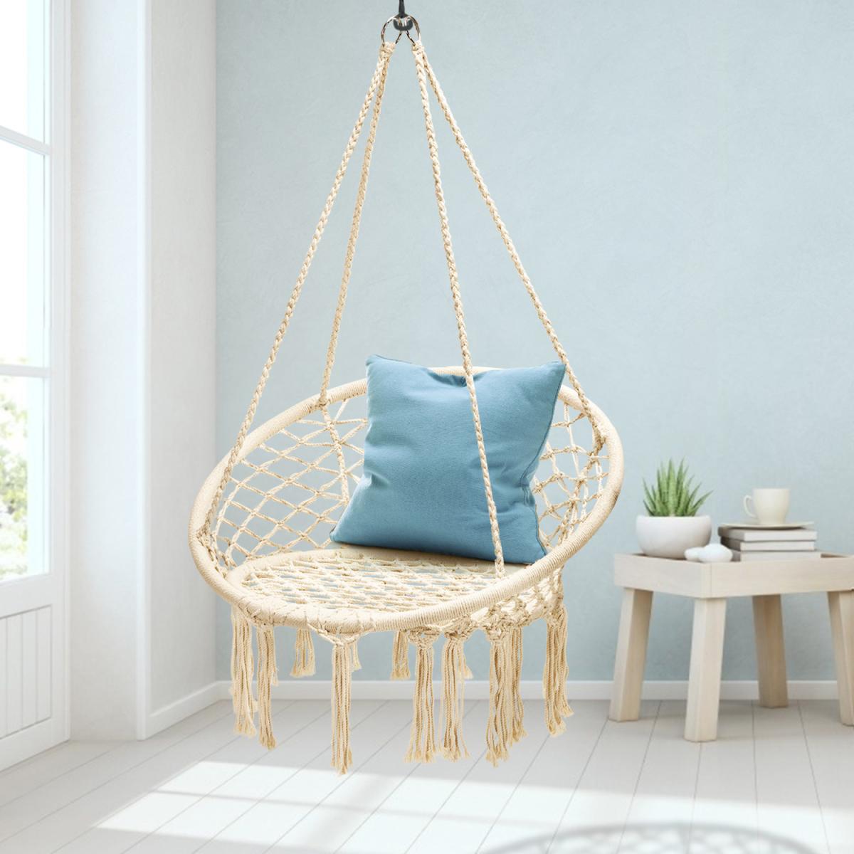 Relax and rejuvenate with this hammock chair! This hanging hammock swing is perfect for a quick snooze or a leisurely afternoon. Supported by a heavy-duty metal frame, it's comfortable and safe to use for anyone. Durable rope with metal hoops makes this seat stable and keeps it from falling or tilting while sitting in it. You can hang up your hammock chair with a hammock stand, or hang from ceiling, trees. Notice: the stand and hanging kits are not included in the package. Hope that this hanging hammock chair creates a warm ambience in your home or backyard.