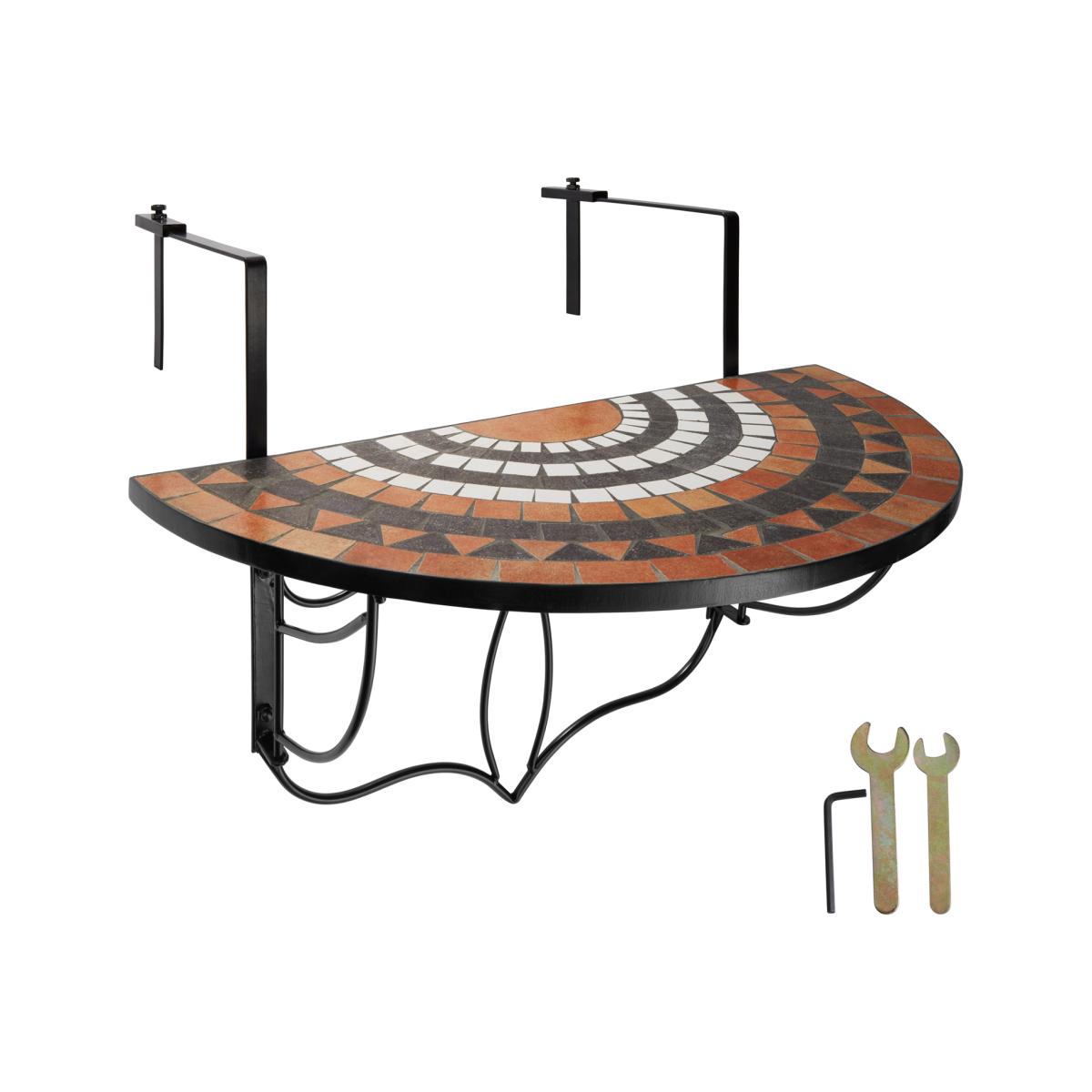 On tectake's balcony table, the best ingredients will always be within reach for a successful summer's day. The sturdy structure can be easily attached to the railing using two metal hooks. The semicircular surface with a mosaic pattern radiates a Mediterranean flair and offers lots of space. After use, the hanging table can simply fold up to save space. The indispensable accessory for a holiday on the balcony or in the outdoor home garden tectakes handy balcony table.