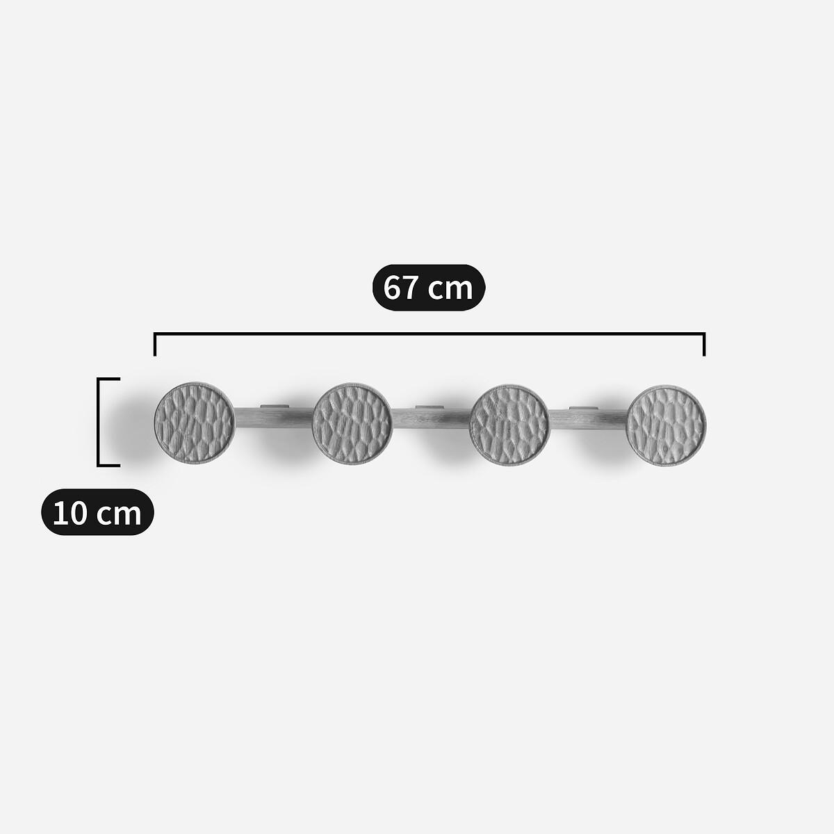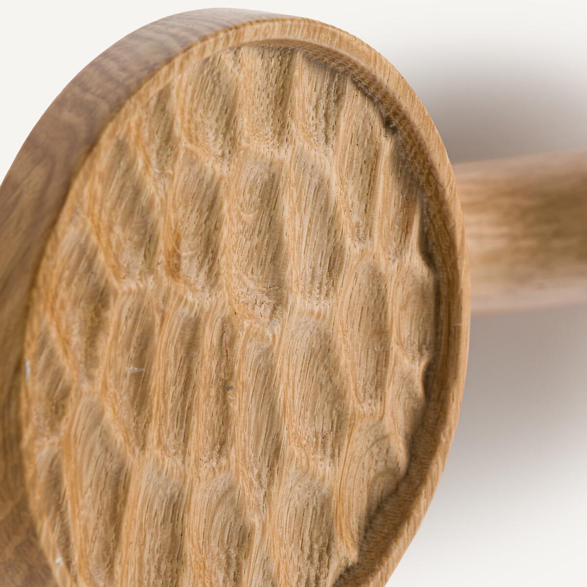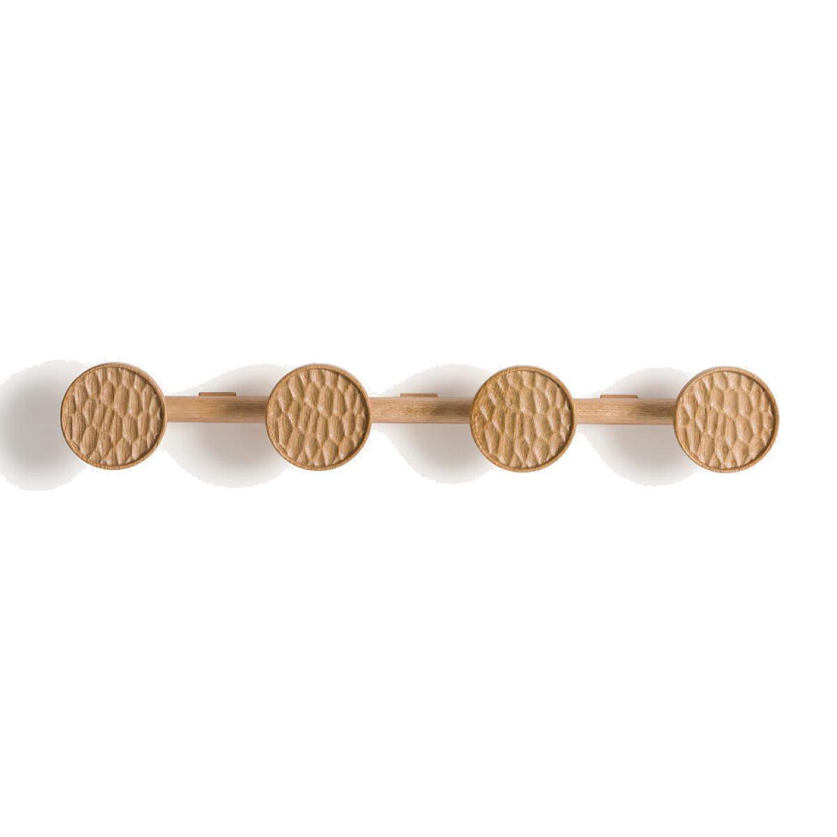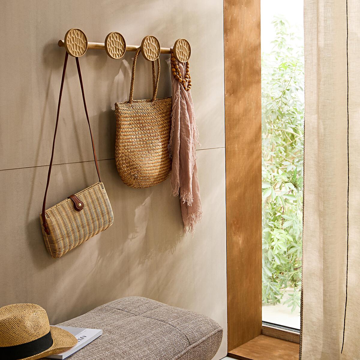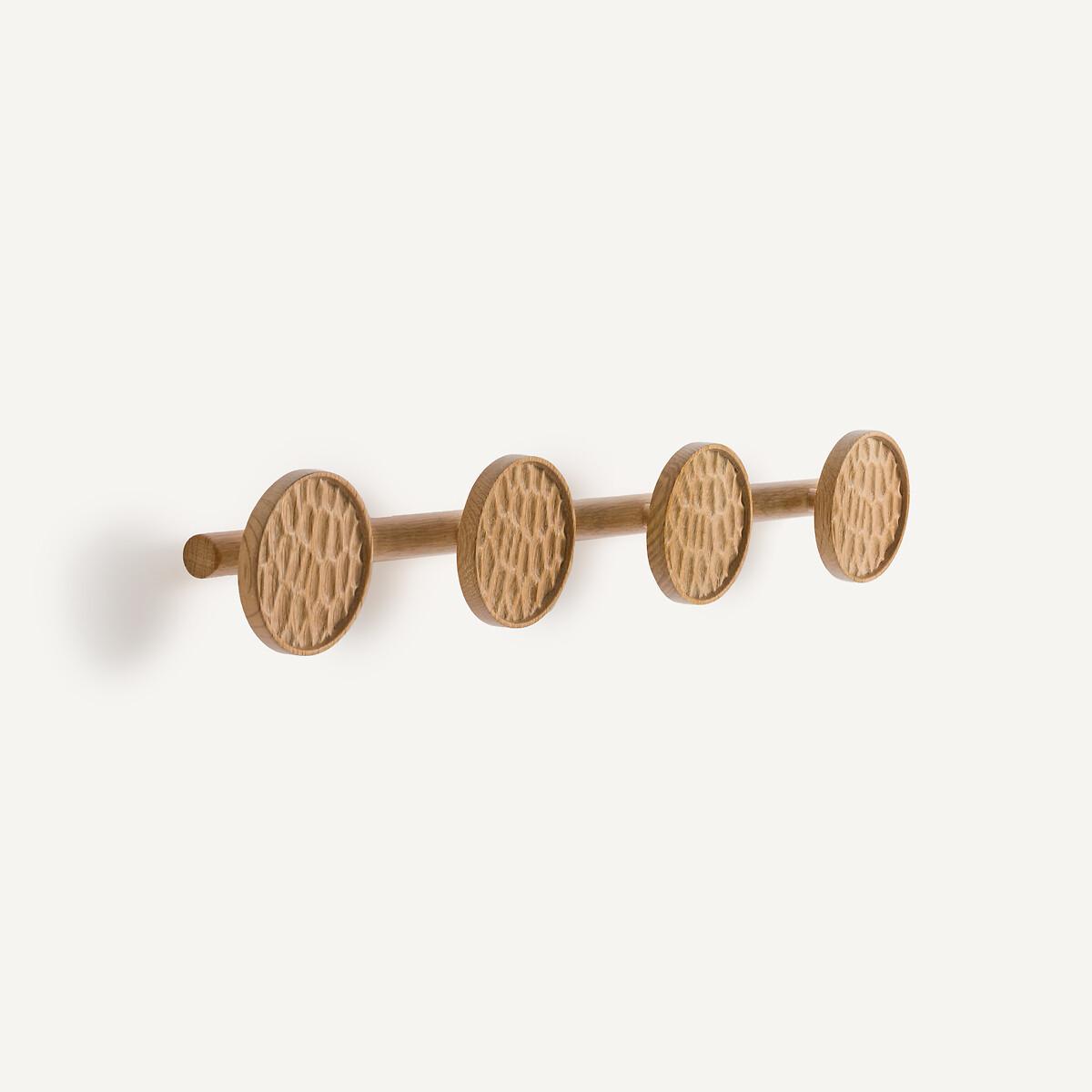 Inspired by both modern and tribal art, this coat rack is a sculptural object in its own right. In shaping wood, the asperities of the coat hooks are reminiscent of the concavities created by the gouge, a woodworking tool. A decorative and functional room. Product Details • In varnished oak • FSC® certified wood • Wall fixings in travertine and metal (zinc alloy) with antique brass paint finish • To be fixed to the wall (screws and plugs not supplied)Dimensions • Width: 67cm • Height: 10cm • Depth: 8cm • Coat hook diameter : 10cm • WOOD FROM SUSTAINABLY MANAGED FORESTS. FSC® certified wood comes from forests that are environmentally, socially and economically well managed. Dimensions and weight of parcel • 1 parcel • W73 x H14 x D16cm. 0.8kg