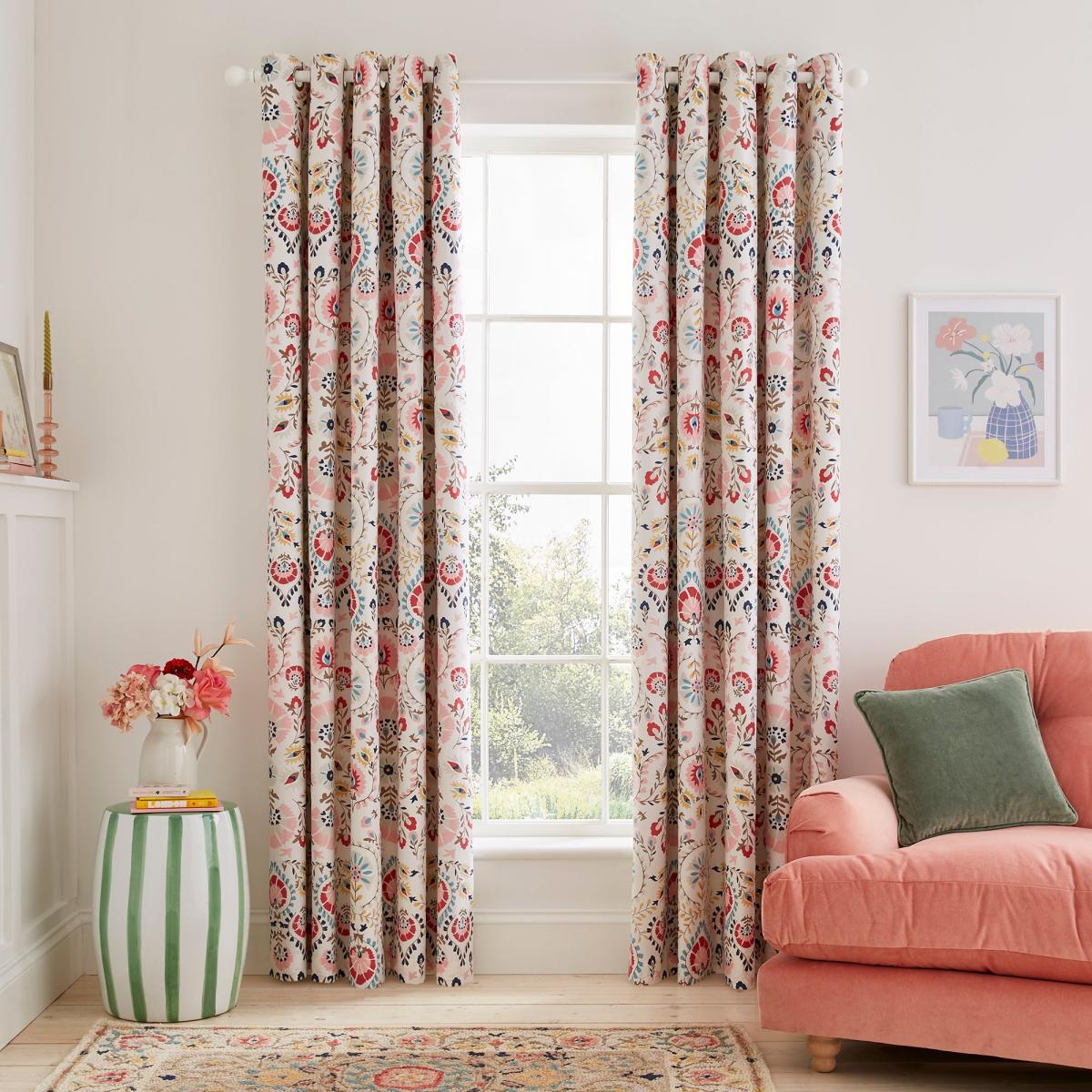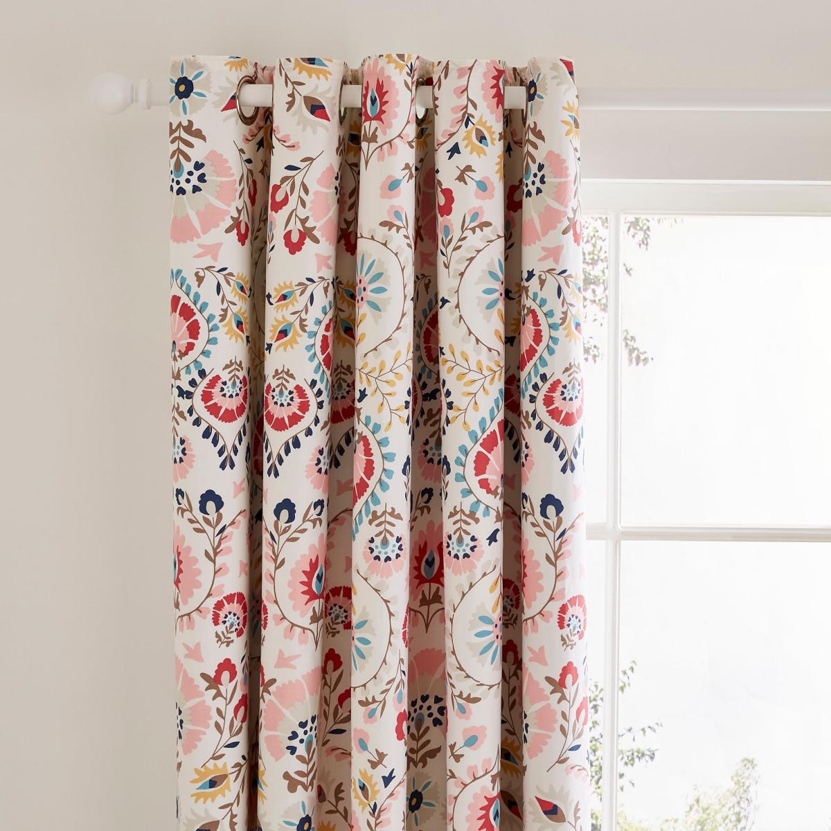 * Includes 2 x Panels* Breathable and enduring 100% Cotton composition* Floral design* Microfibre Blackout lining* Dry clean only* Corresponding items available Add a touch of boho chic to your bedroom with the eye catching Hani curtains. The modern floral design is perfect for creating a relaxed, stylish atmosphere. Made from 100% cotton, these curtains are super durable, offering a beautiful elegant drape. The microfibre blackout lining provides superior light control, making them ideal for any bedroom. Available in three sizes, these curtains are dry clean only and require minimal ironing. Enhance your decor with our coordinating bedding items.
